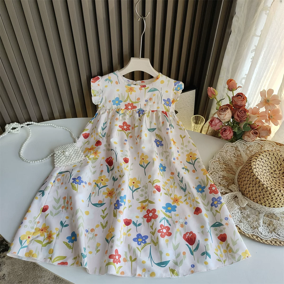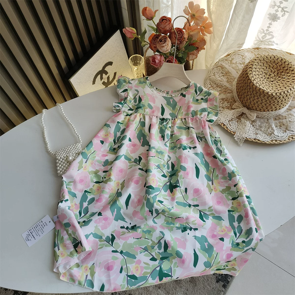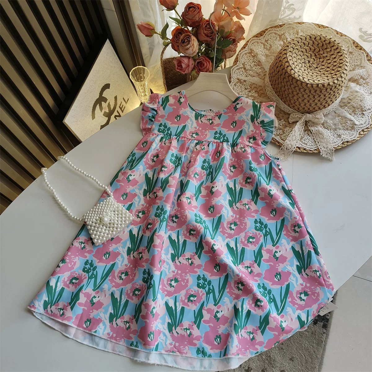 2025 Summer Girls Little Fly Sleeve Dress Baby Girl One Year Old Vest Dress Round Neck Short Sleeve Floral Pastoral Dress