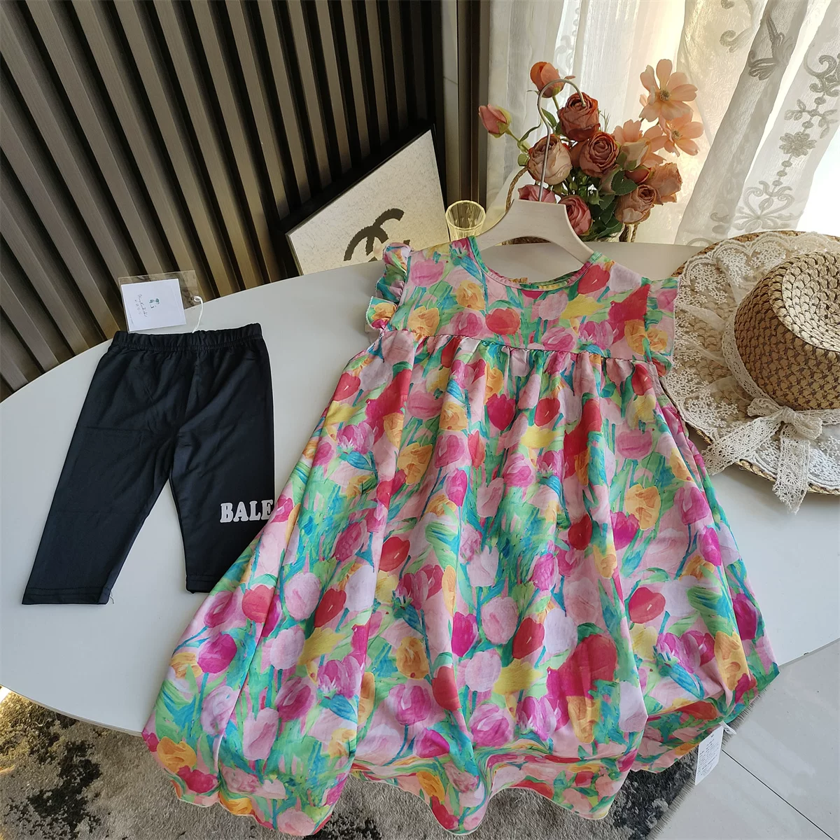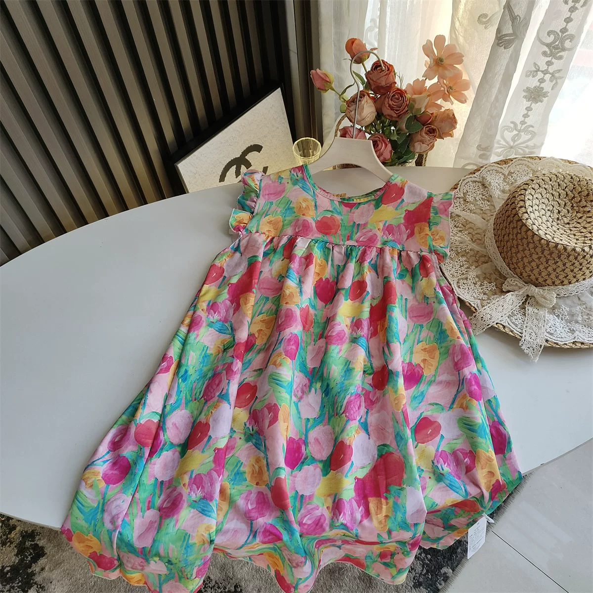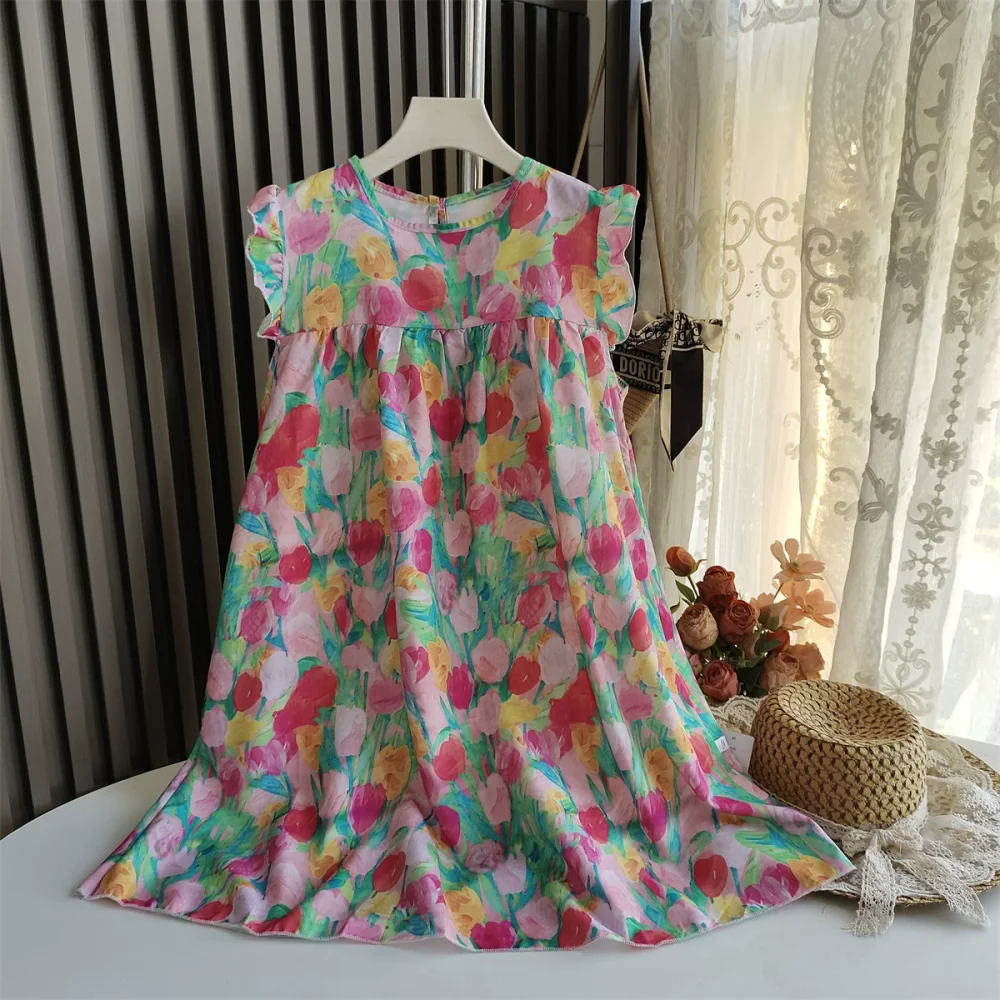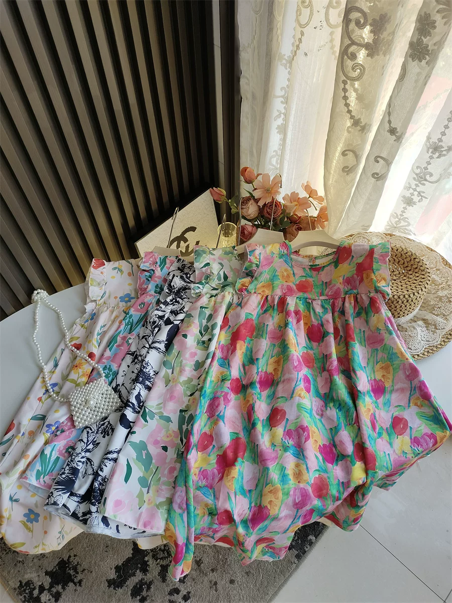 2025 Summer Girls Little Fly Sleeve Dress Baby Girl One Year Old Vest Dress Round Neck Short Sleeve Floral Pastoral Dress