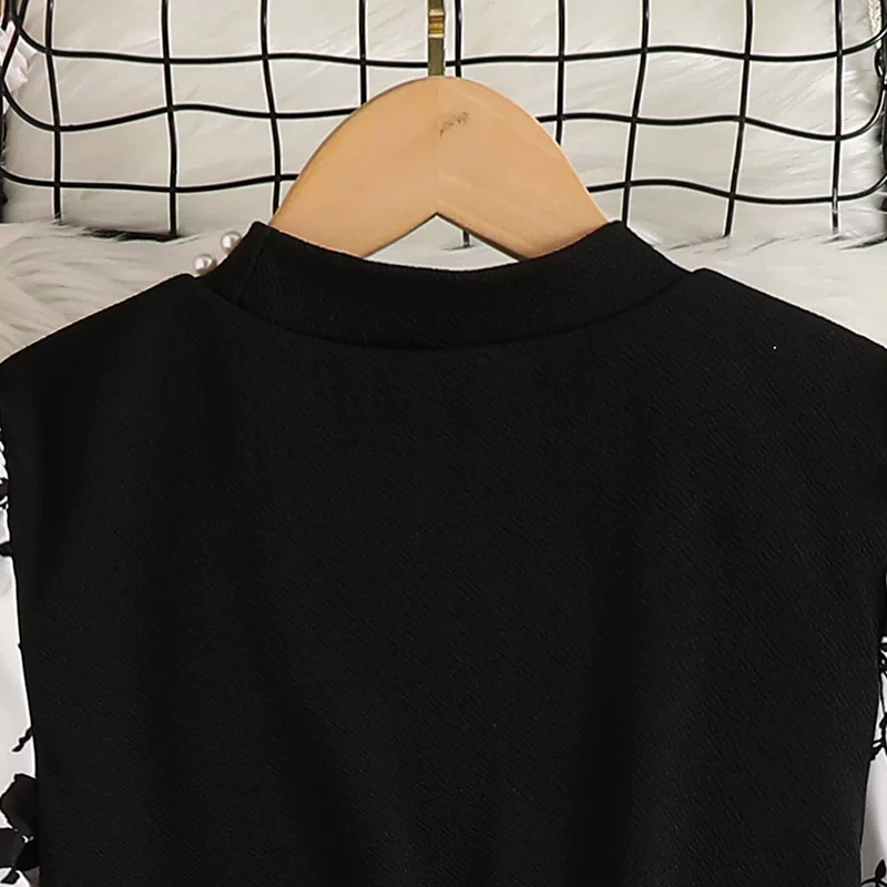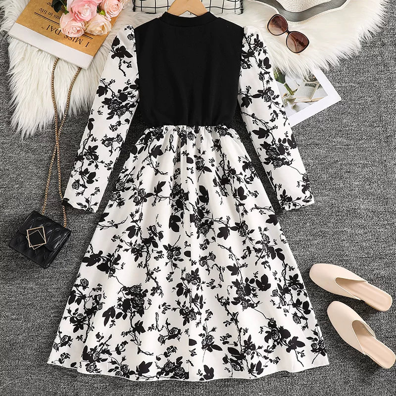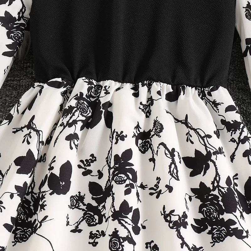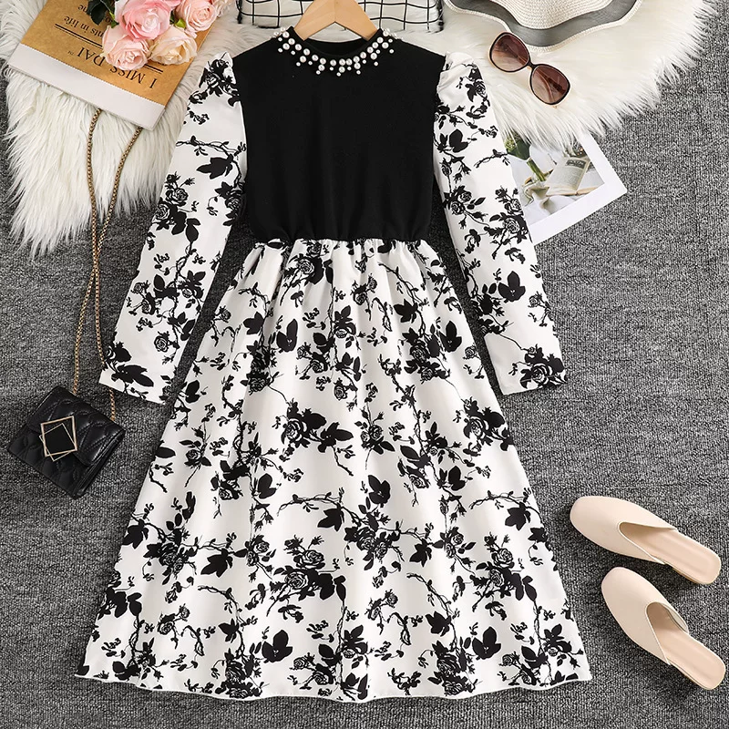 8-12-year-old girls dress 2025 autumn new European and American style beaded front collar long-sleeved printed temperament princess dress