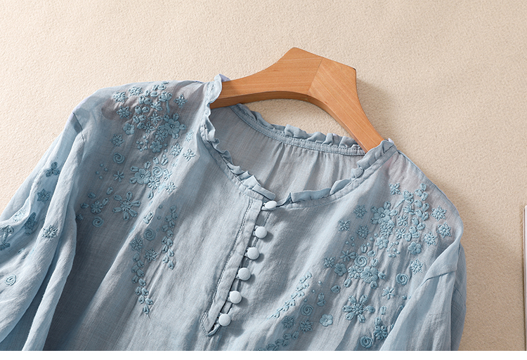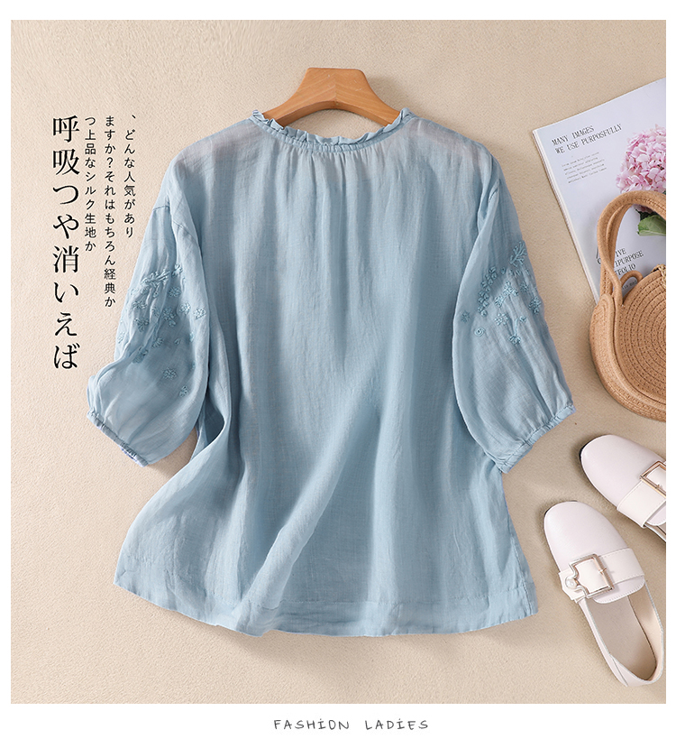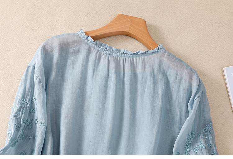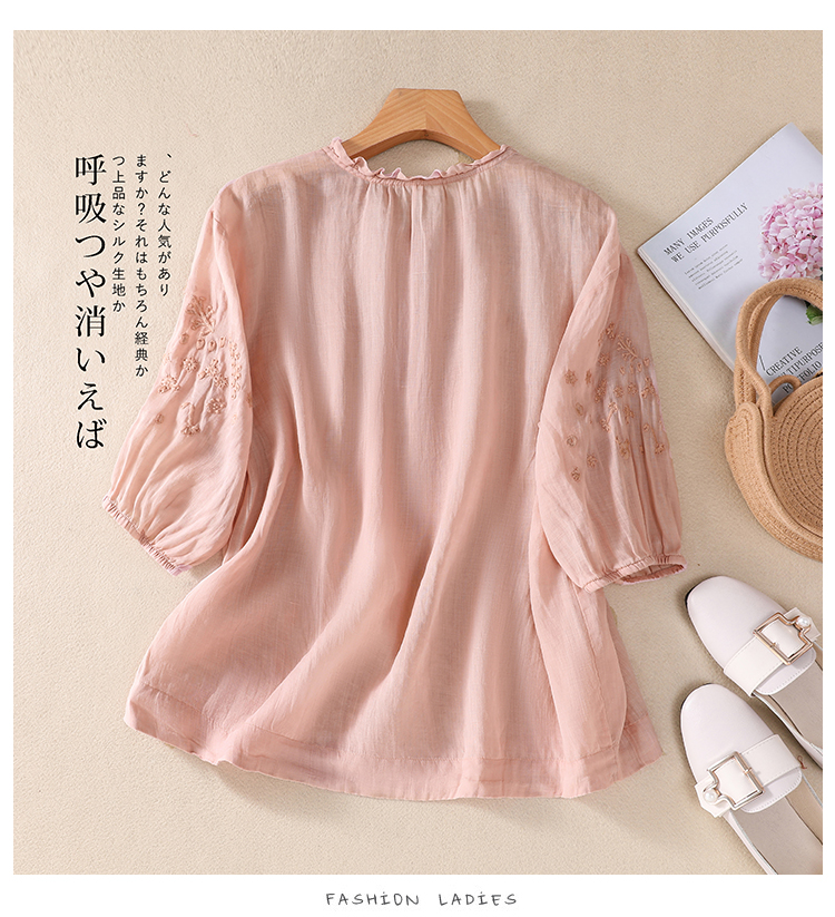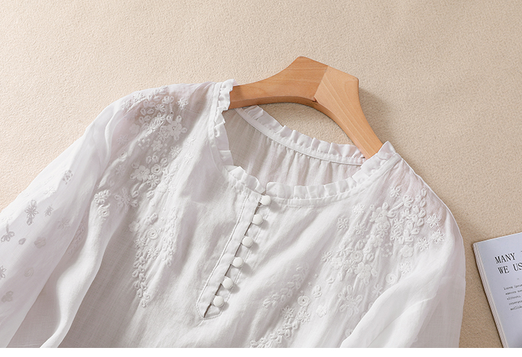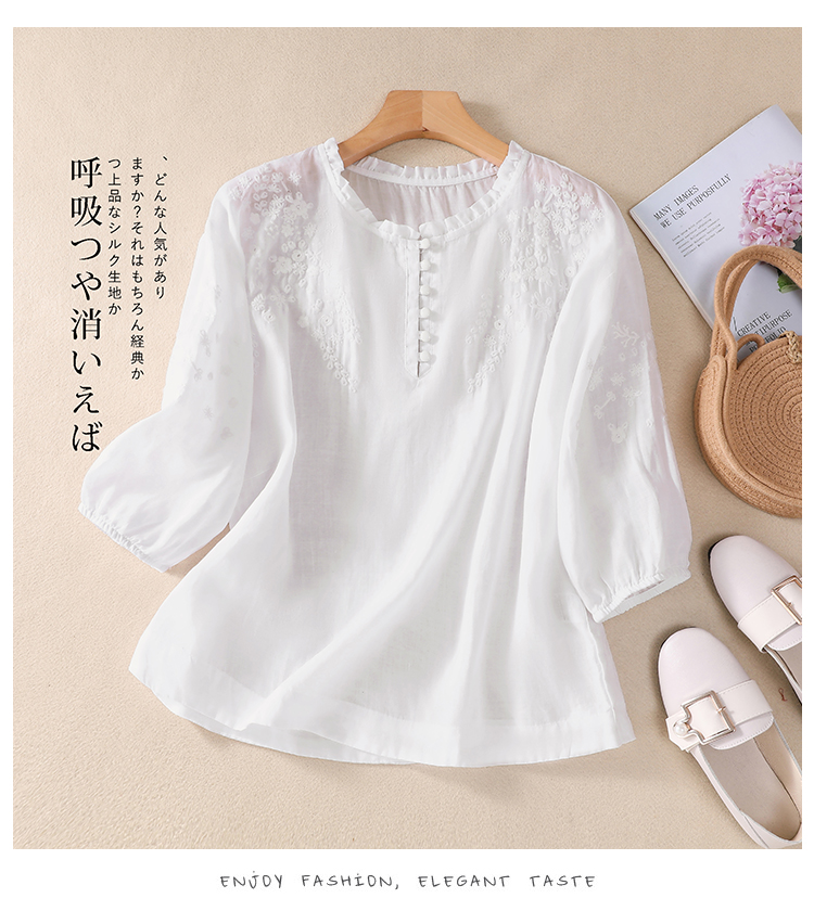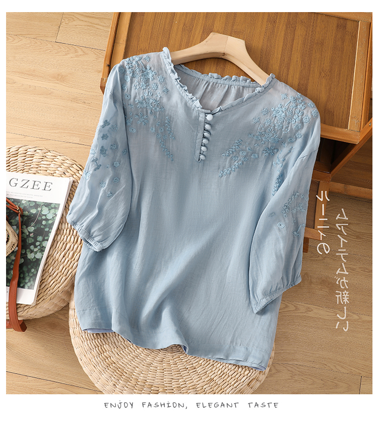 Artistic Versatile Embroidery 3/4 Sleeve Shirt Women’s Solid Color Cotton and Linen Top