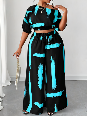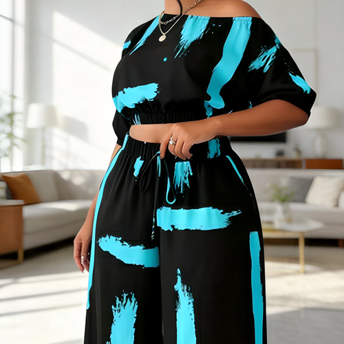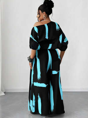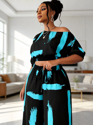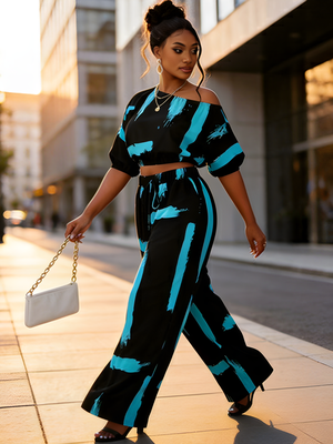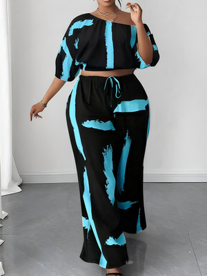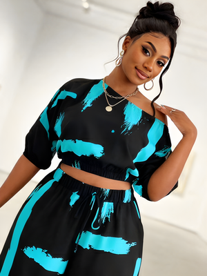 Asymmetrical Collar Printed Short Sleeve Short Style Off-shoulder T-Shirt And Loose Fit Kuo Leg Length Pants