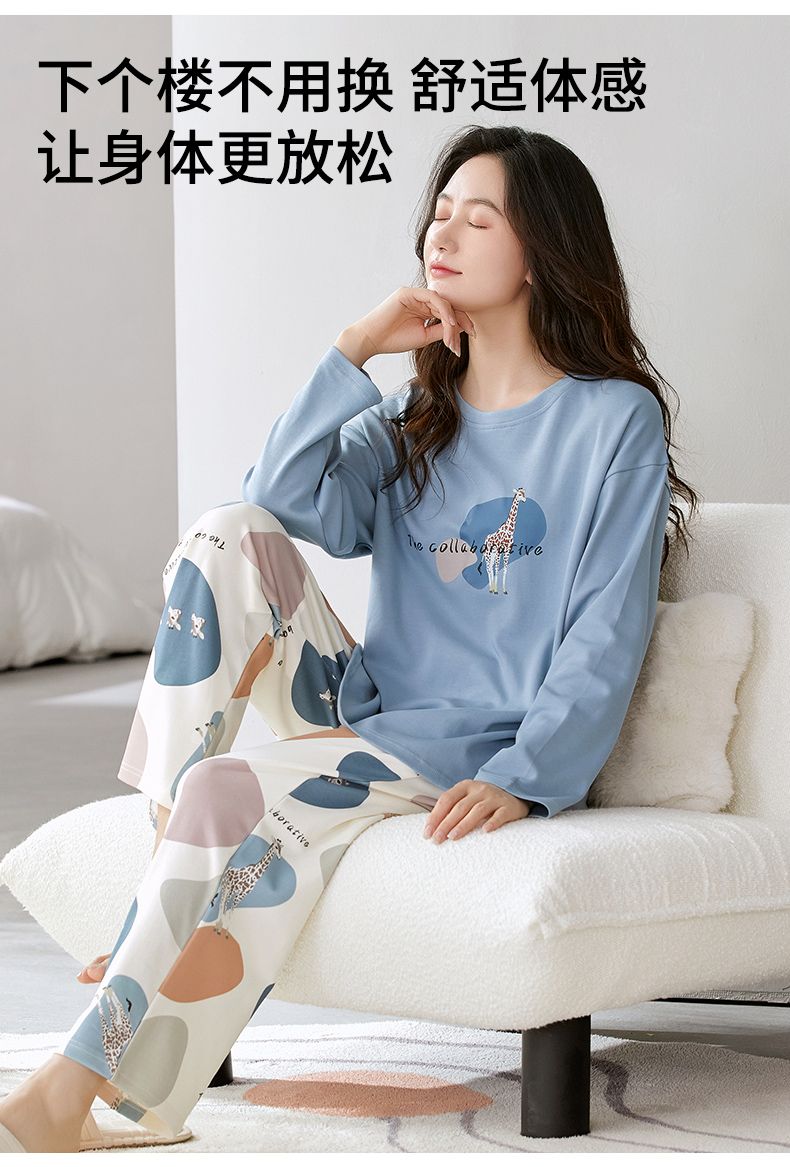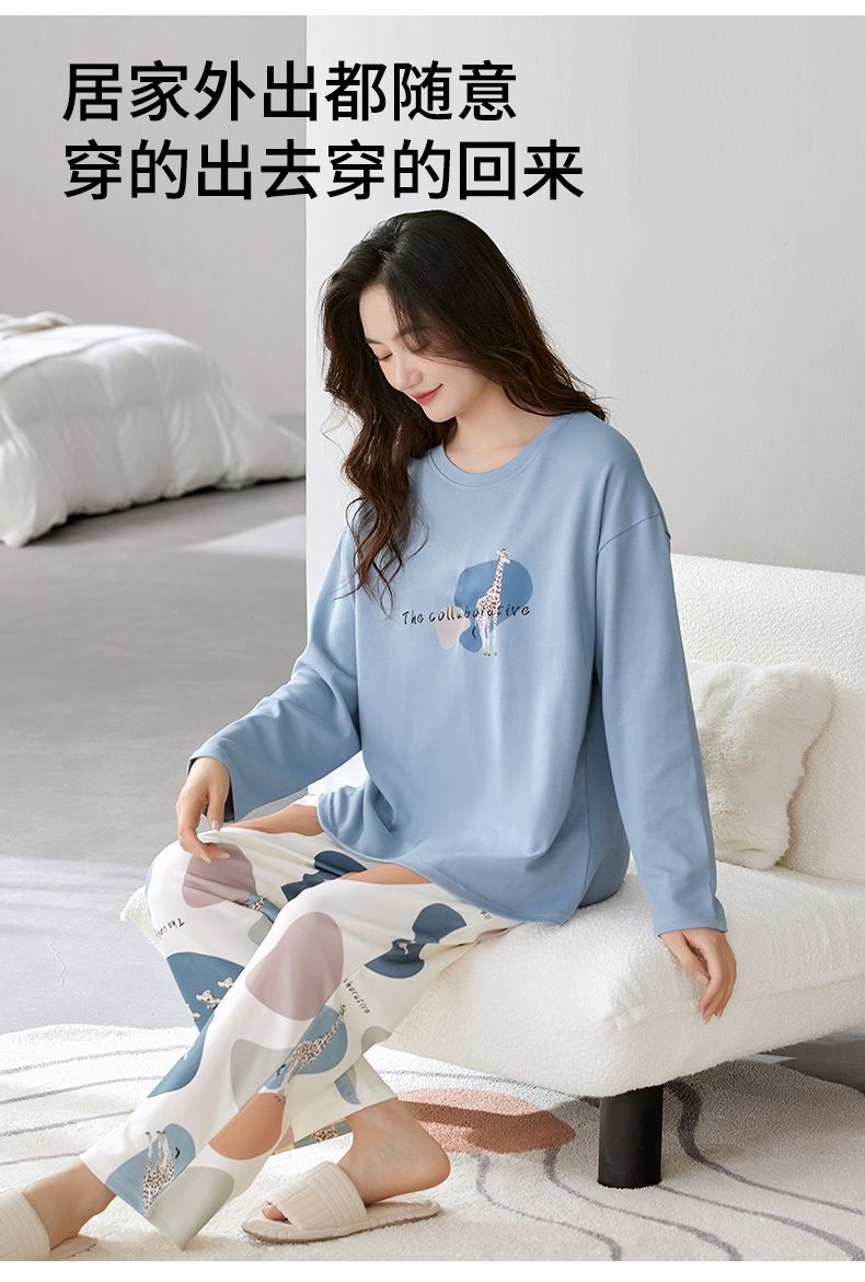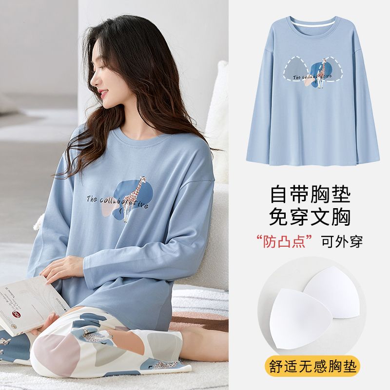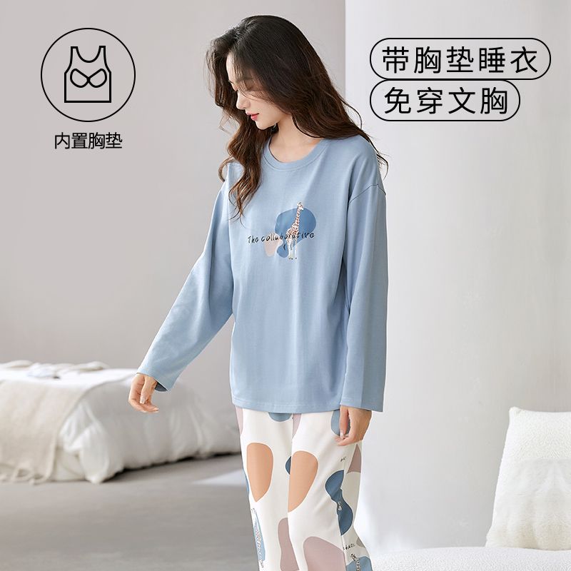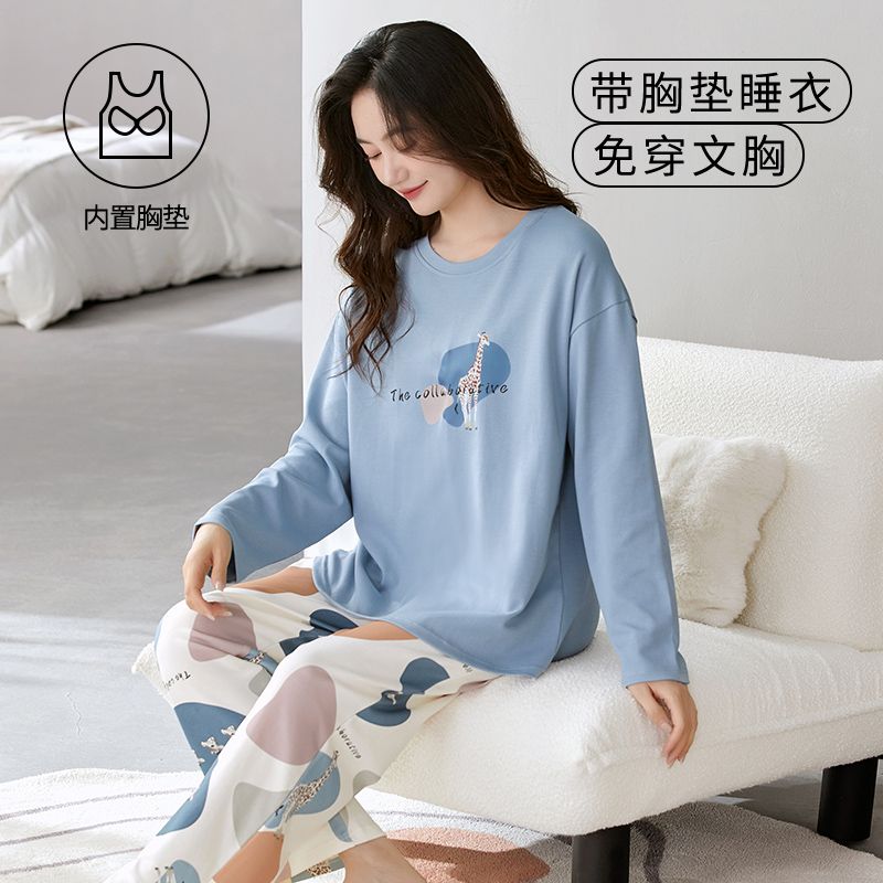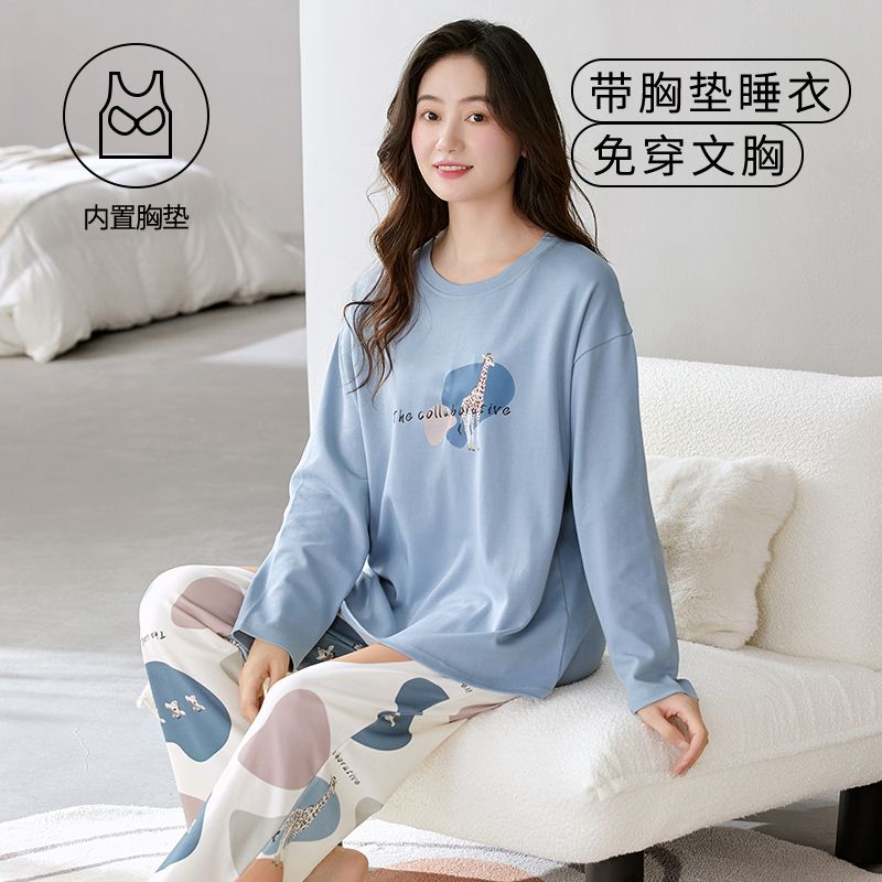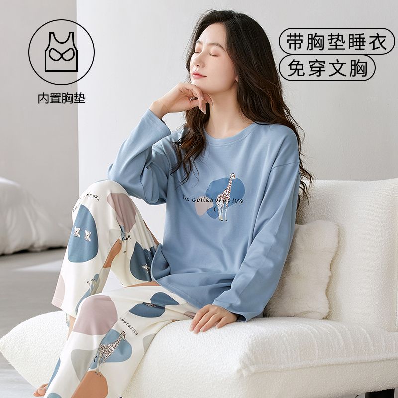 Autumn New Women’s Double Long round Neck Pull Frame Imitation Cotton with Chest Pad Pajamas