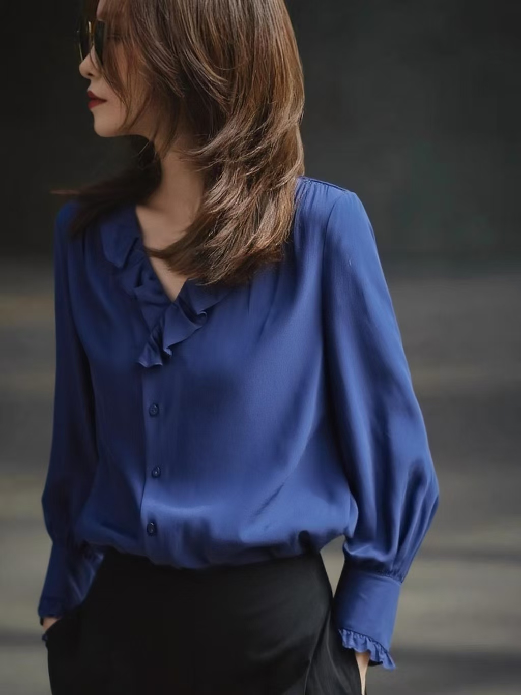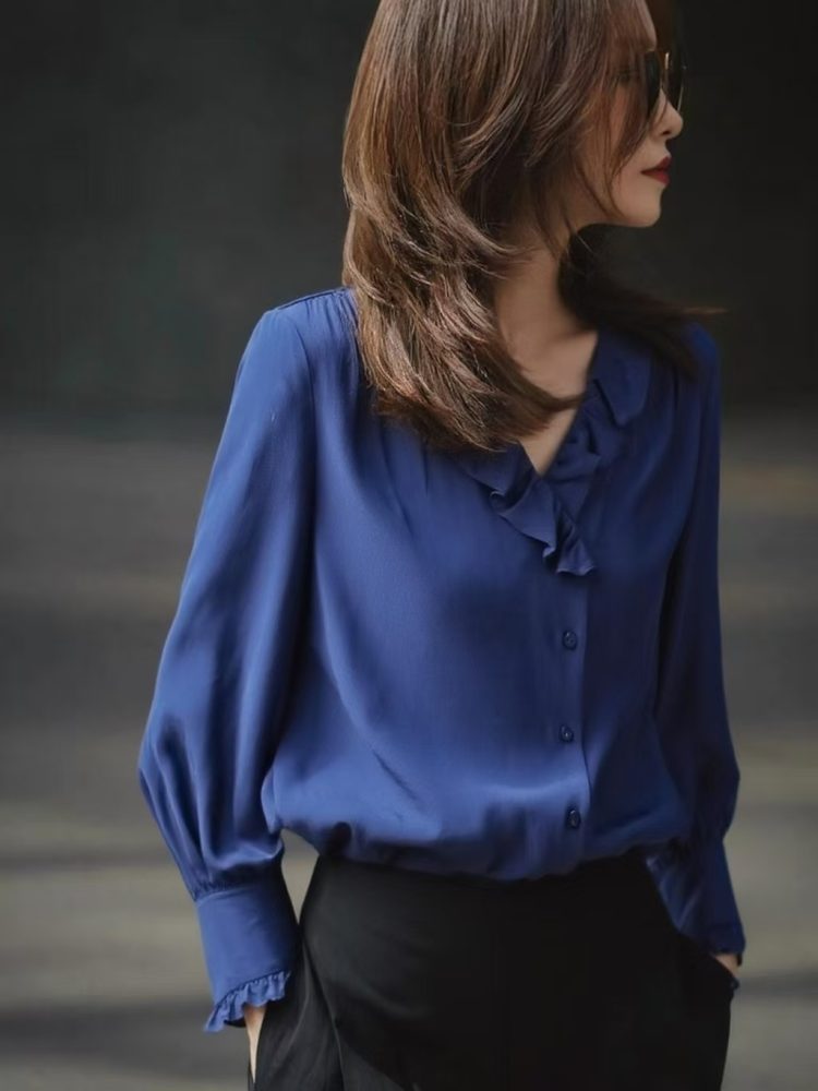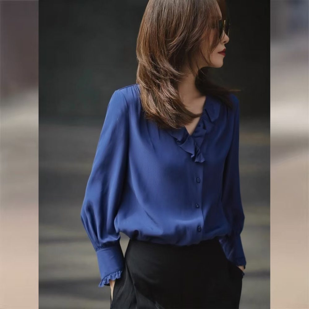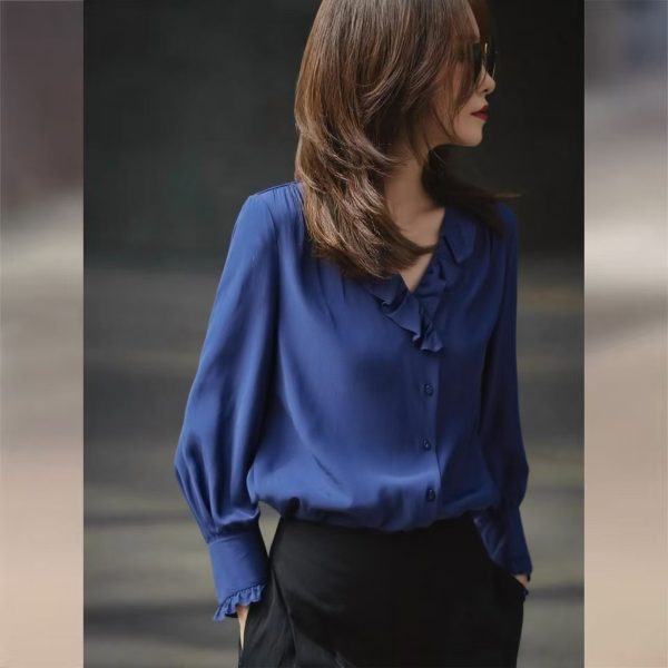 Be the first to review “Blue Long Sleeve Shirt Female Autumn New Style Ruffled Edge V Neck Unique Super Nice Shirt”