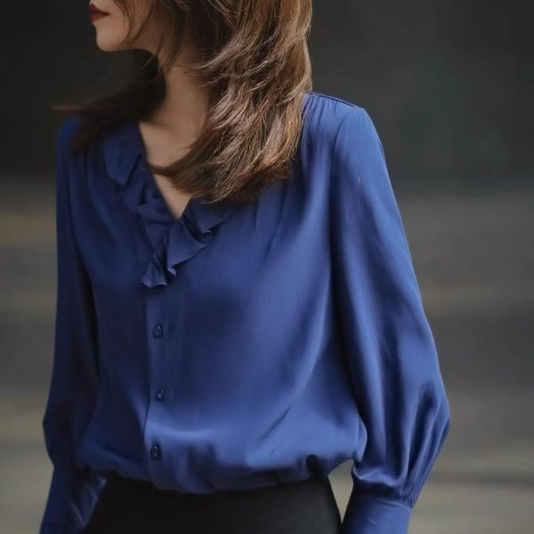 Blue Long Sleeve Shirt Female Autumn New Style Ruffled Edge V Neck Unique Super Nice Shirt