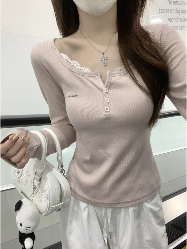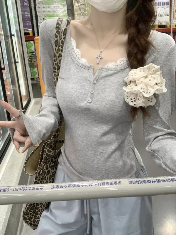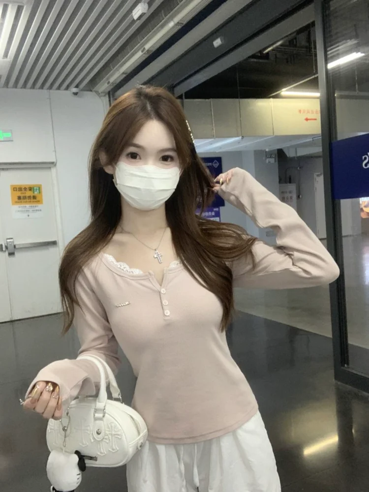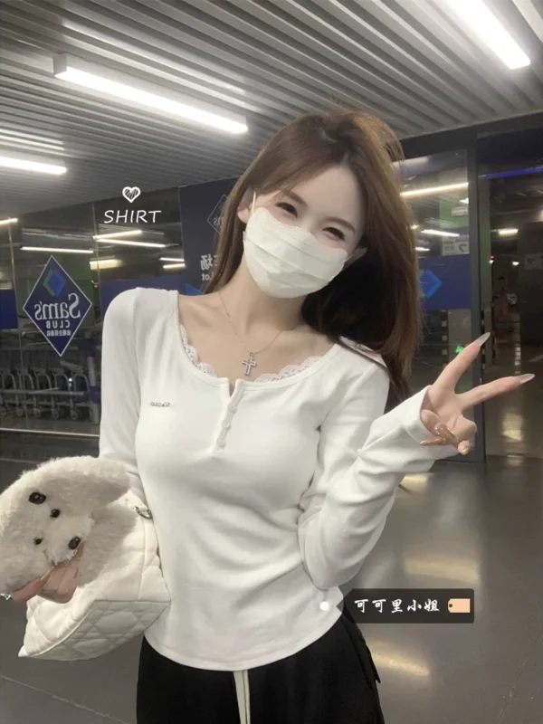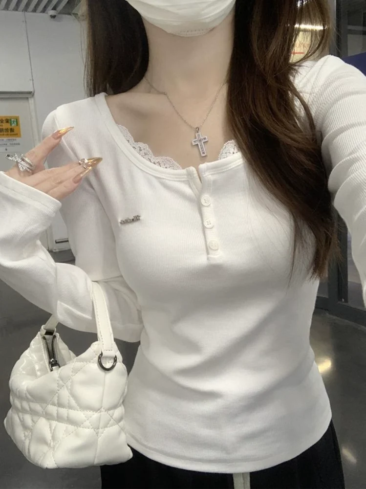 Lace Spliced Long Sleeve Shoulder T-shirt Autumn and Winter Slim Fit Bottoming Shirt White Top Women’s Clothing