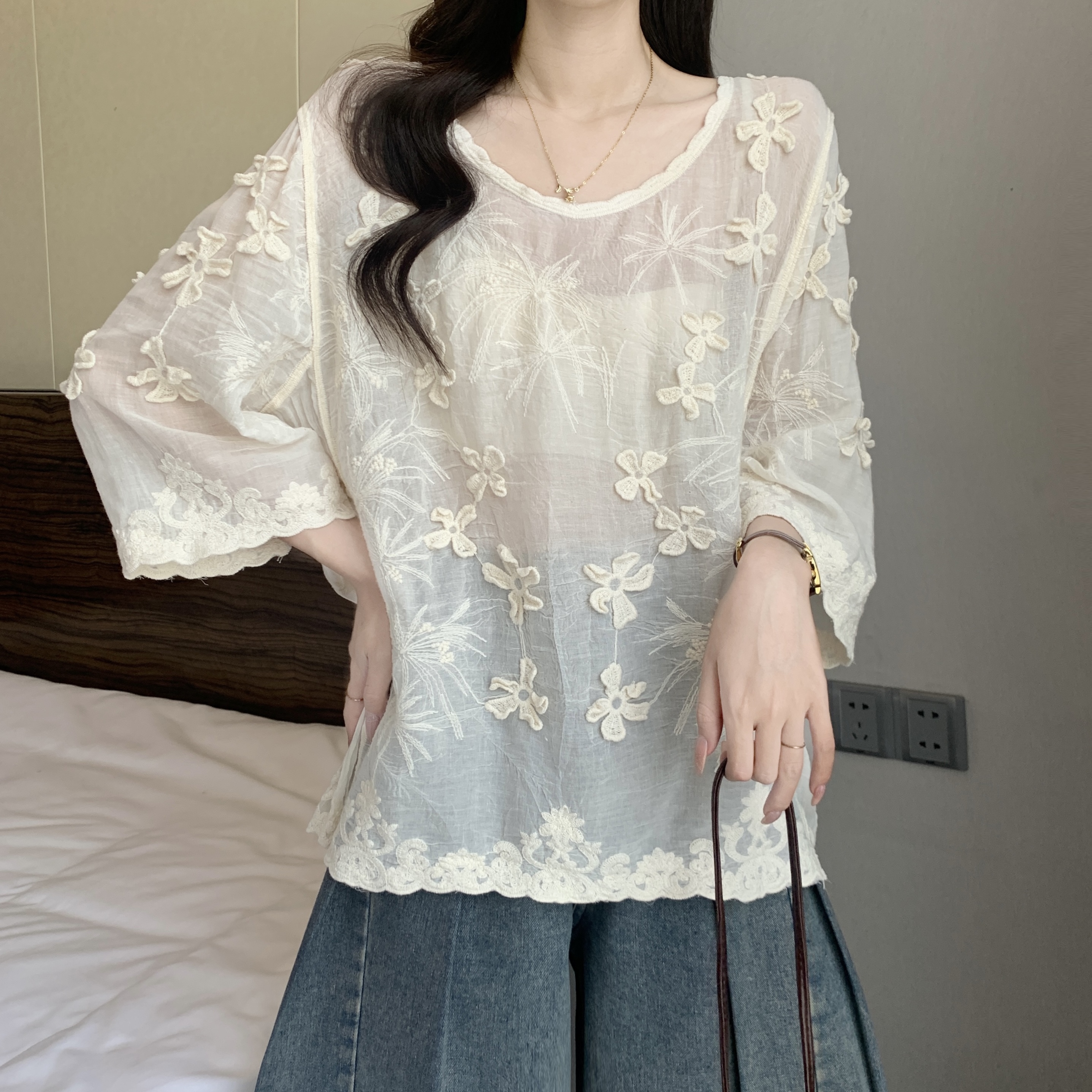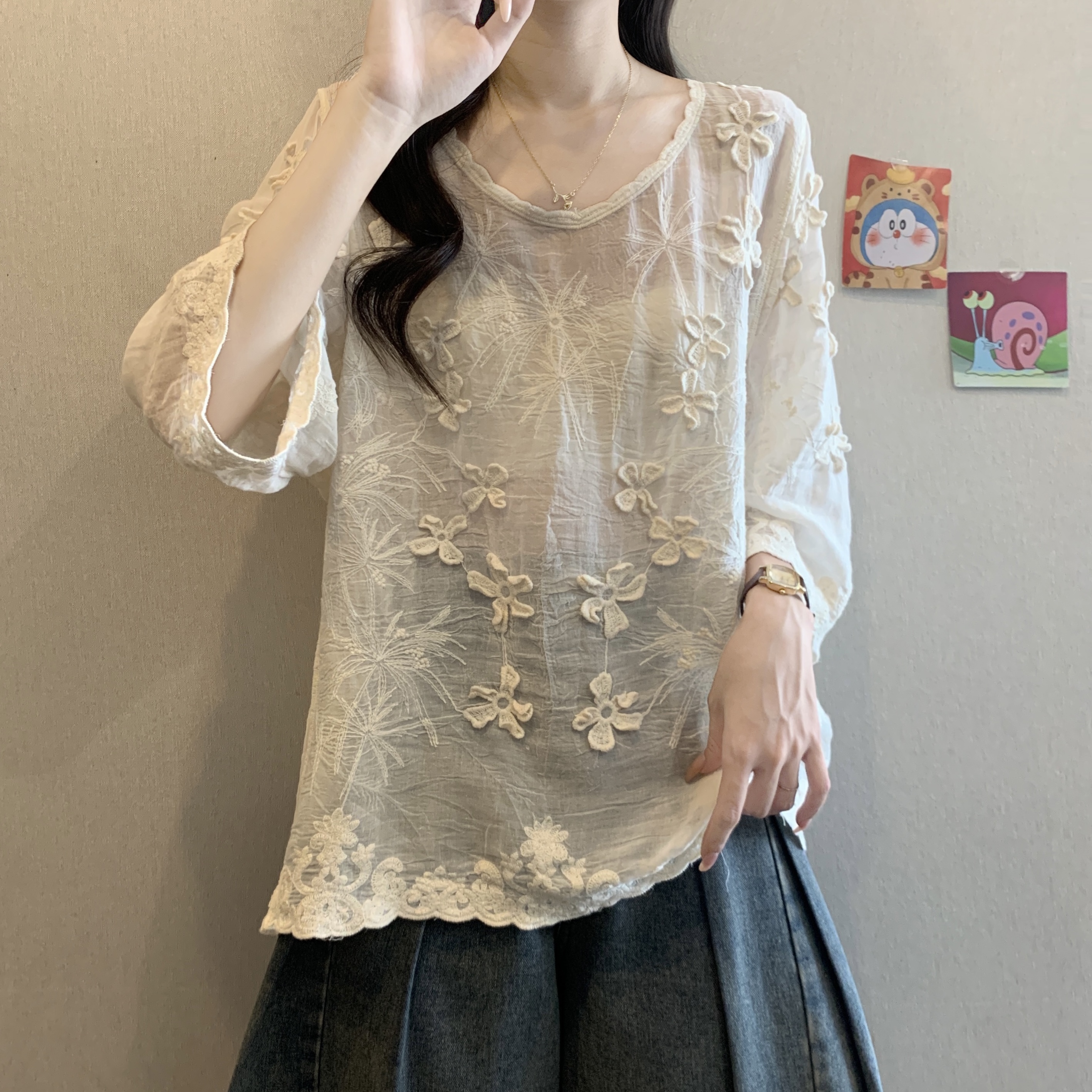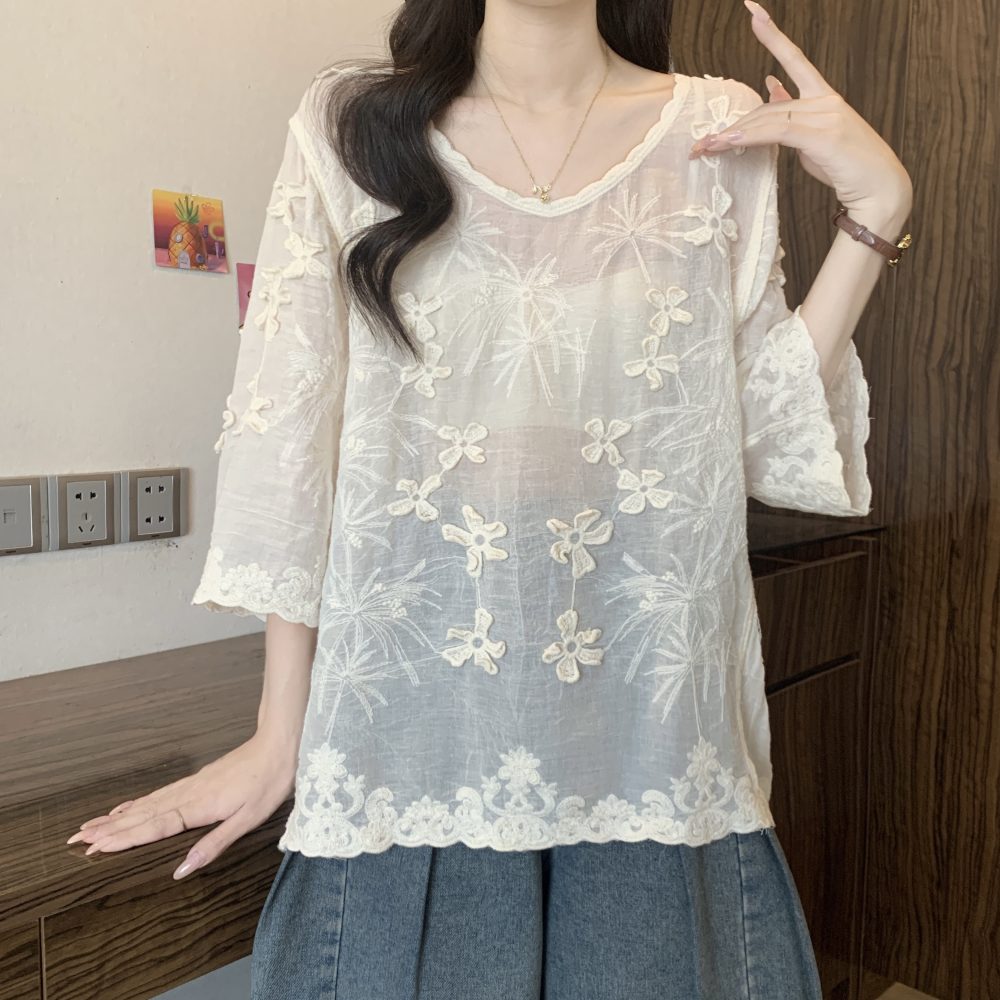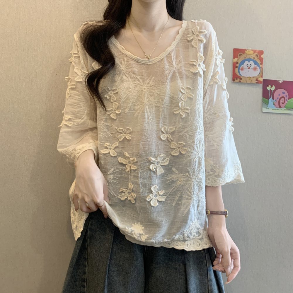French Style Stereo Flower Round Neck Short Sleeve Shirt top