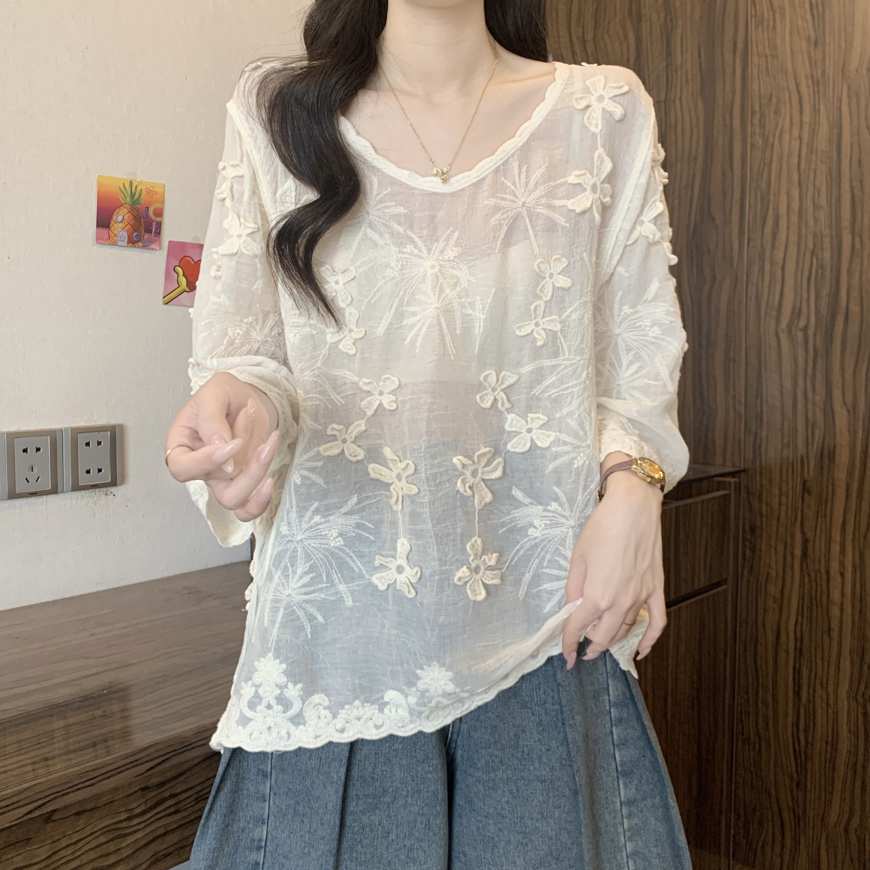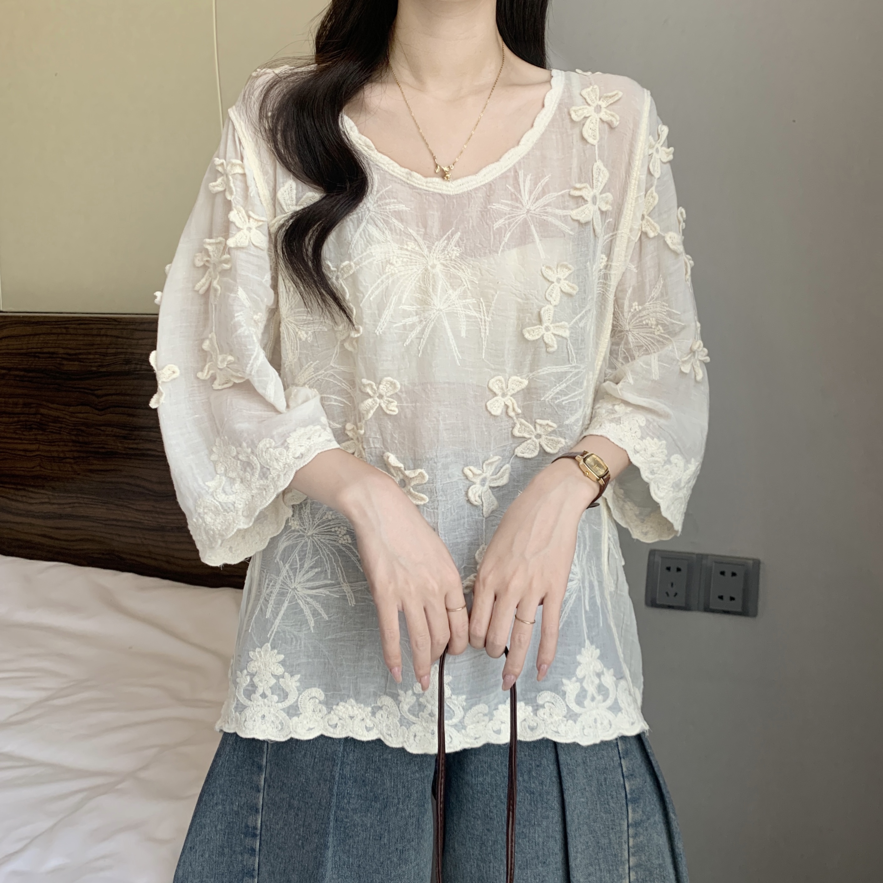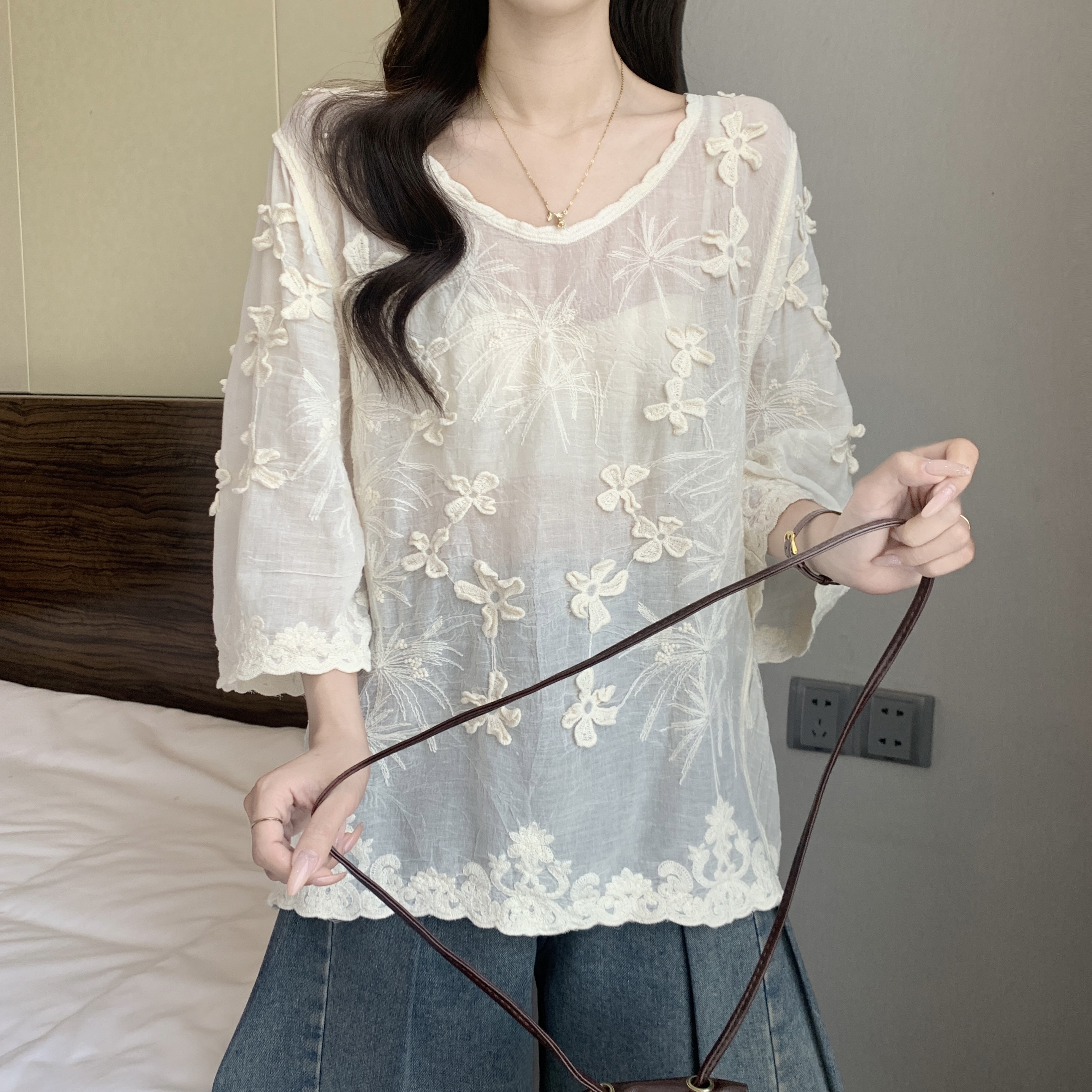 French Style Stereo Flower Round Neck Short Sleeve Shirt top