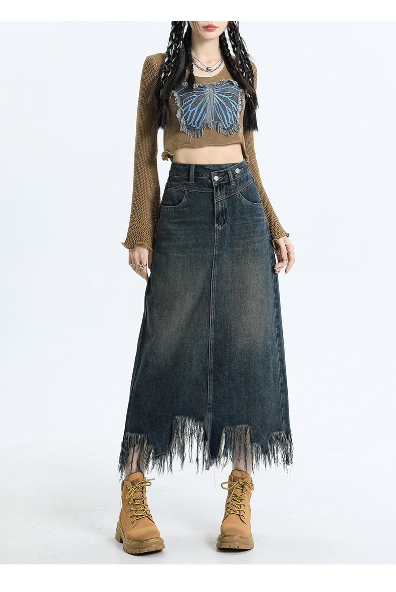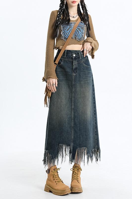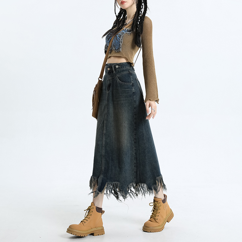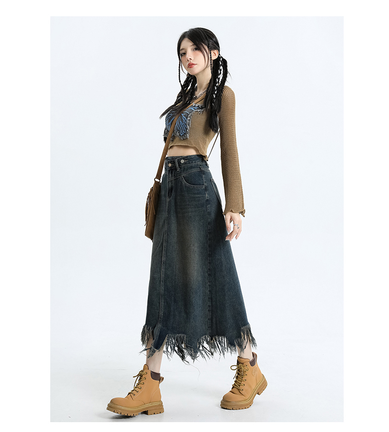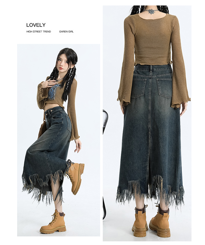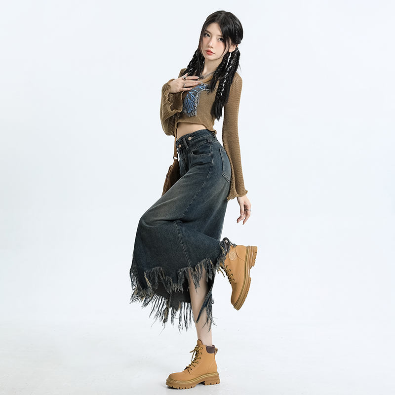 Be the first to review “High Waist Tassel Denim Loose Straight Split Long Skirt”