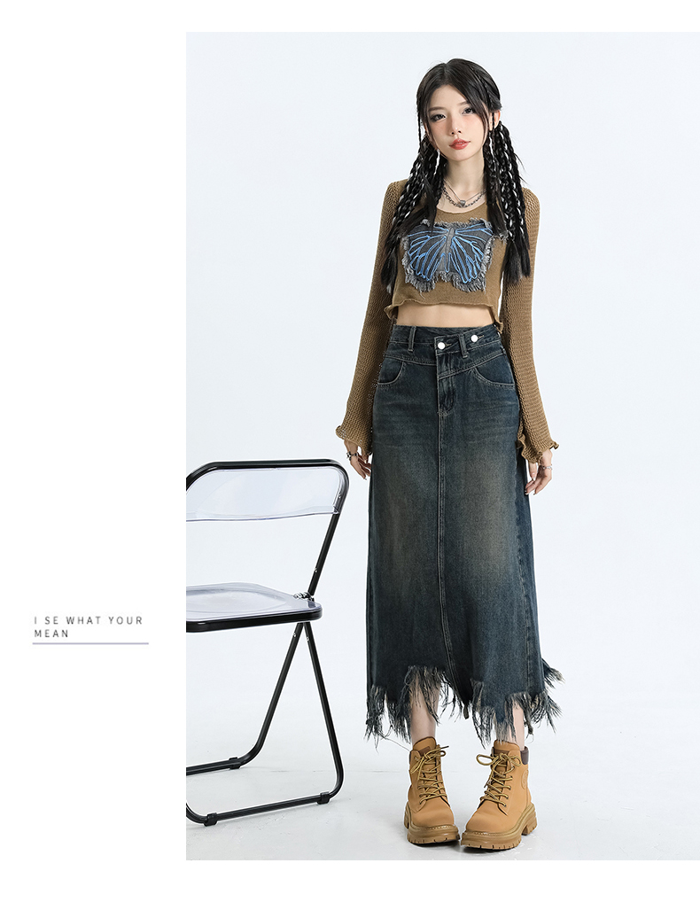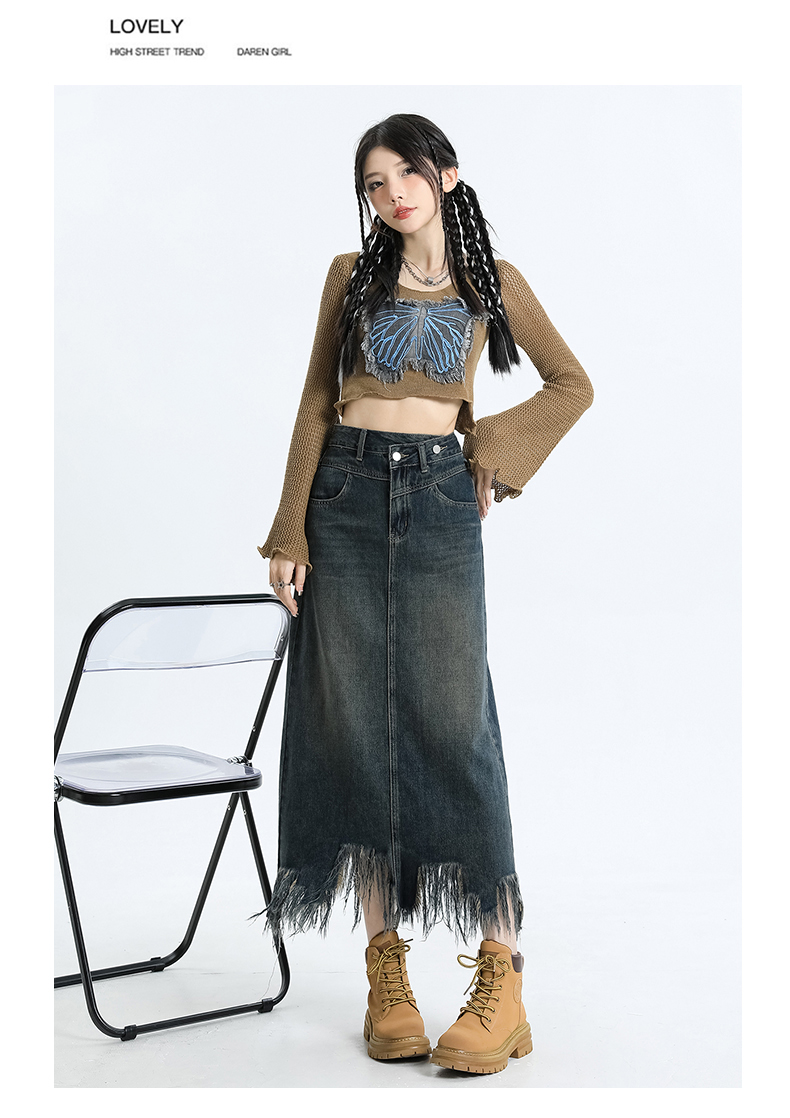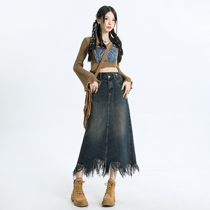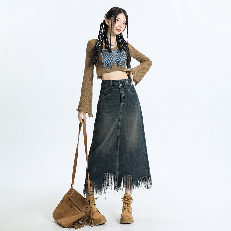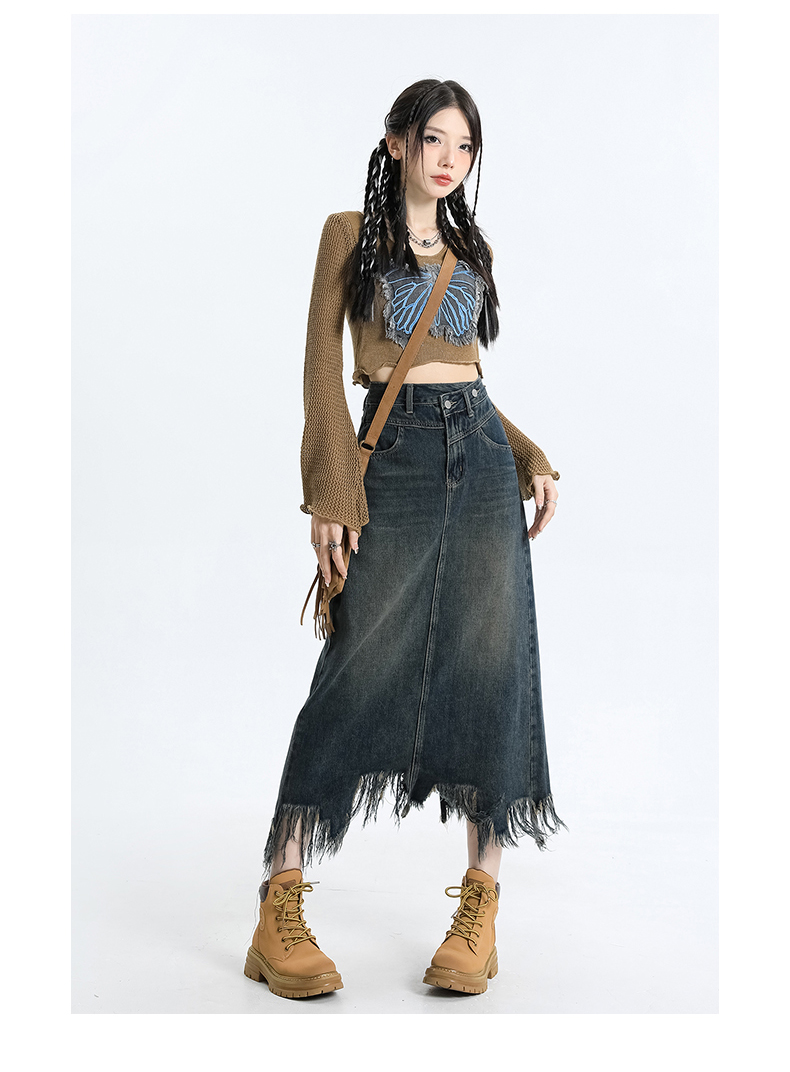 Be the first to review “High Waist Tassel Denim Loose Straight Split Long Skirt”