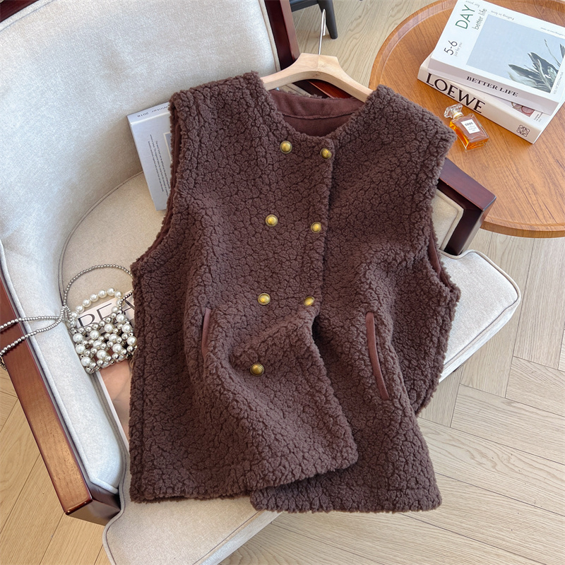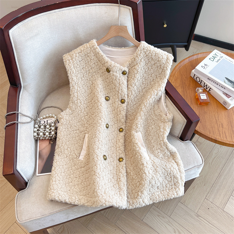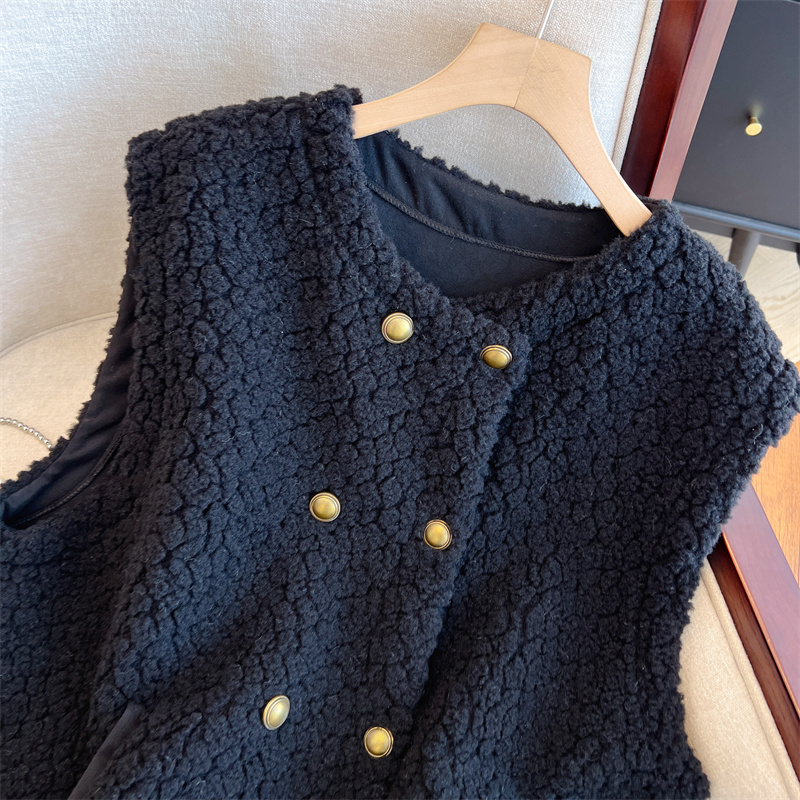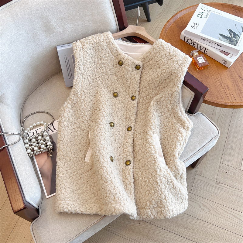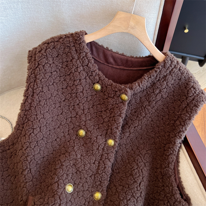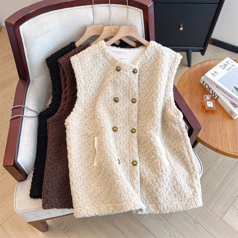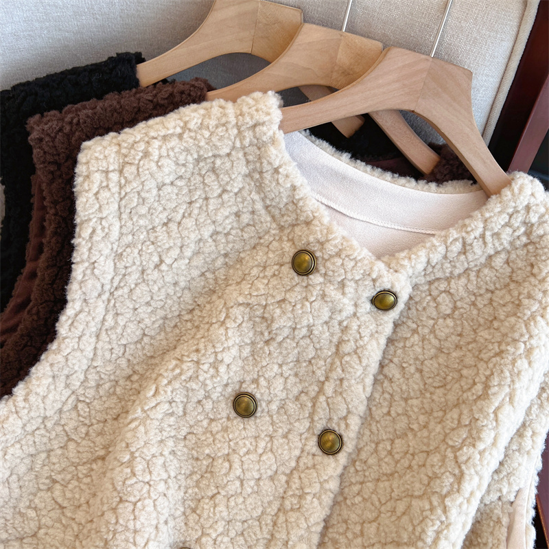 Loose Fit Slimming Double-breasted Round Neck Solid Color Thickened Warm Lamb Wool Vest