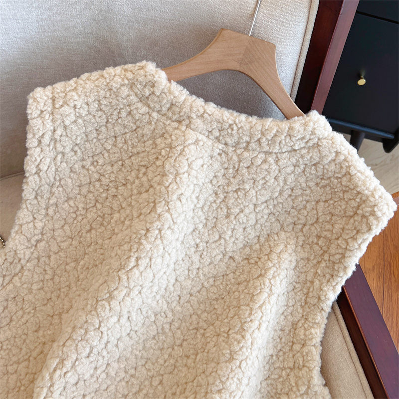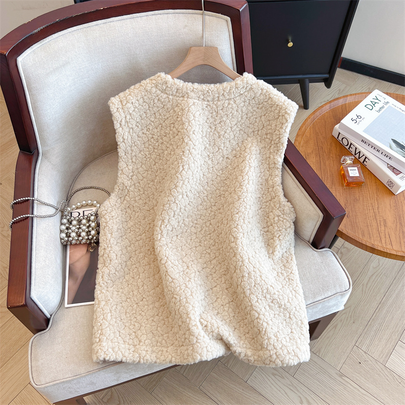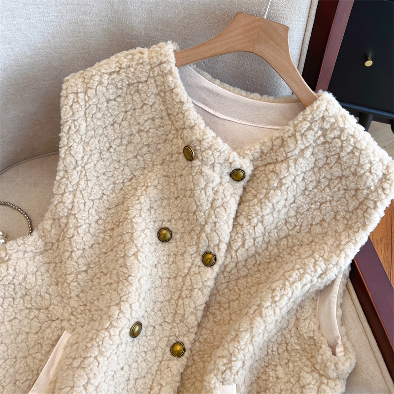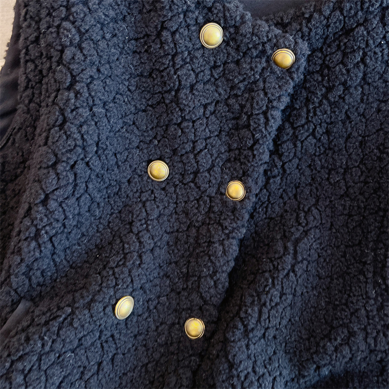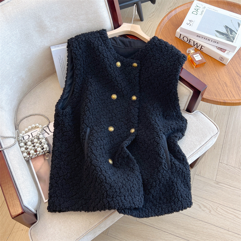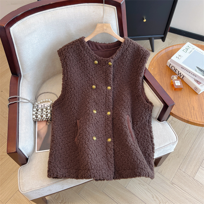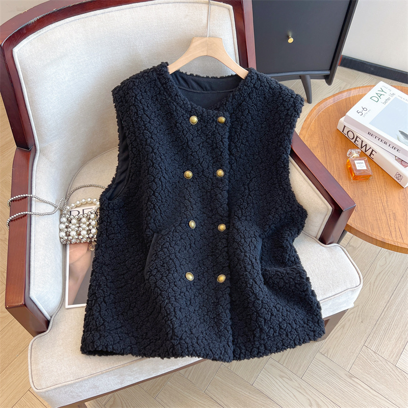Loose Fit Slimming Double-breasted Round Neck Solid Color Thickened Warm Lamb Wool Vest