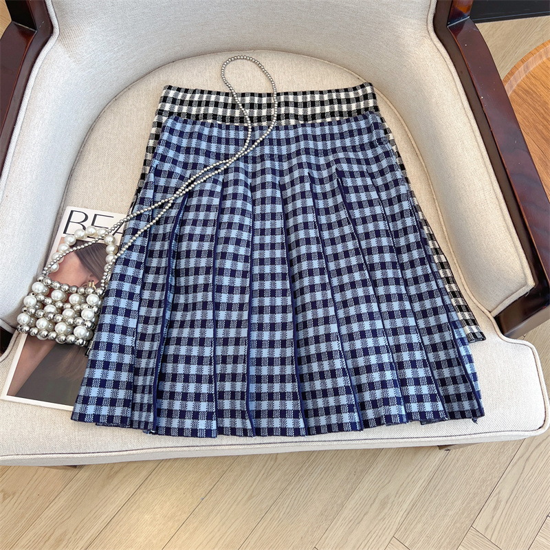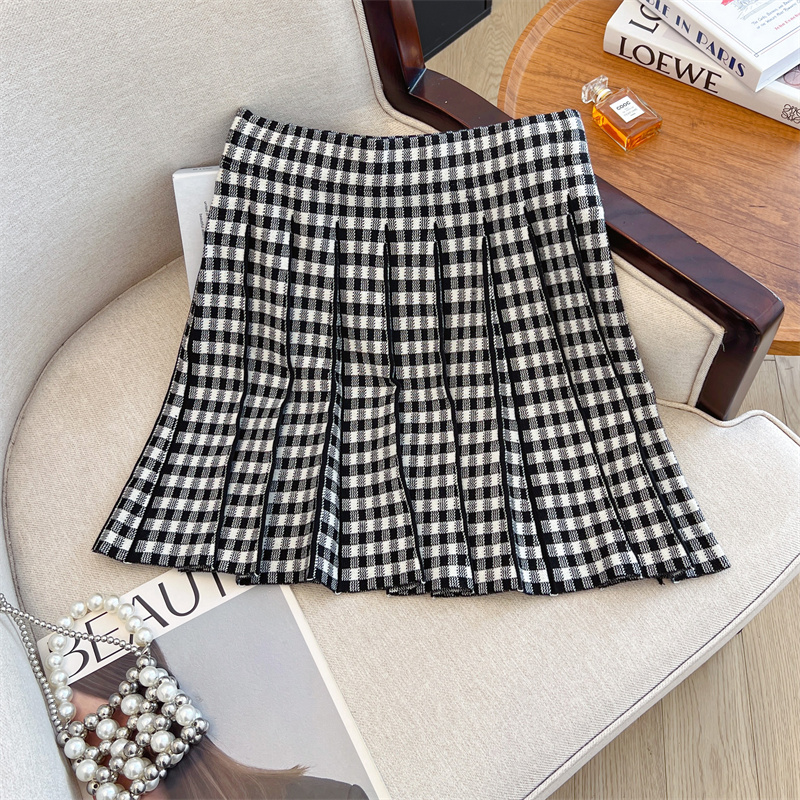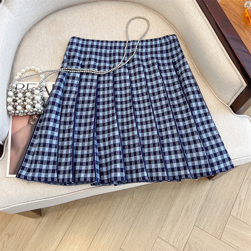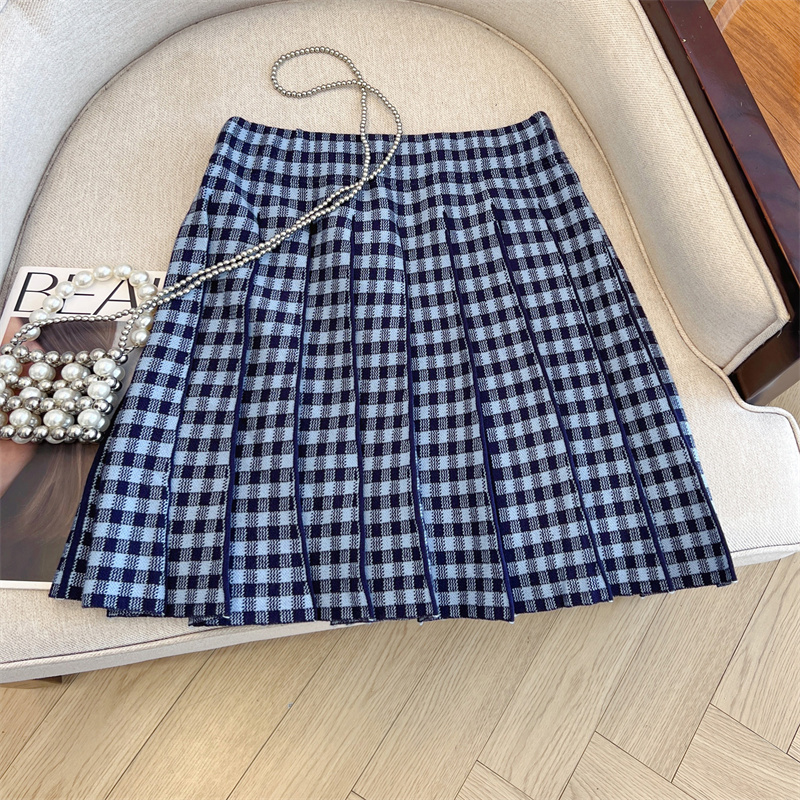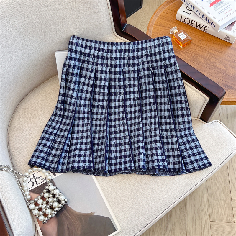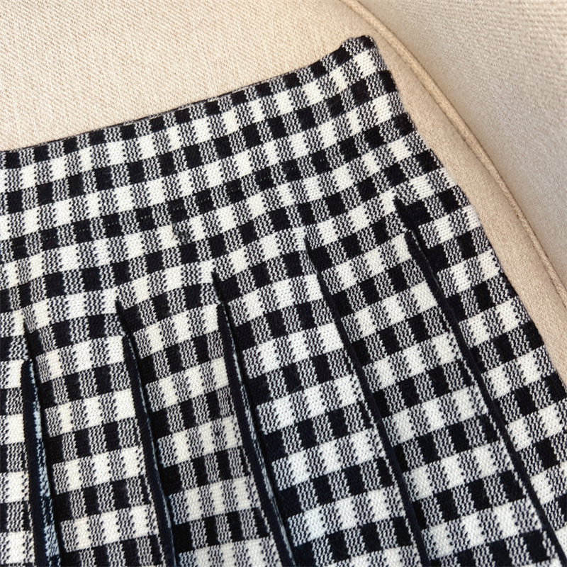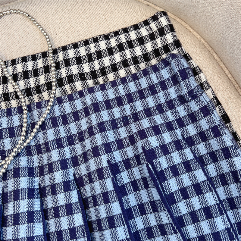 Plus Size Women High Waist Half-length Skirt Knit Slimming Short Skirt Plaid Pleated Skirt