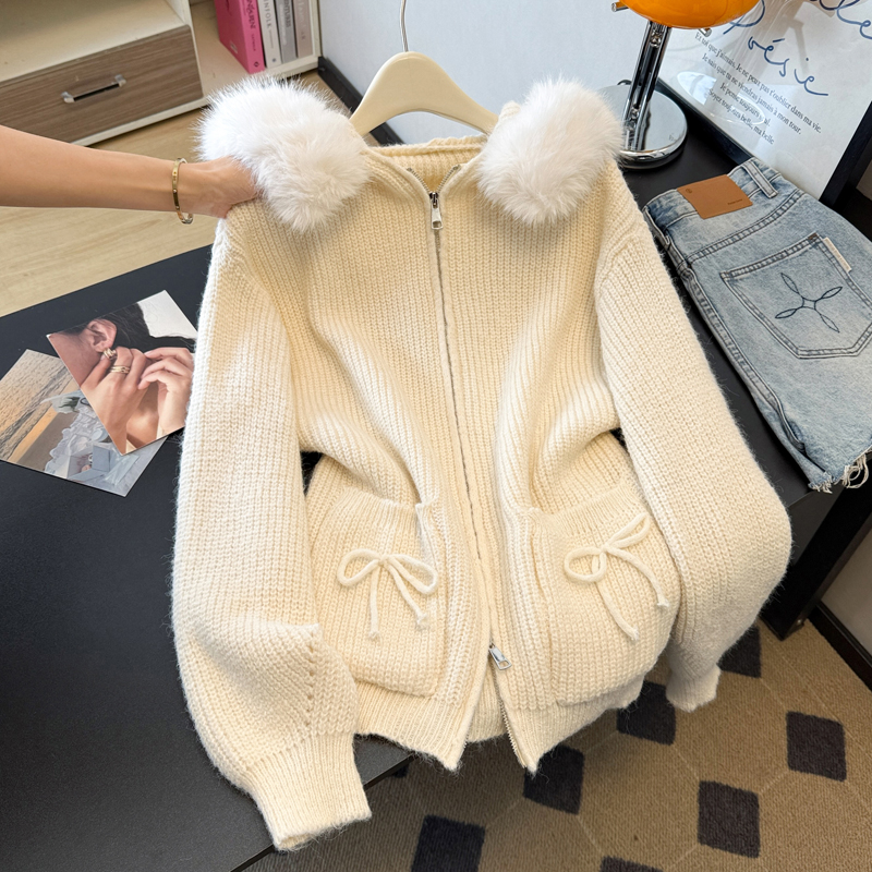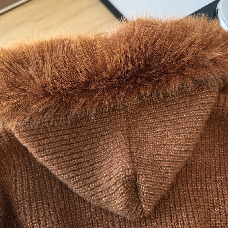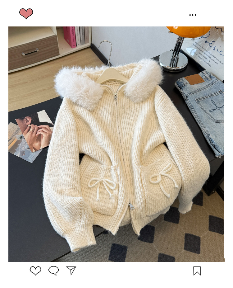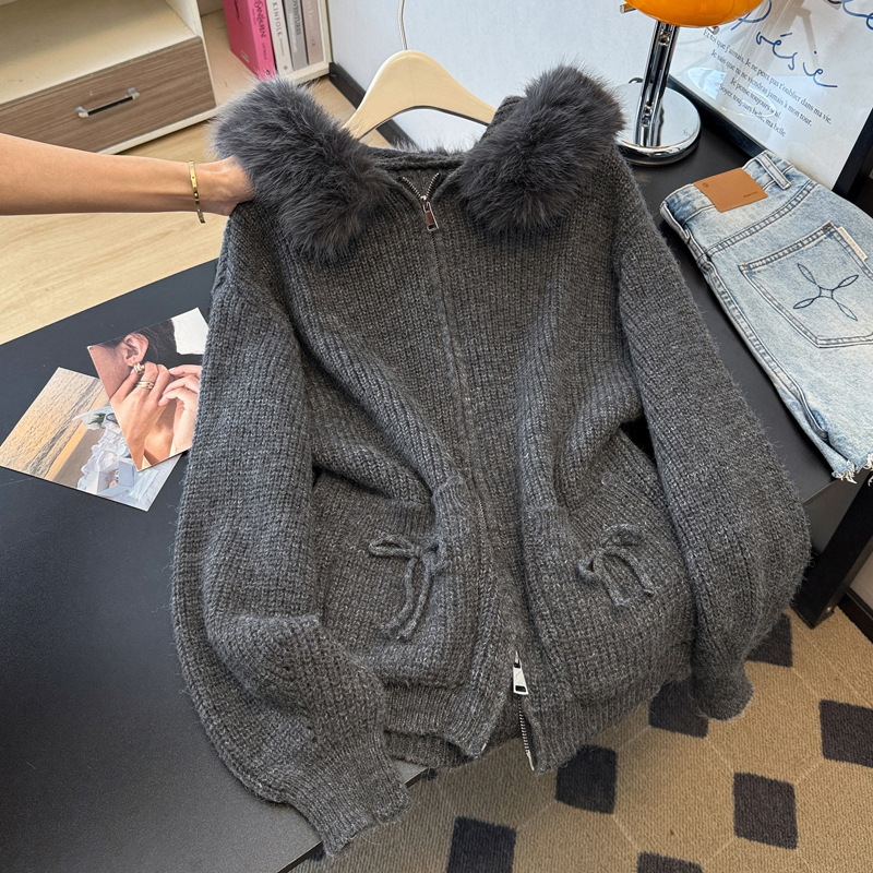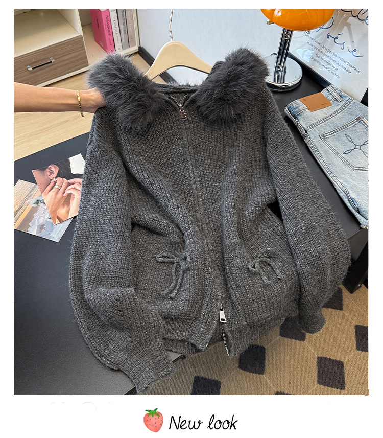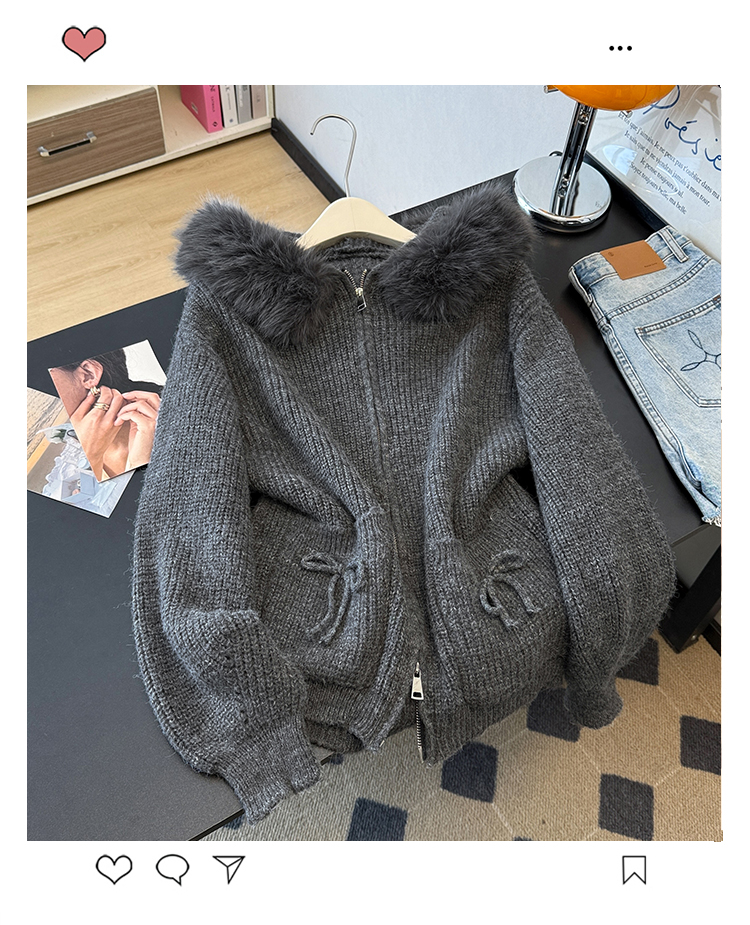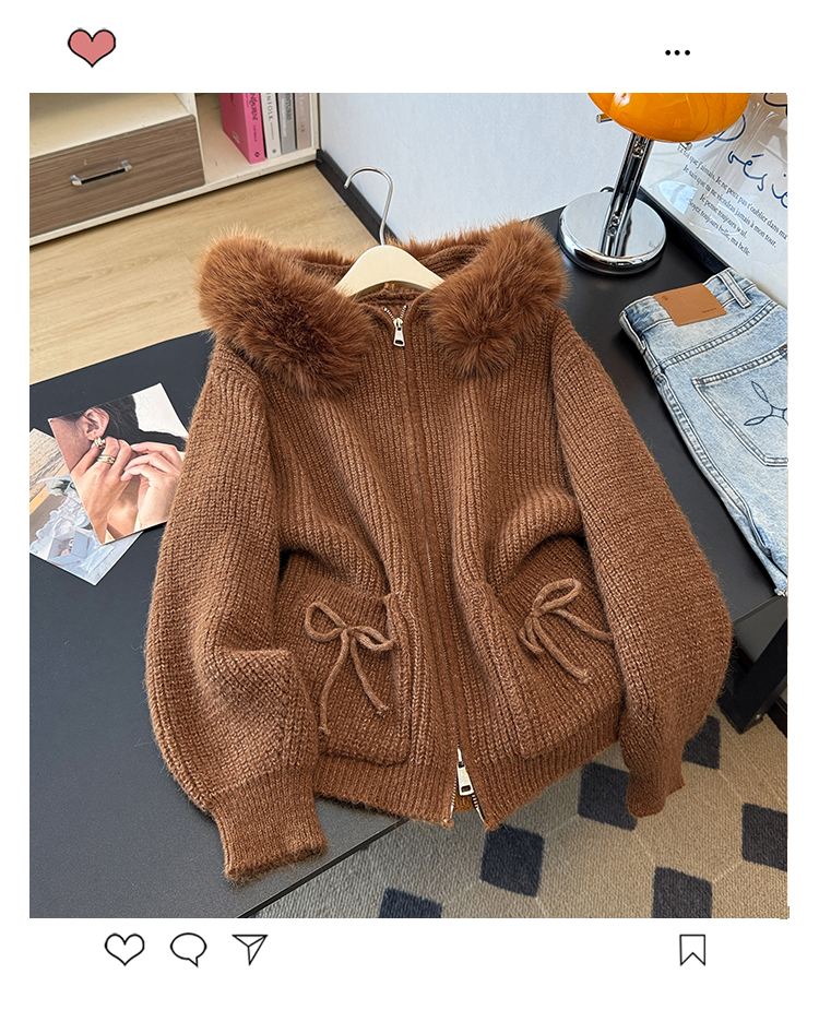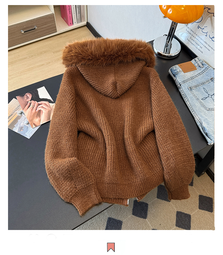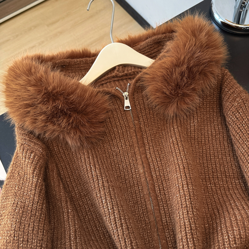 Western Style – Unloading Fur collar Slimming Knit Sweater Temperature Soft Glutinous Versatile Hooded Cardigan Sweater