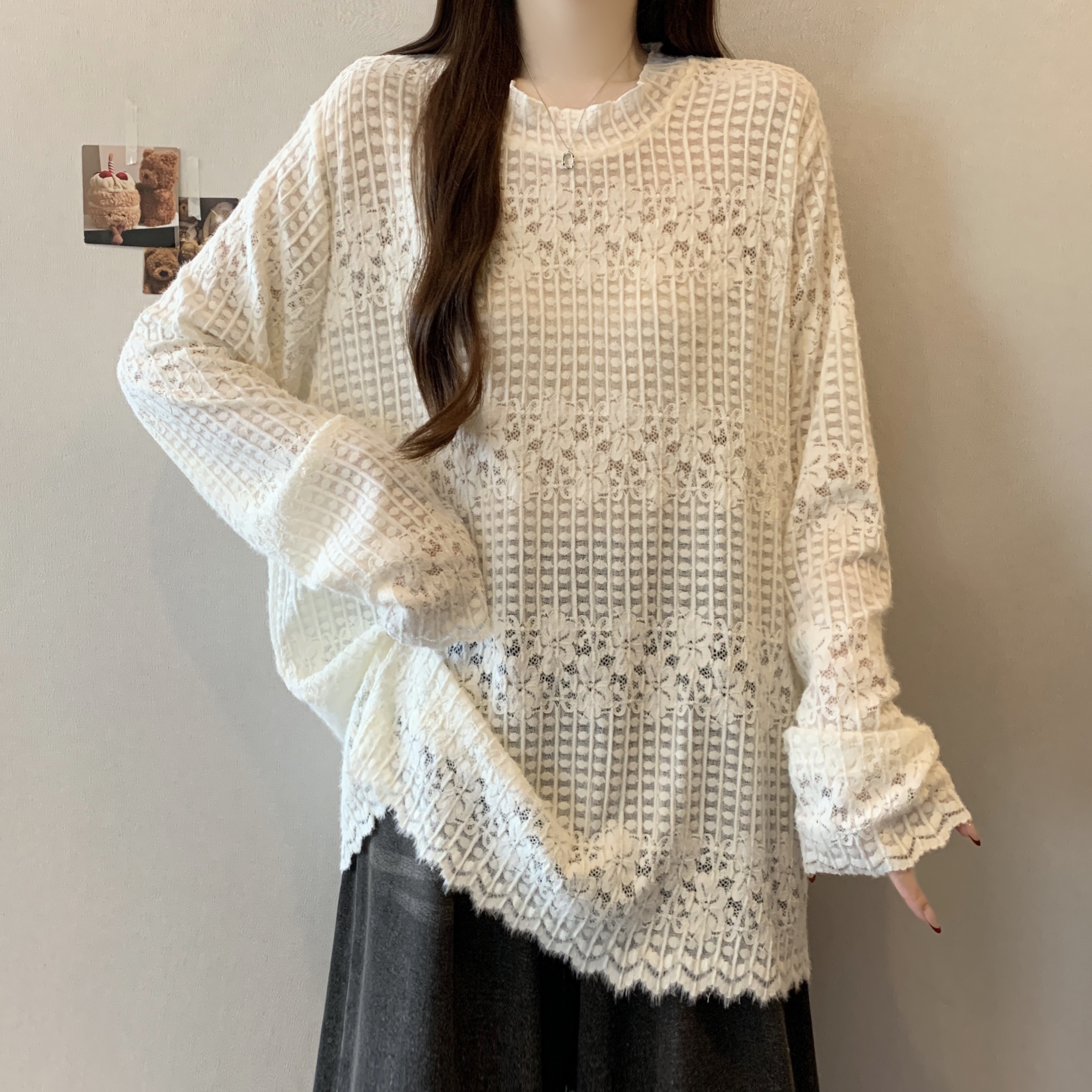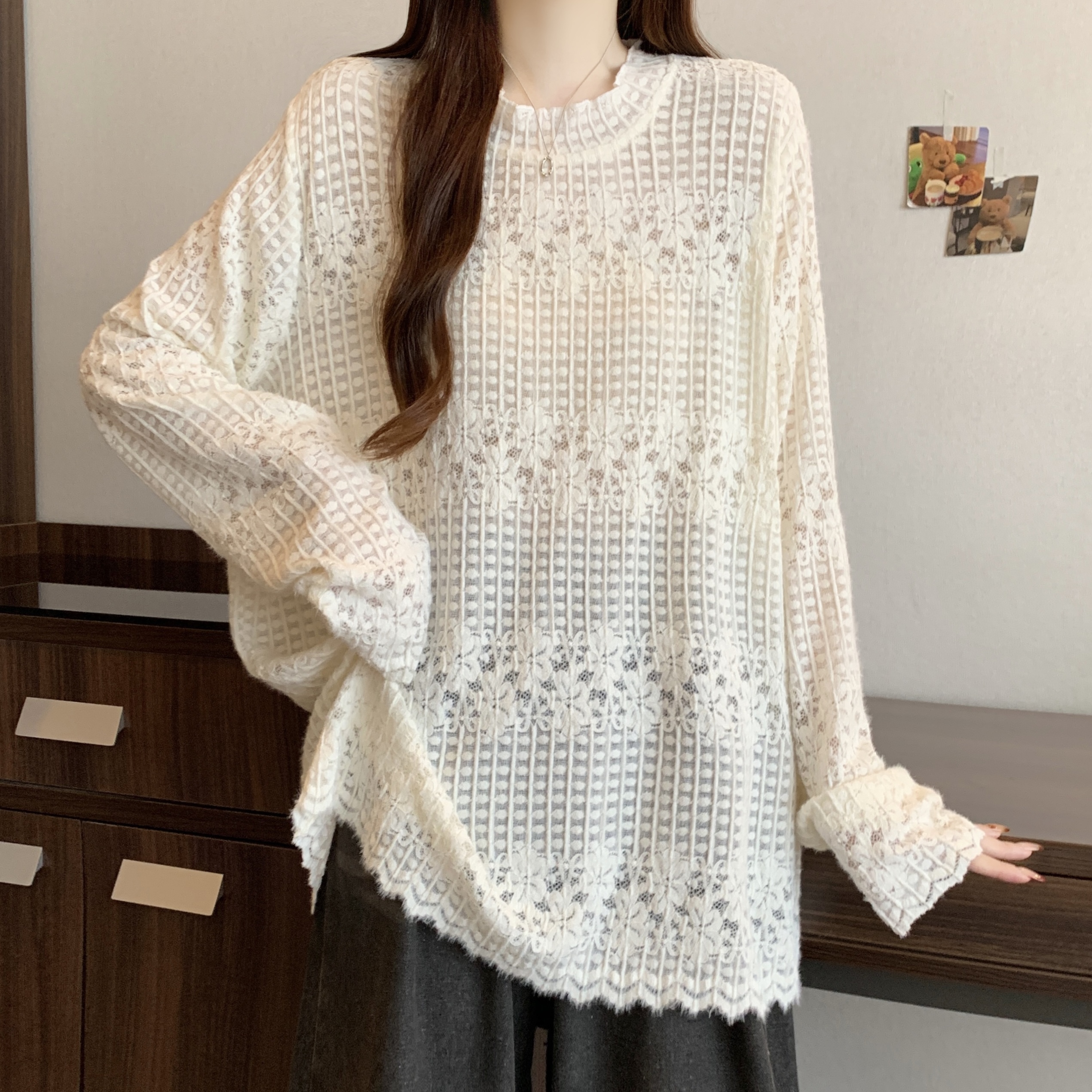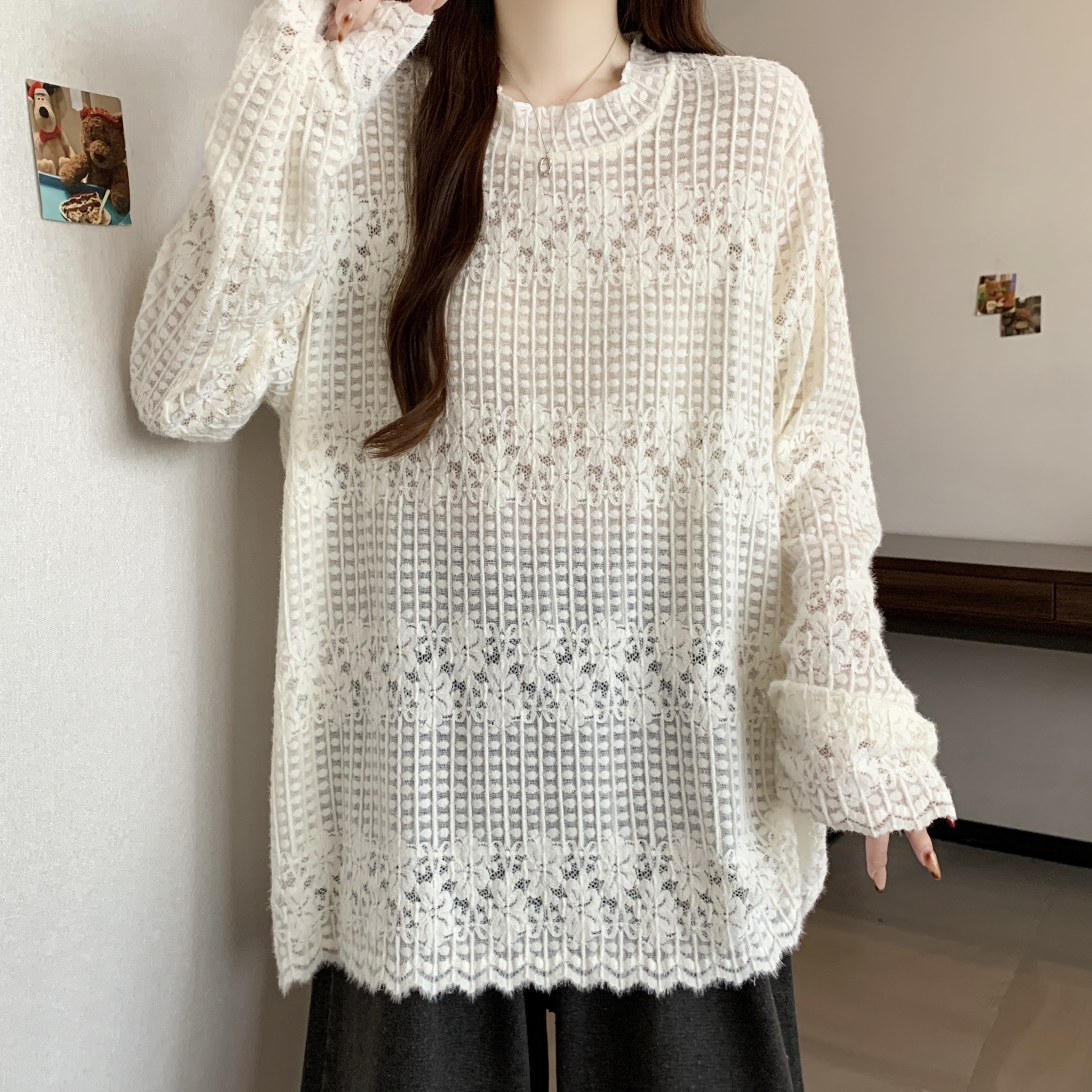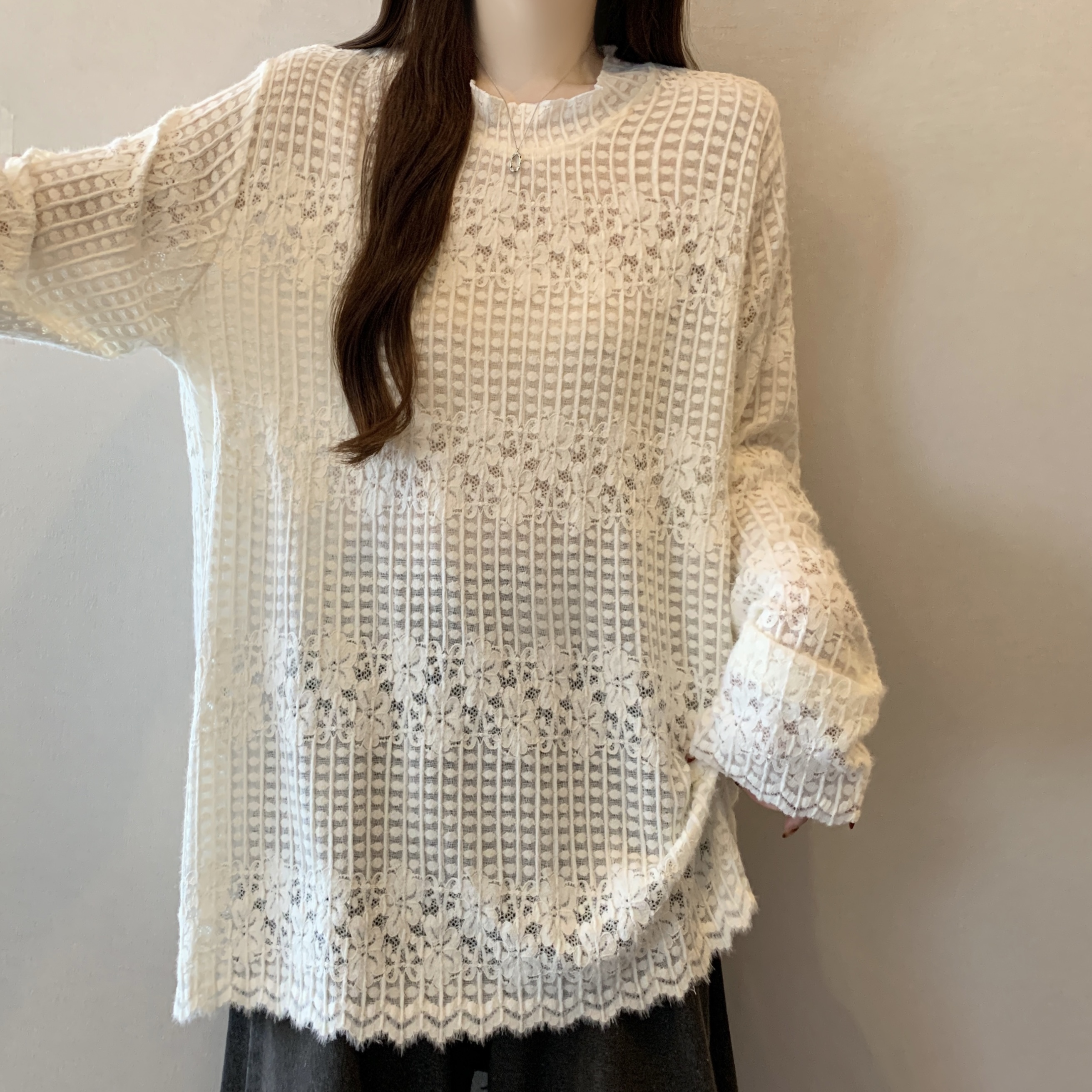 real photo Plus Size Round Neck French Style Lace shirt Stack Wear Base Shirt