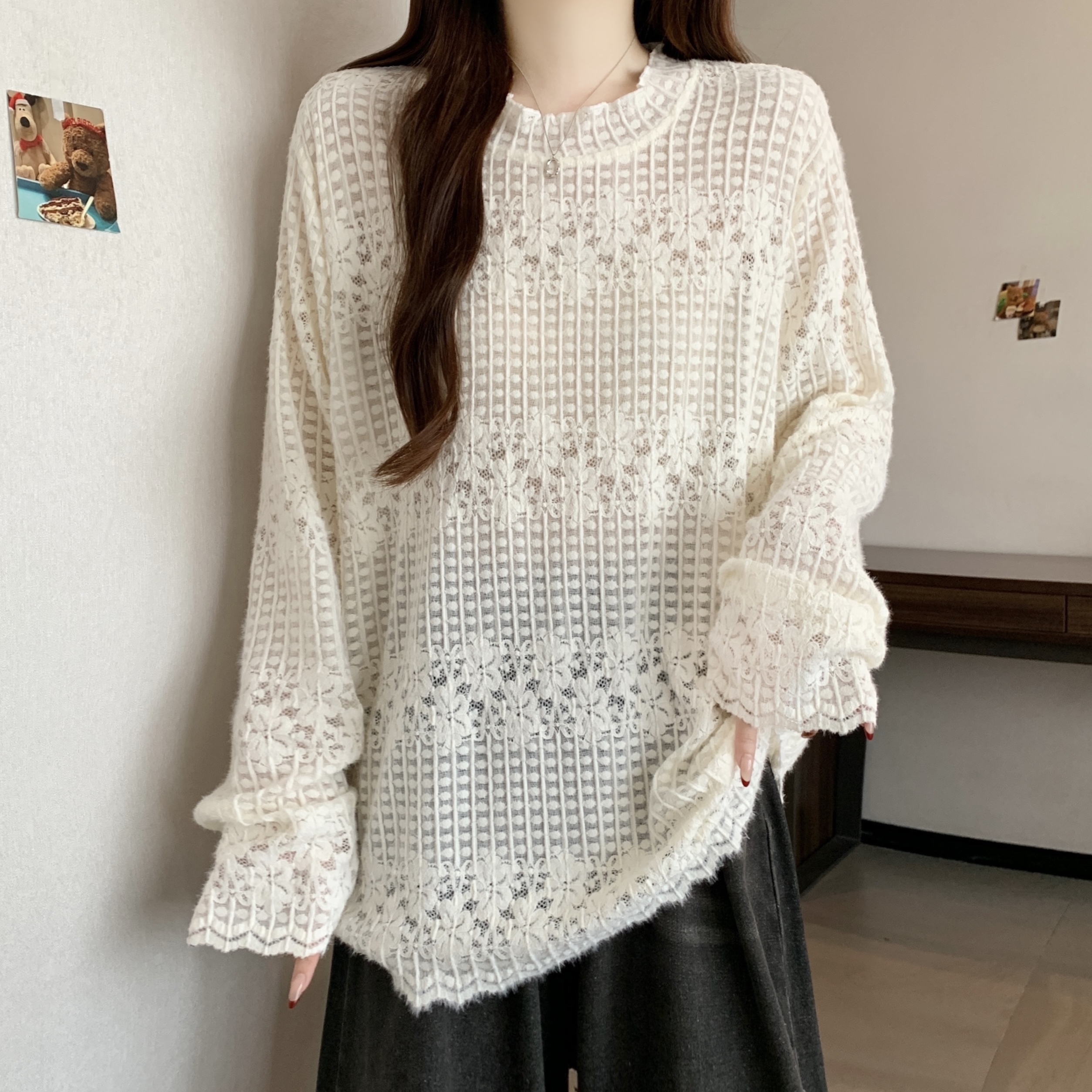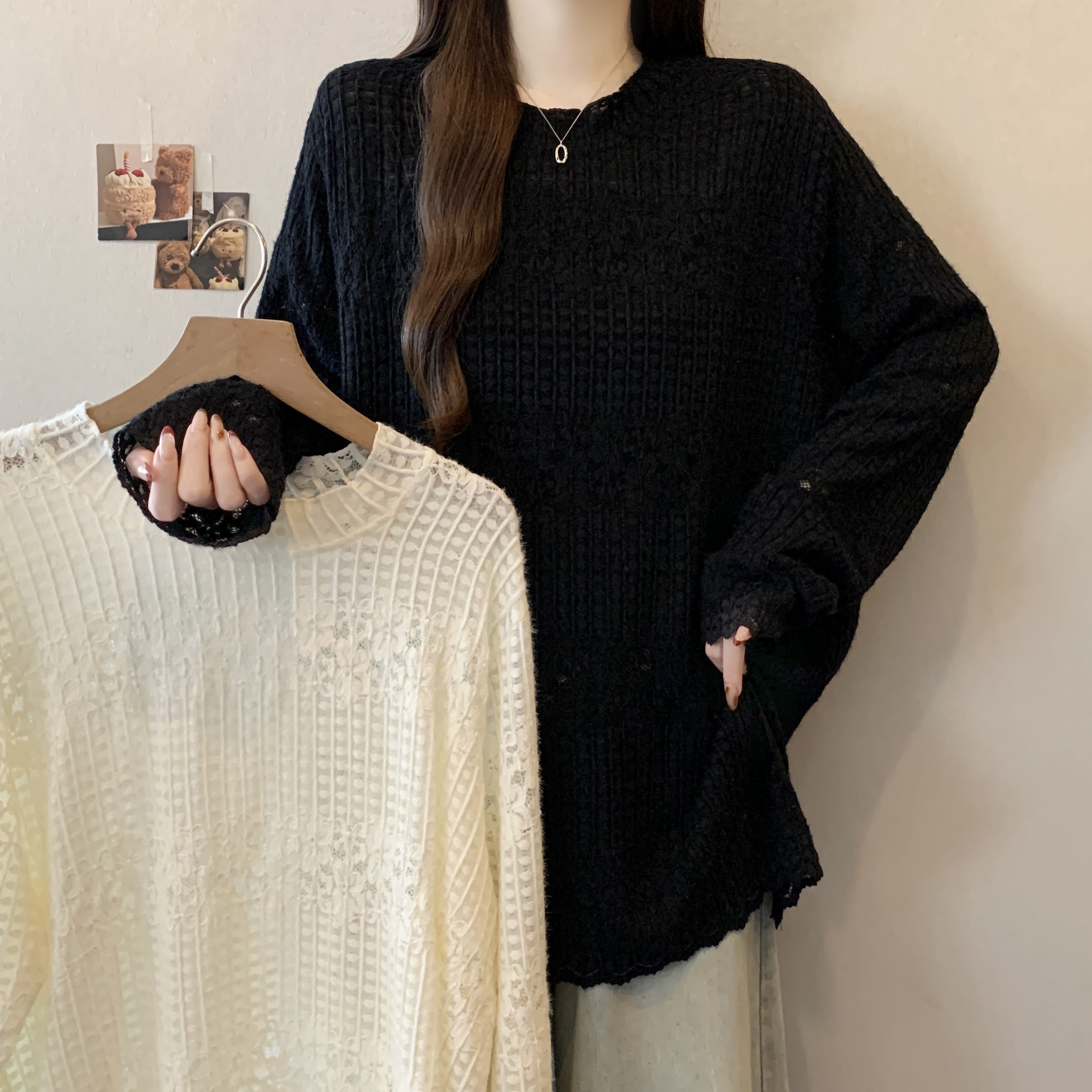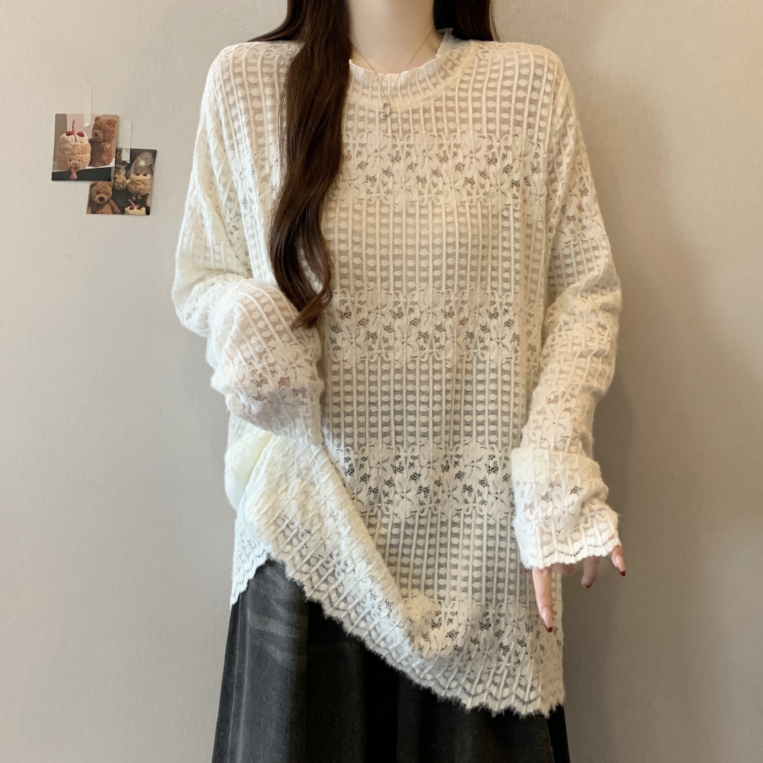 real photo Plus Size Round Neck French Style Lace shirt Stack Wear Base Shirt
