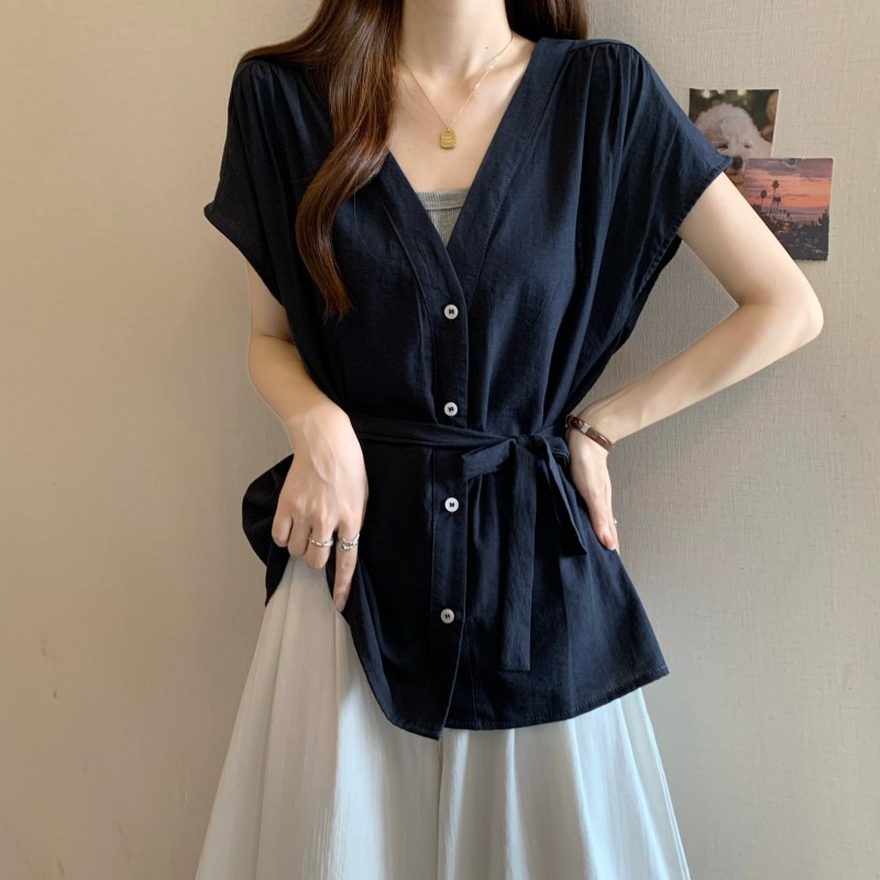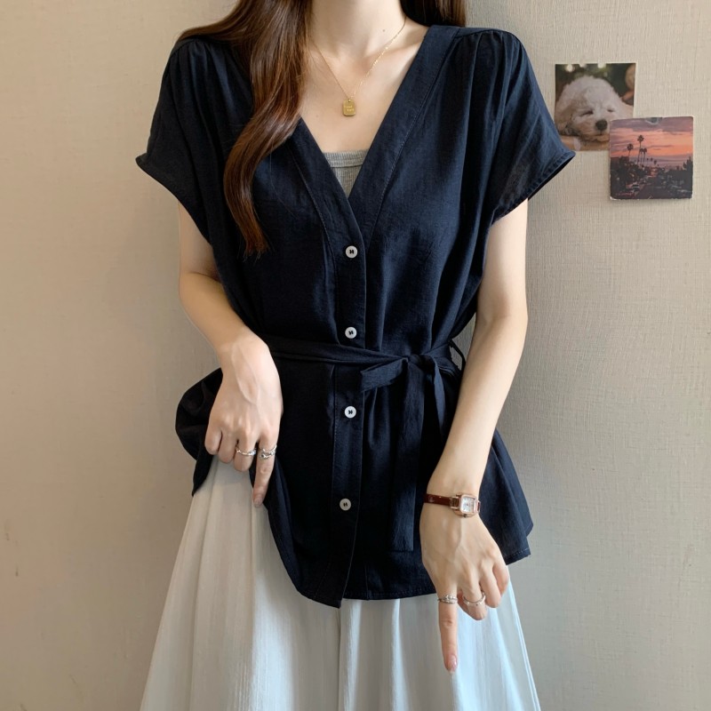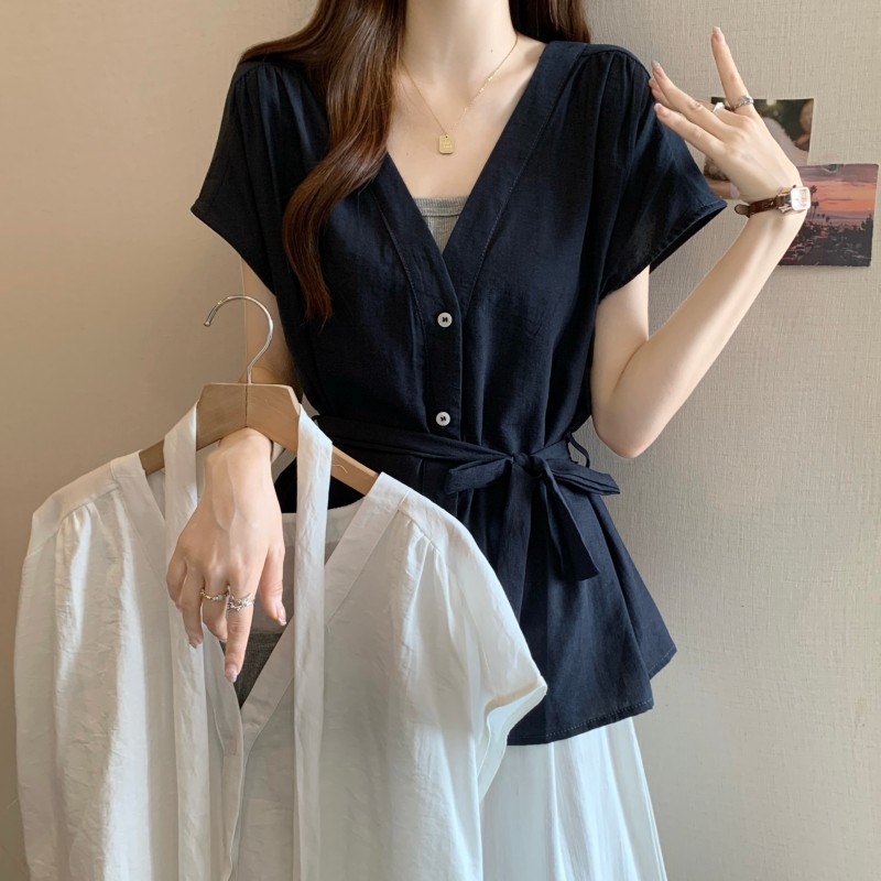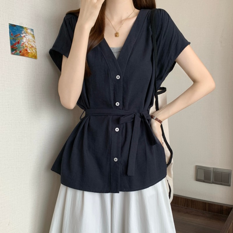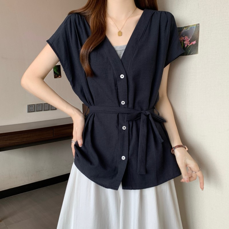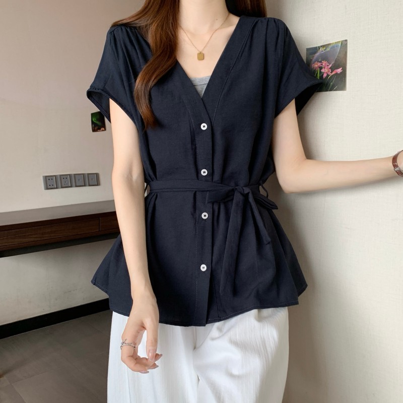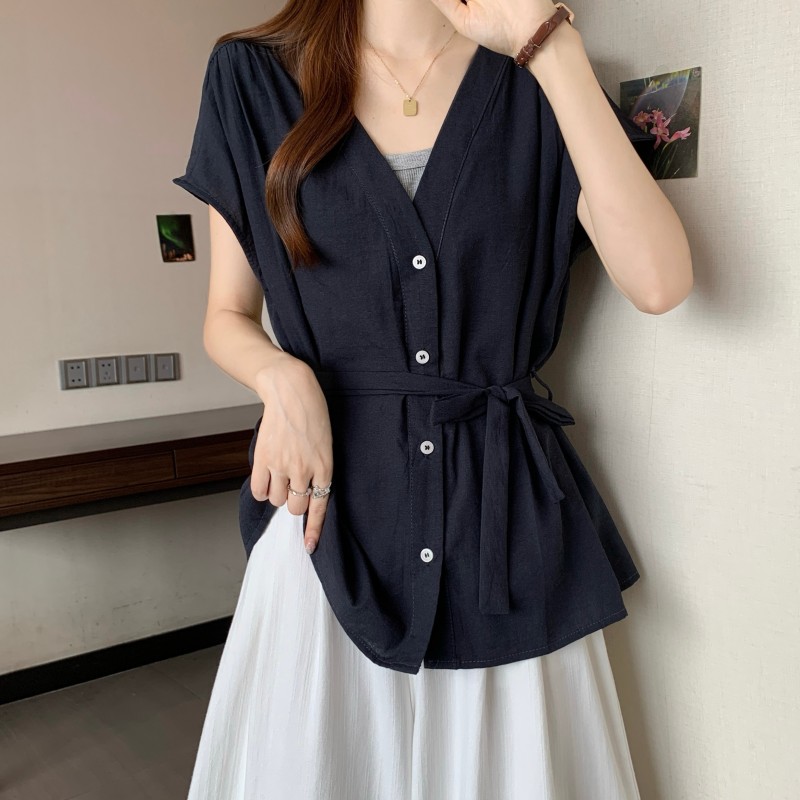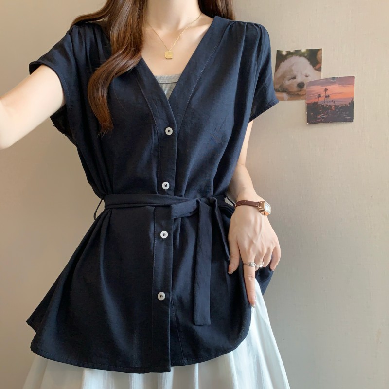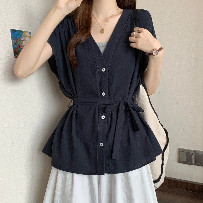 real photo Plus Size V Neck Small Fly Sleeve Lace-up Waist-cinching Pullover Top