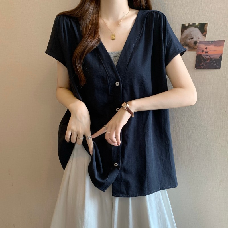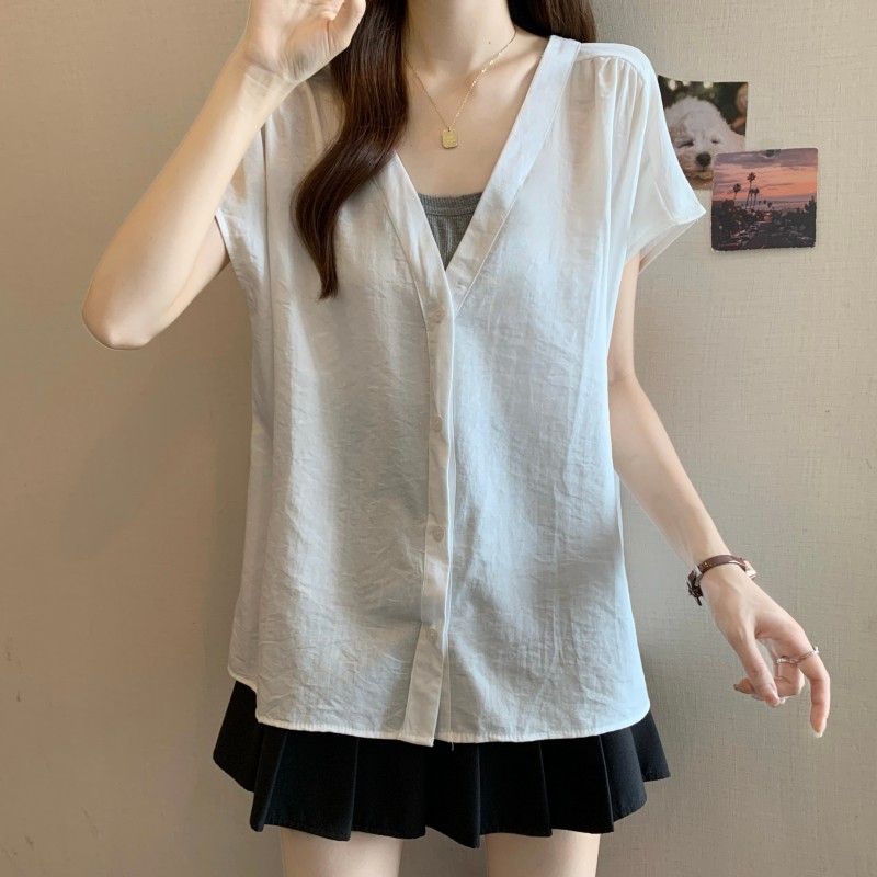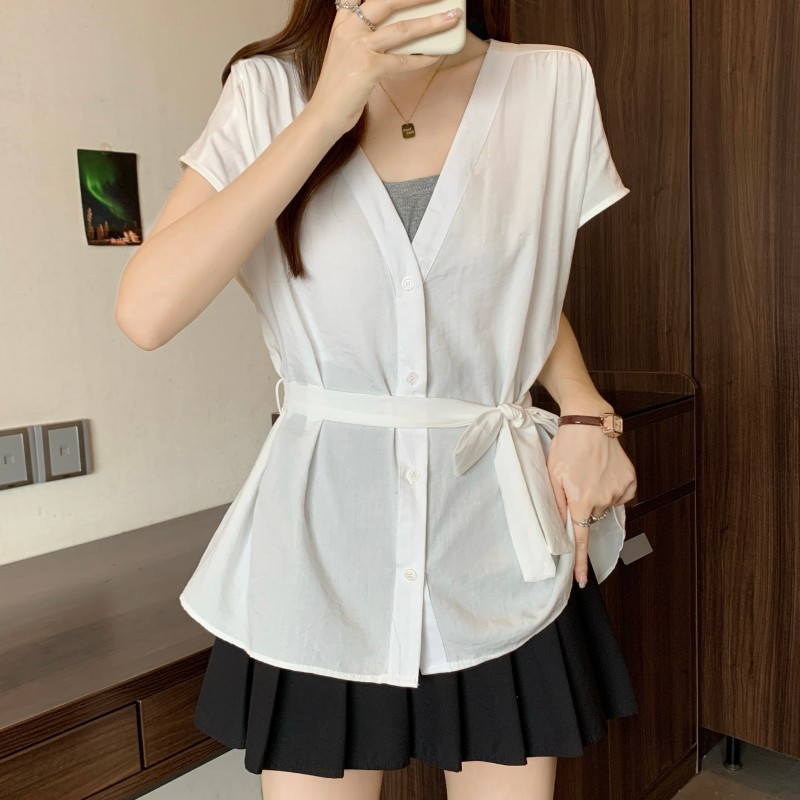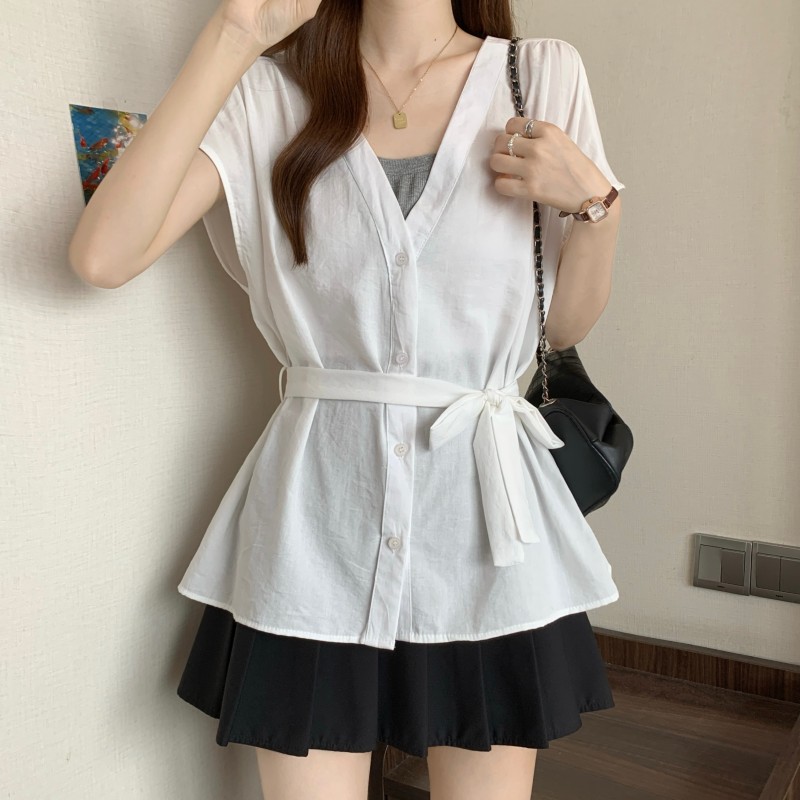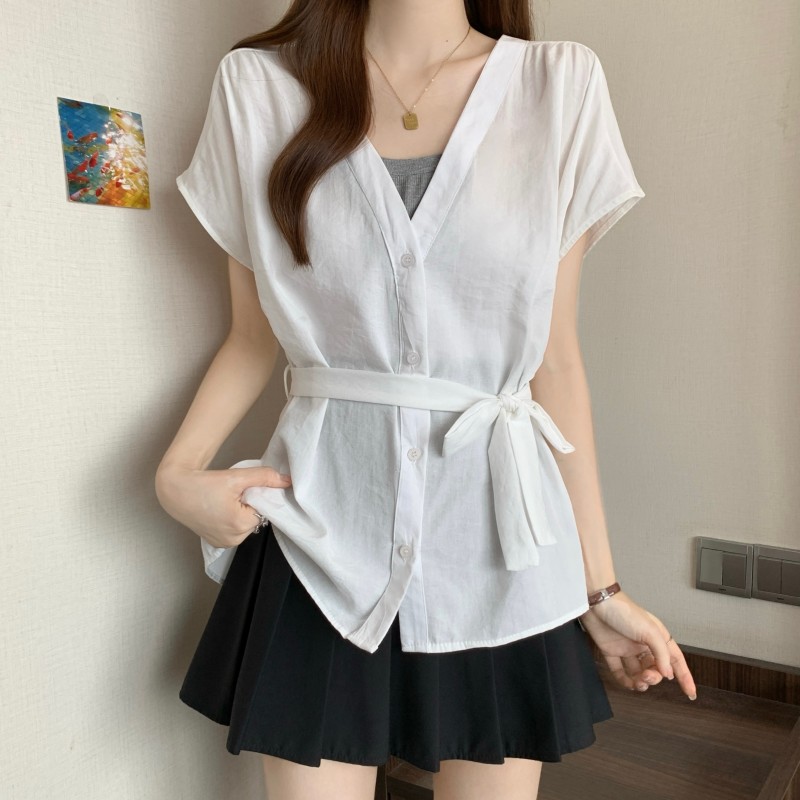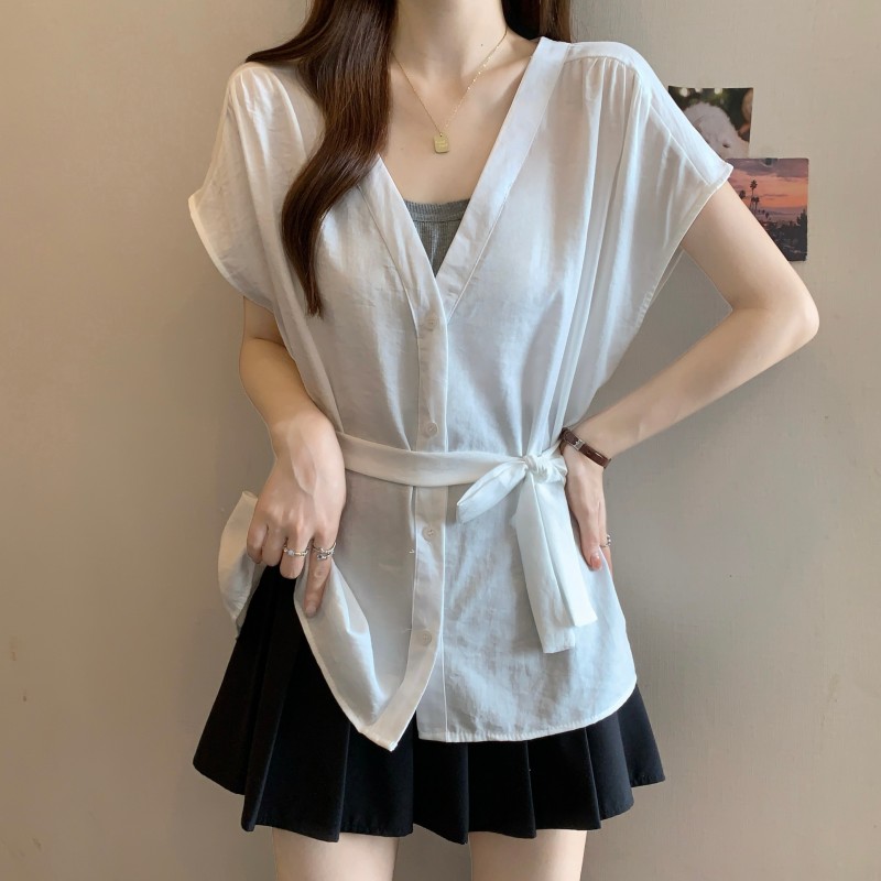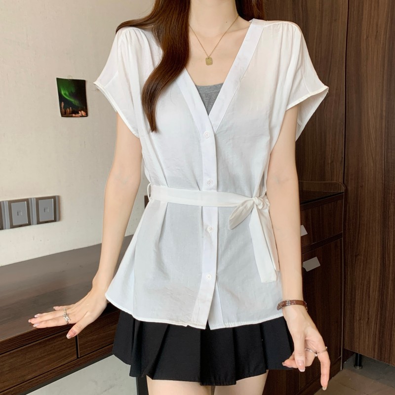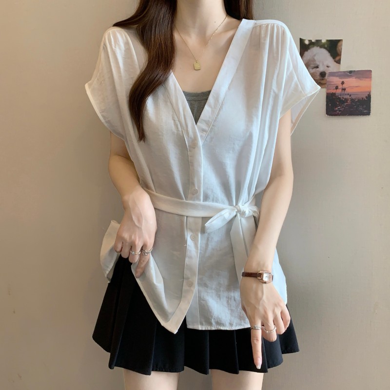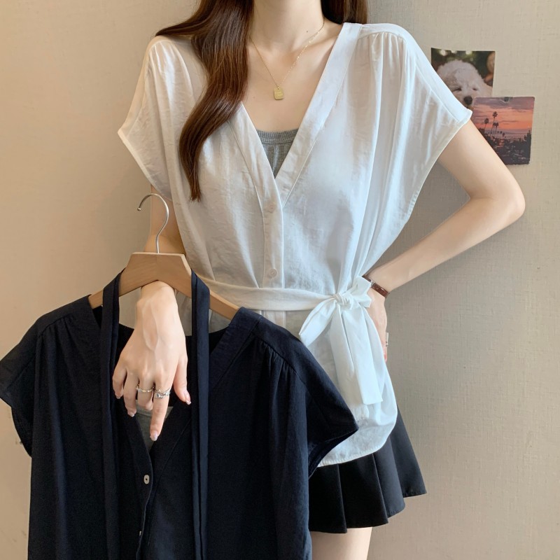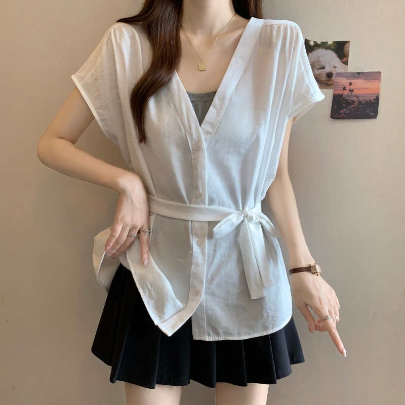 real photo Plus Size V Neck Small Fly Sleeve Lace-up Waist-cinching Pullover Top
