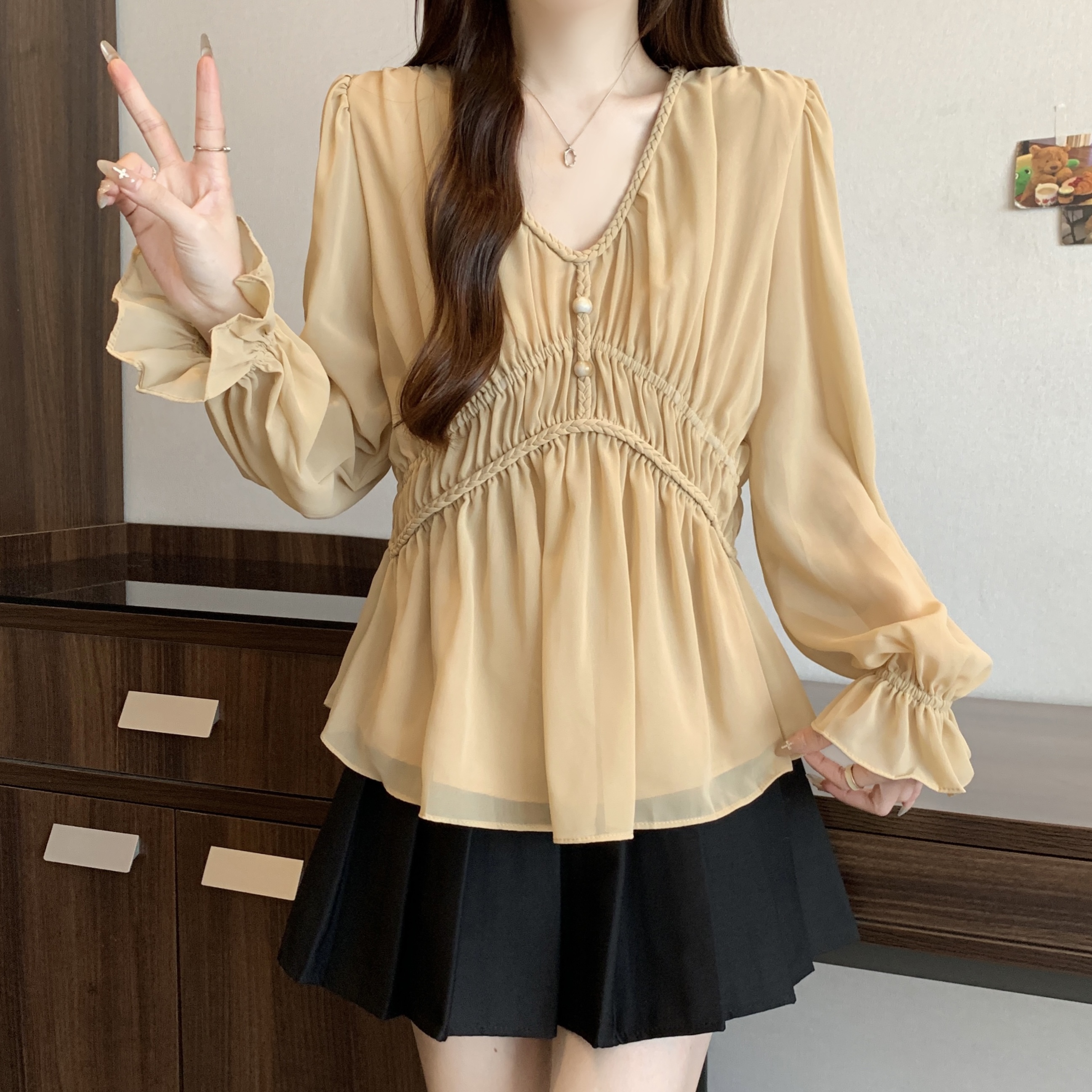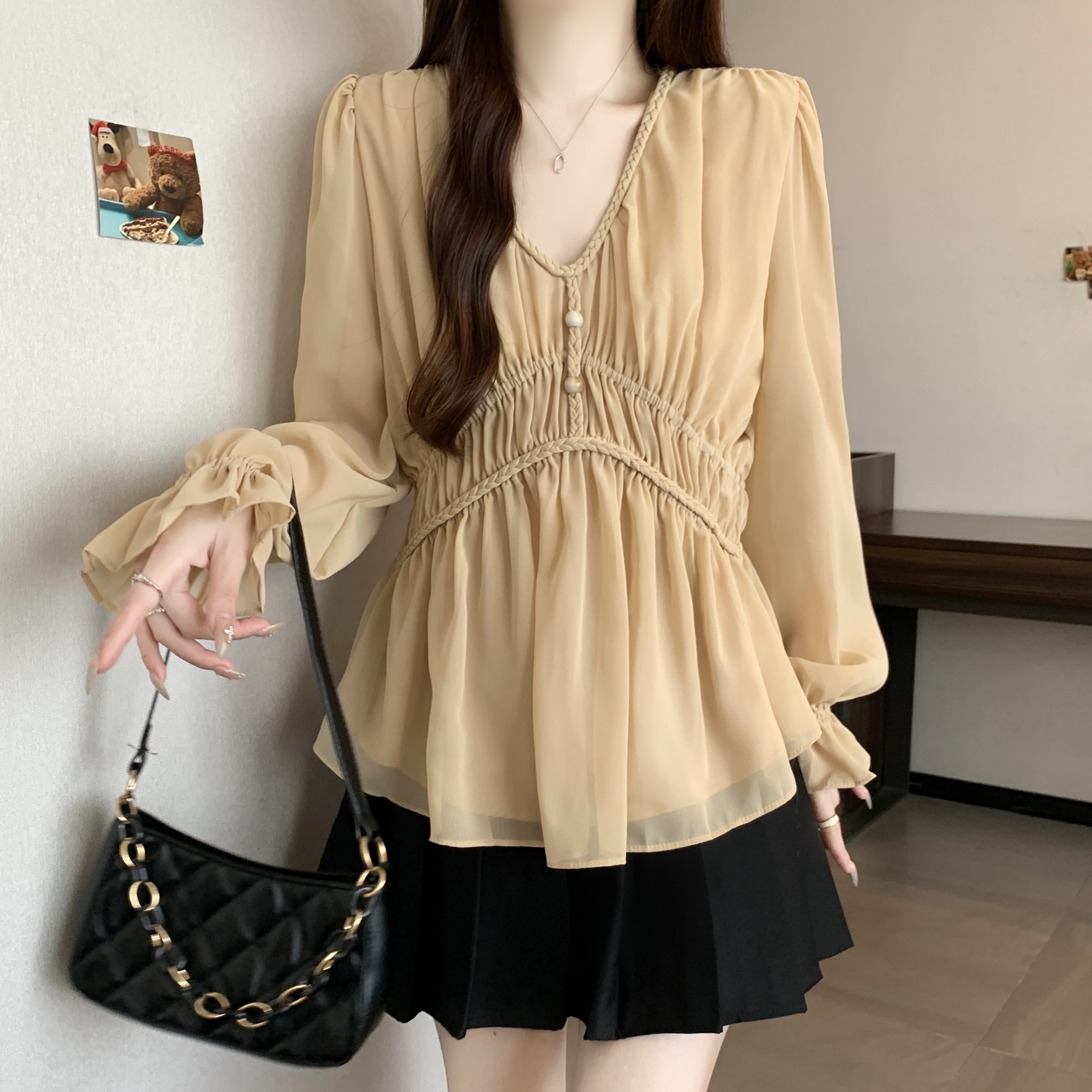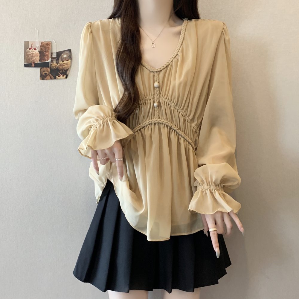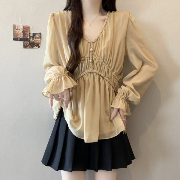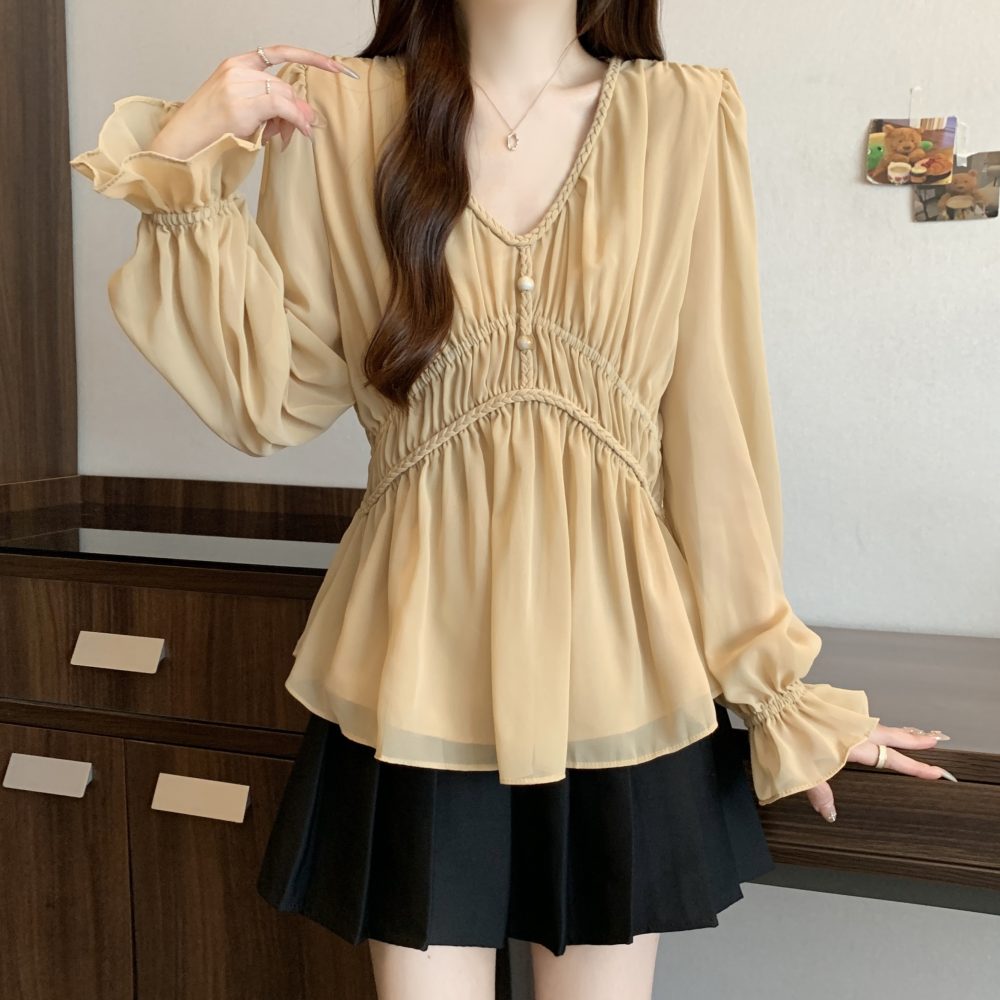 real photo Plus Size V Neck Waist-cinching Chiffon Shirt Women’s Slimming Versatile Top