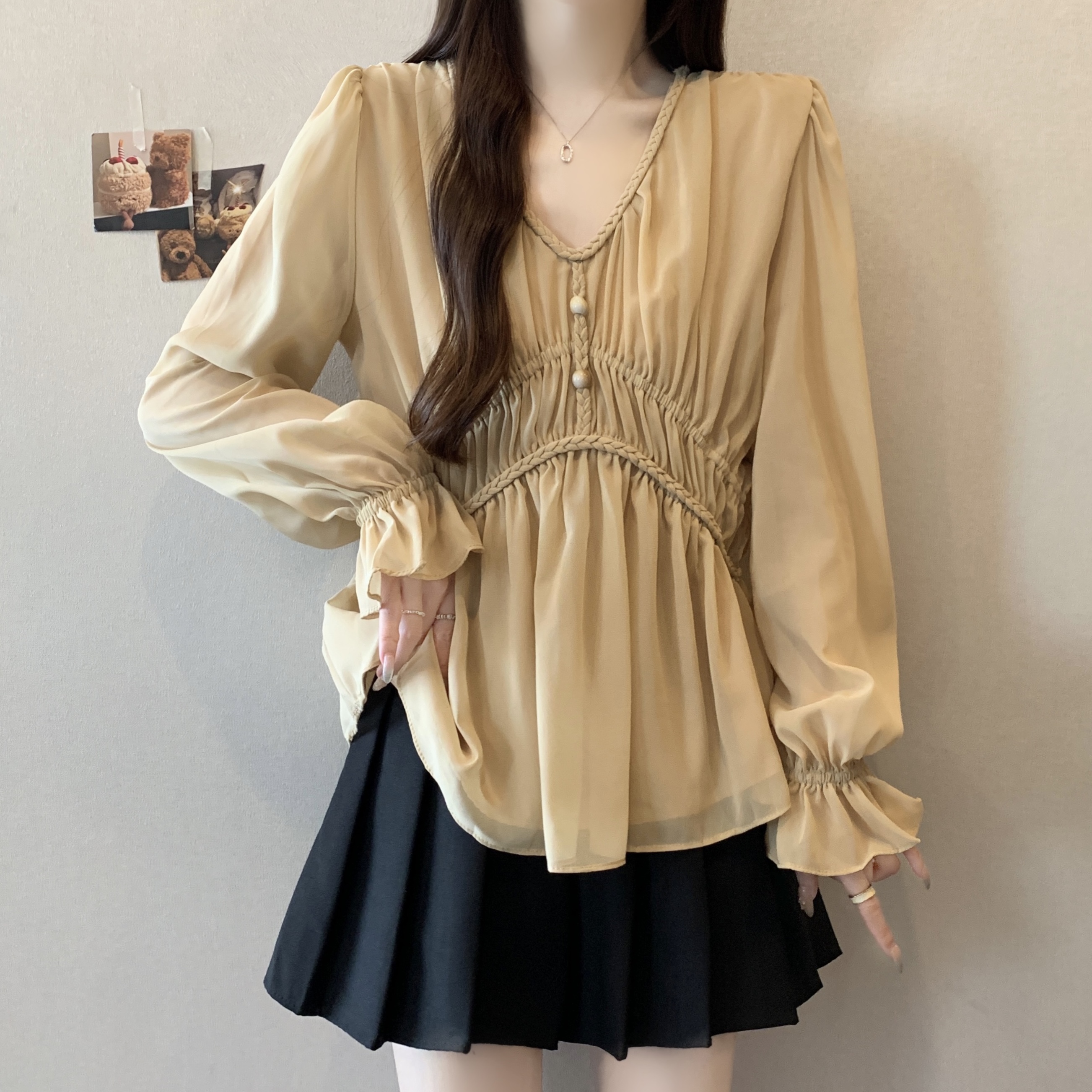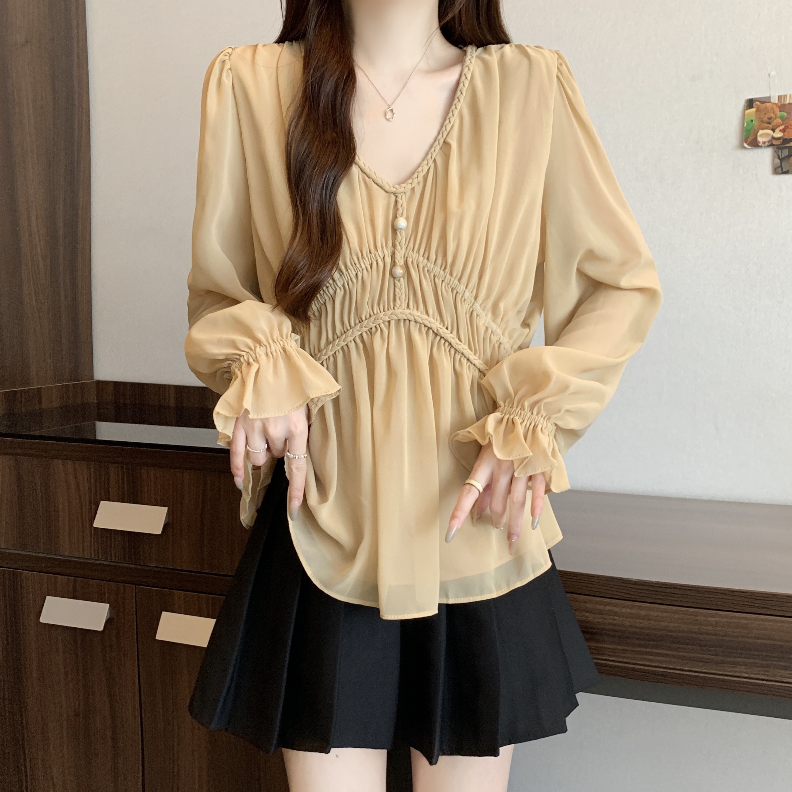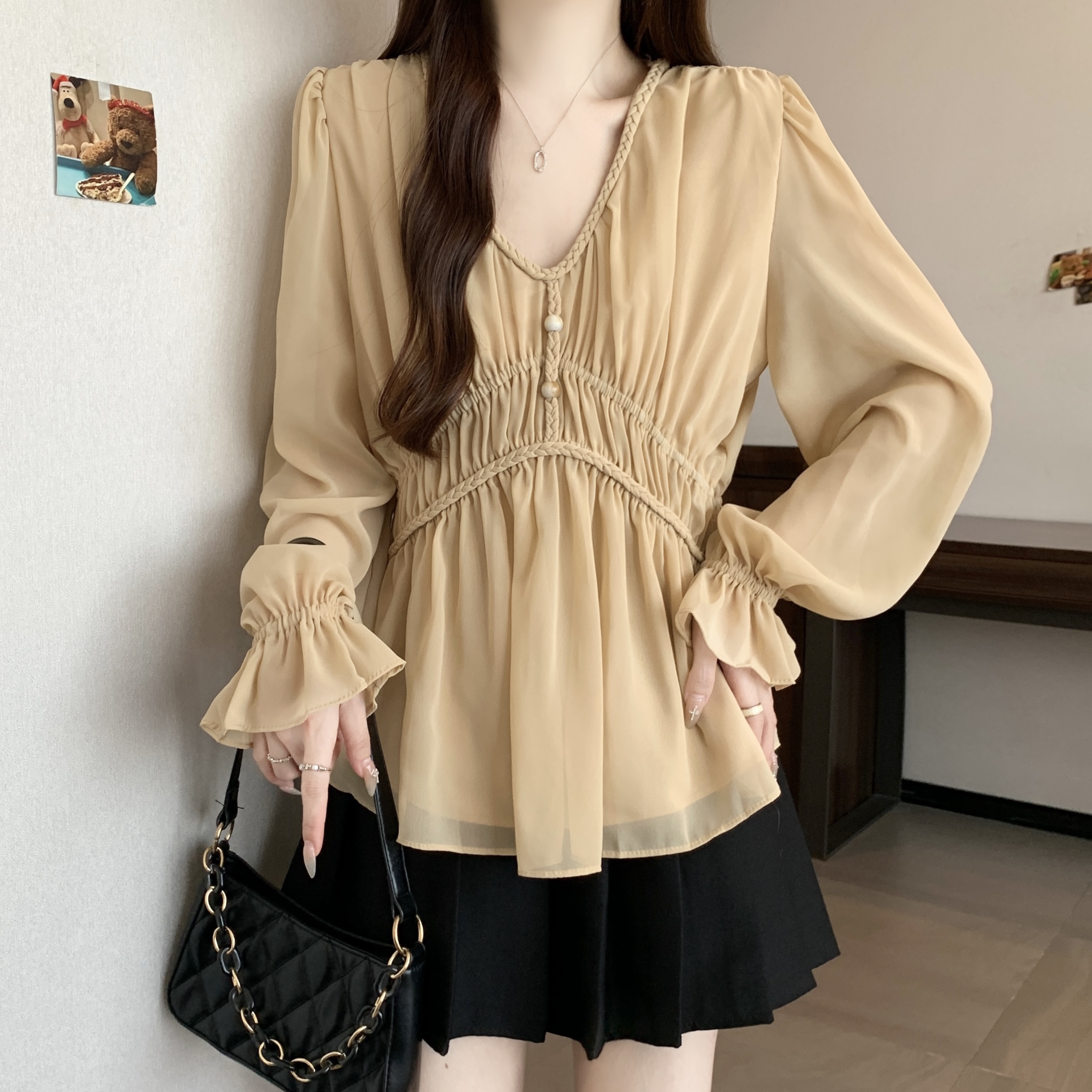 real photo Plus Size V Neck Waist-cinching Chiffon Shirt Women’s Slimming Versatile Top