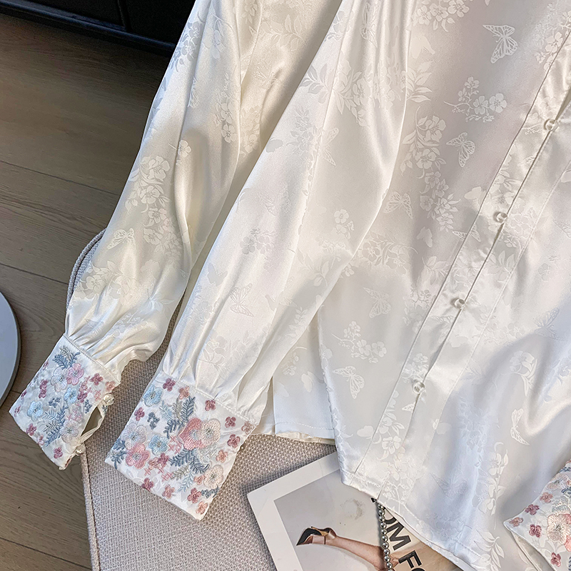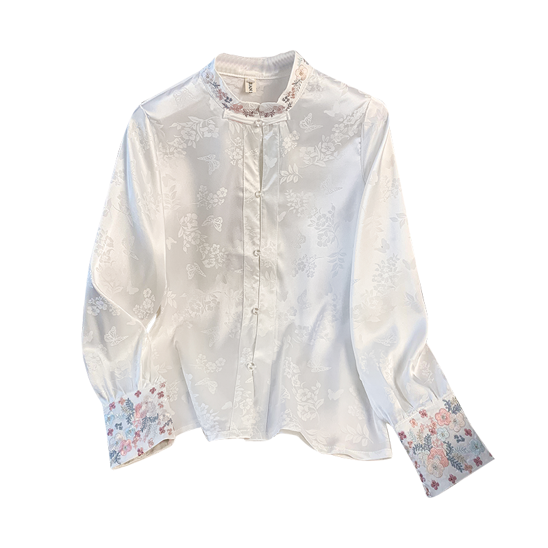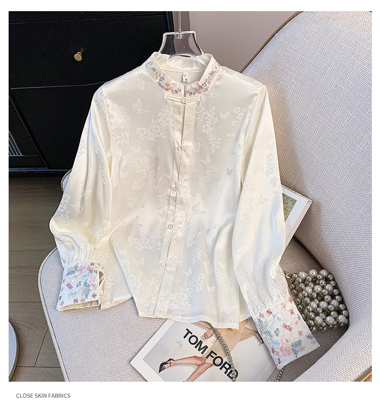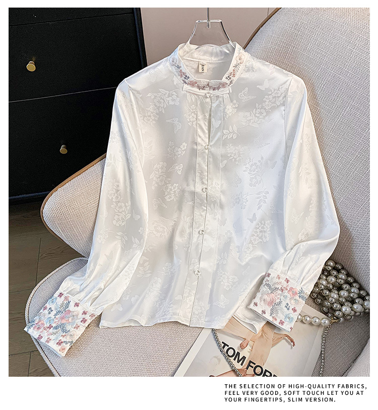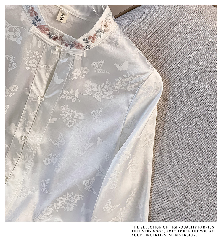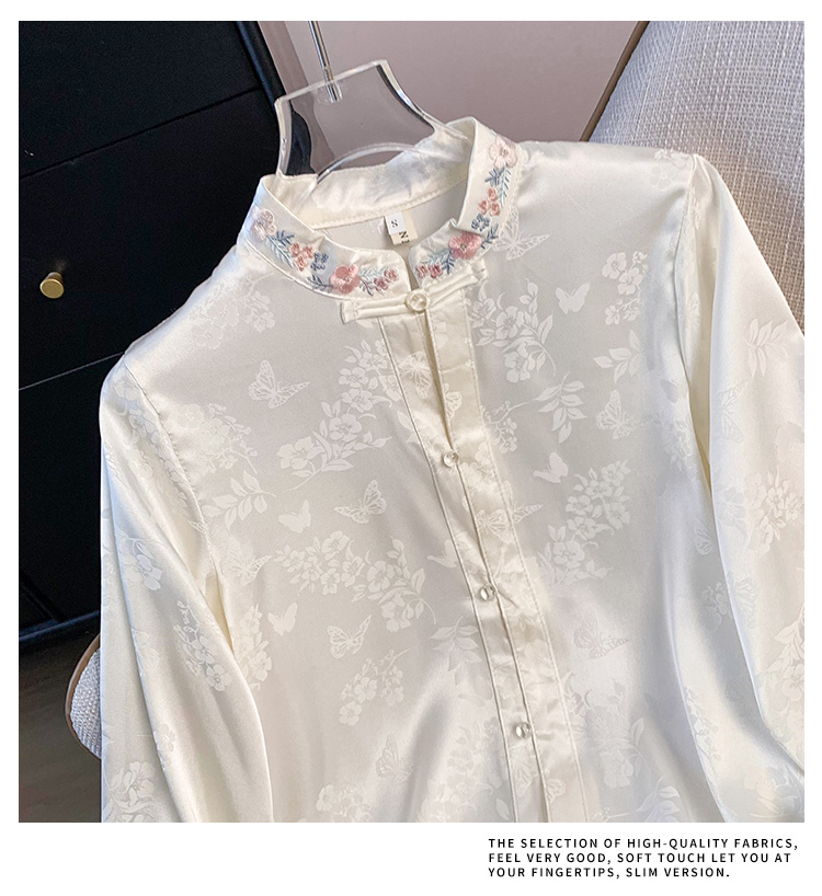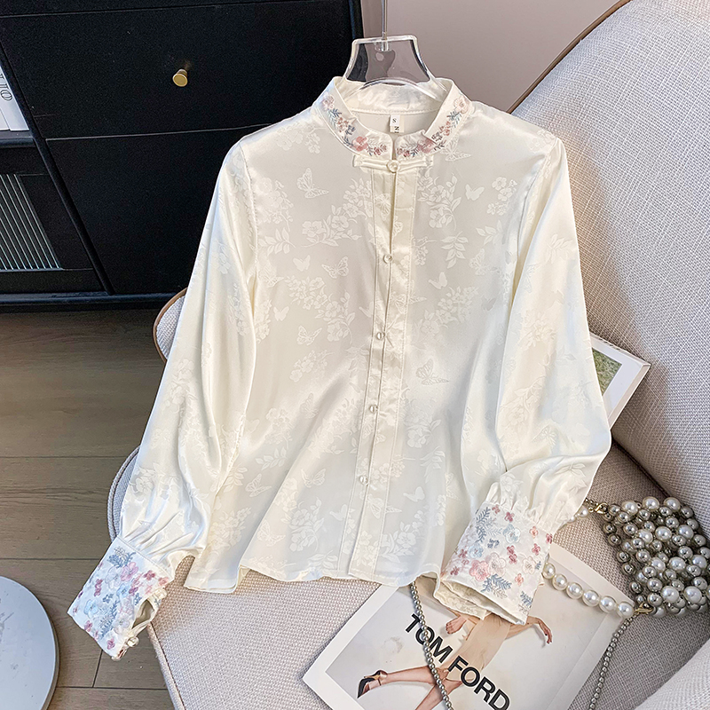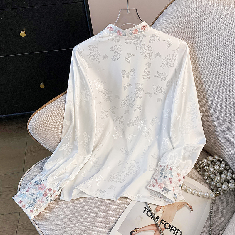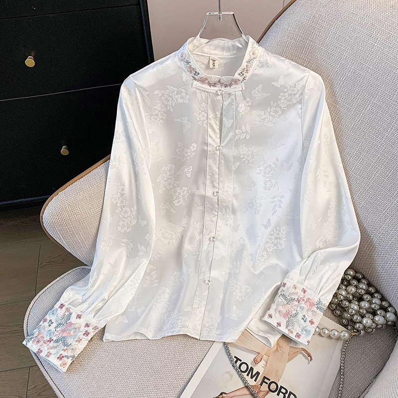 New Chinese Style Simple Embroidered Top Improved Stand Collar Versatile Long Sleeve Shirt plus Size