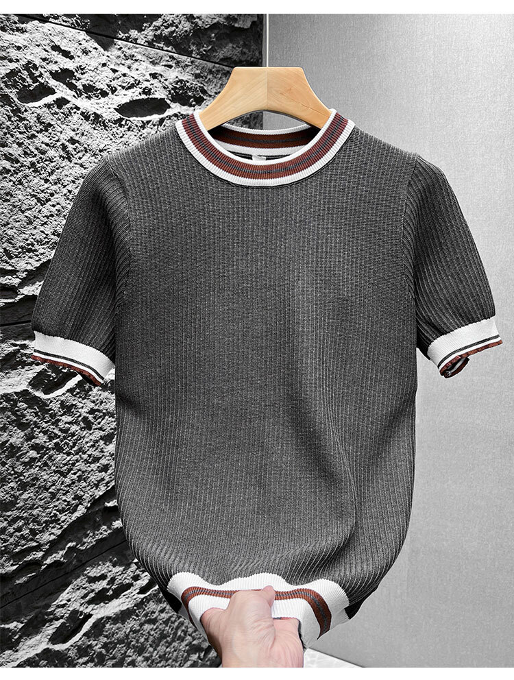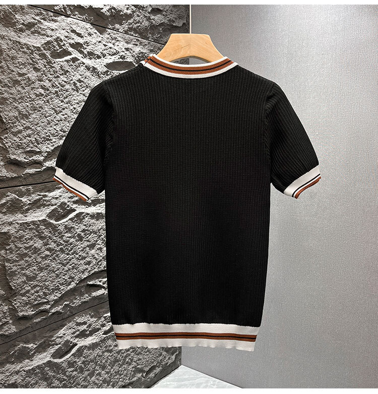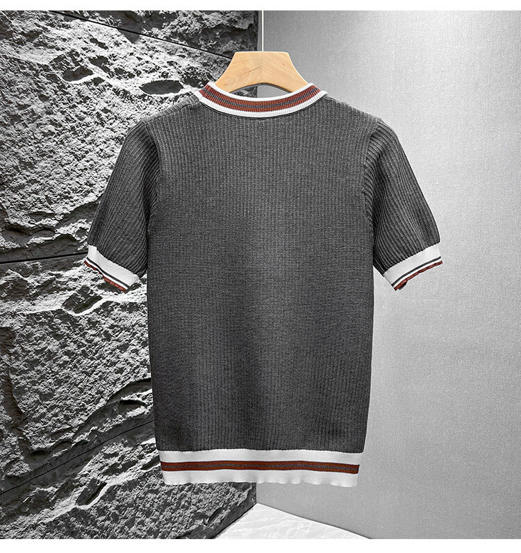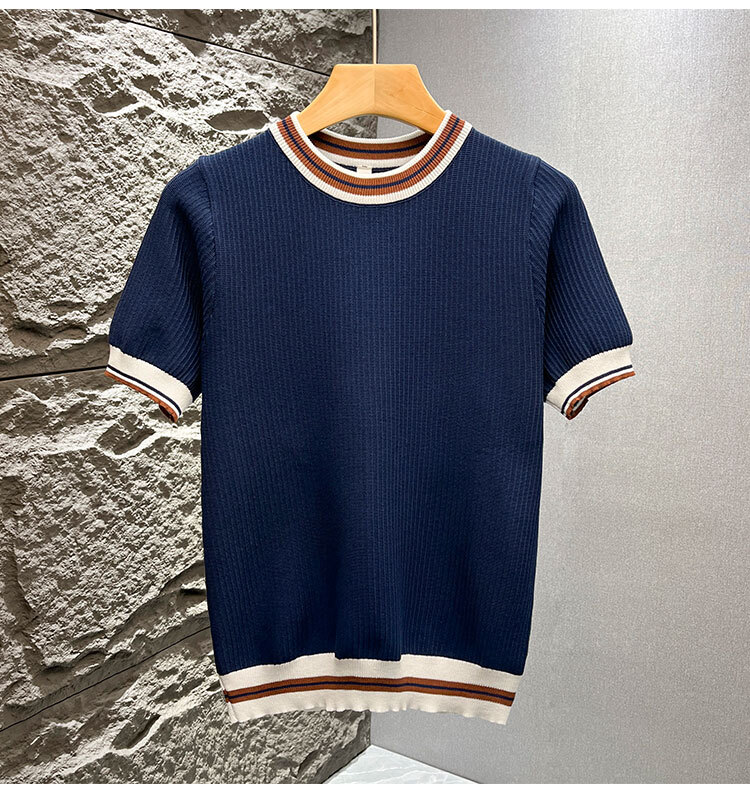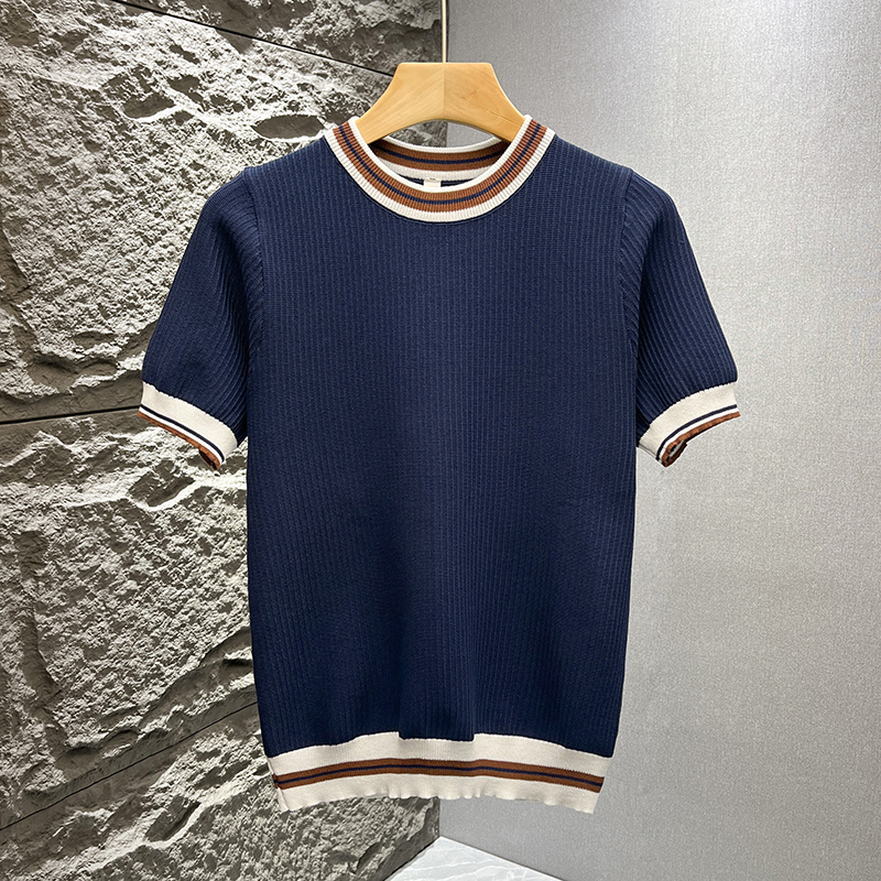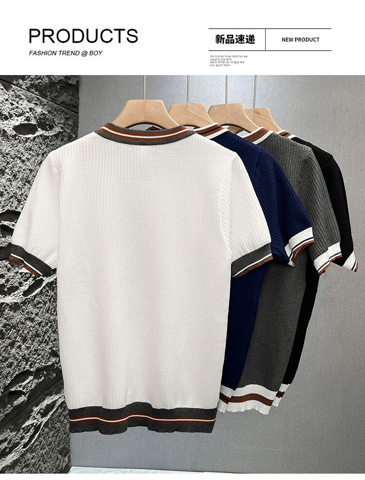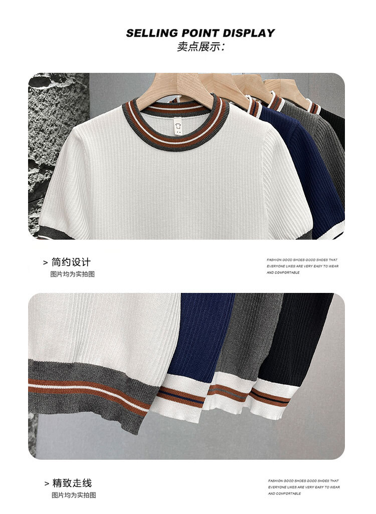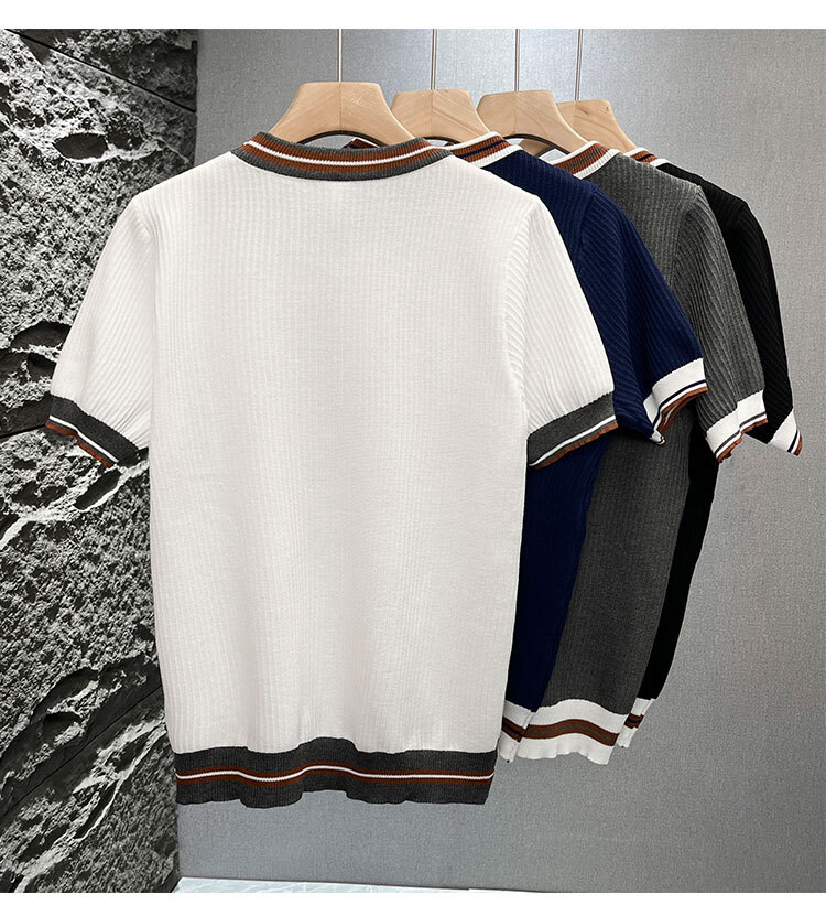 round Neck Contrast Color Short-Sleeved T-shirt Men’s Youth Ice Silk Breathable Retro Half-Sleeve Sweater
