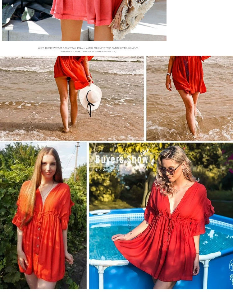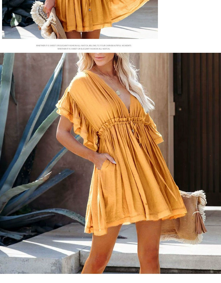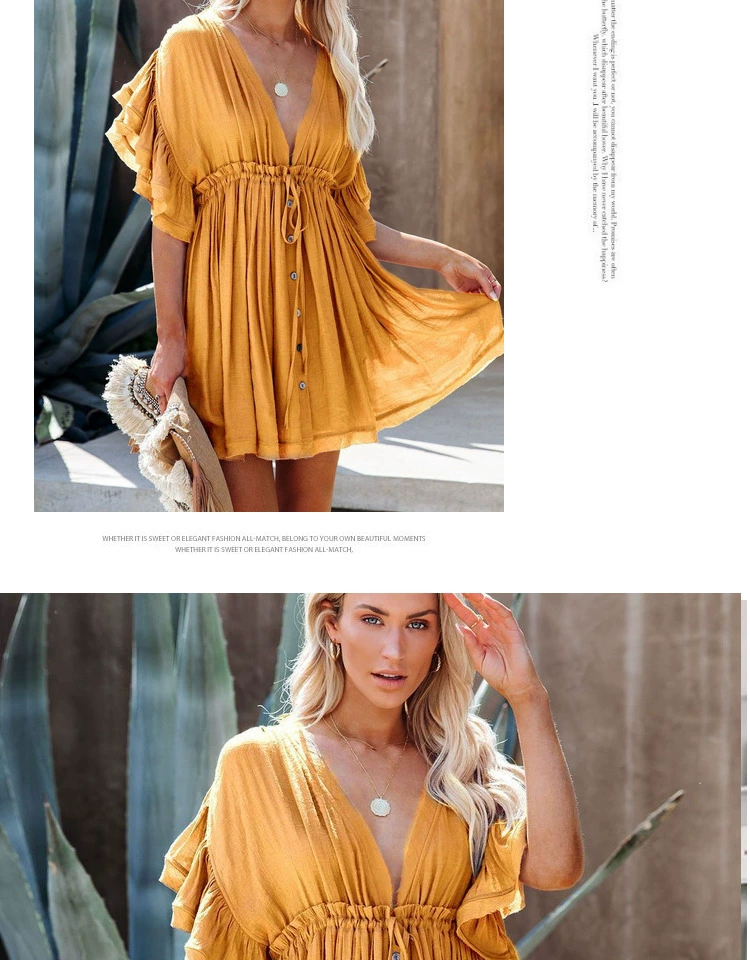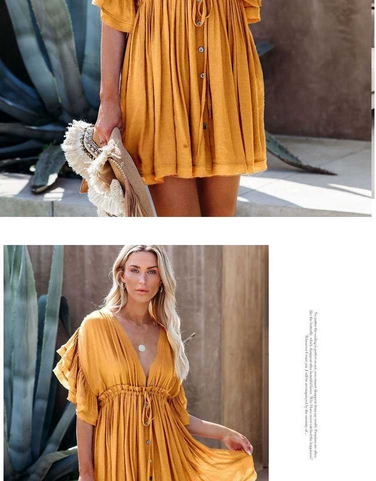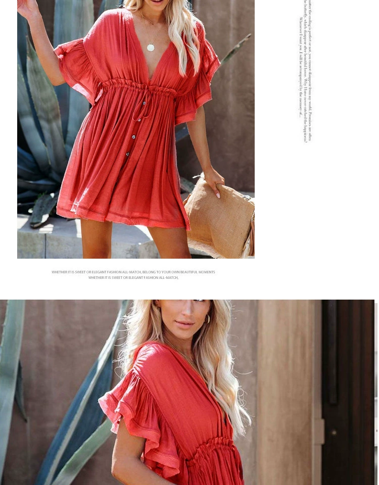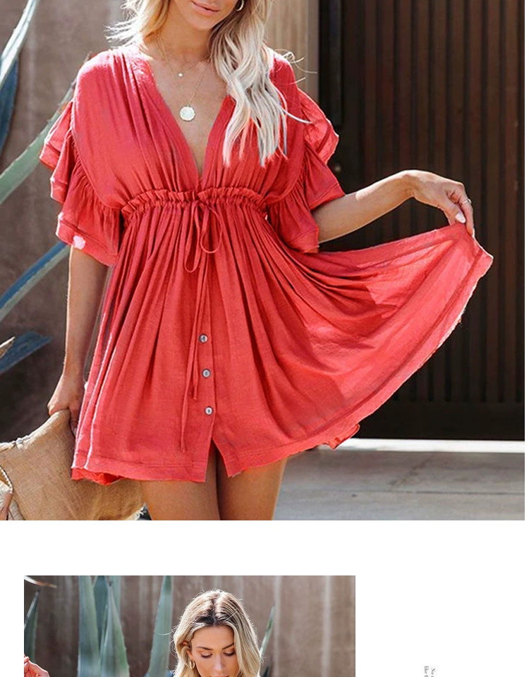 Be the first to review “Sexy deep V half-breasted slightly see-through beach dress with waist tie and backless short-sleeved beach dress”