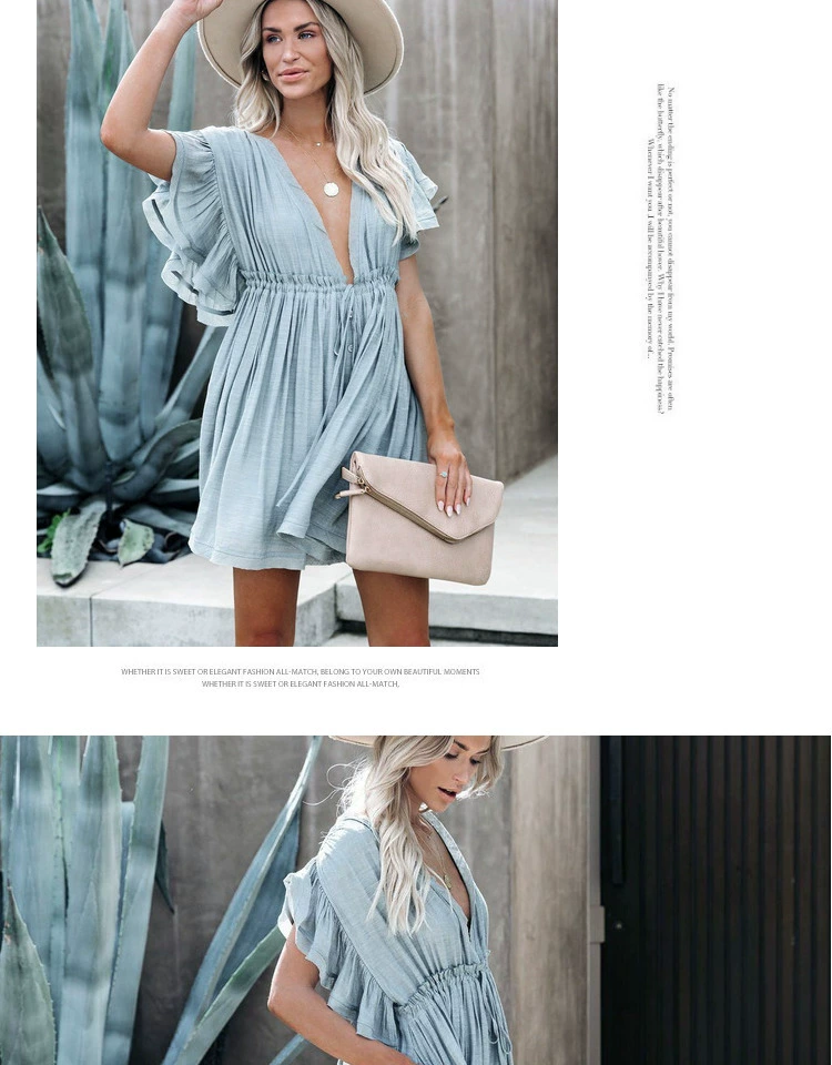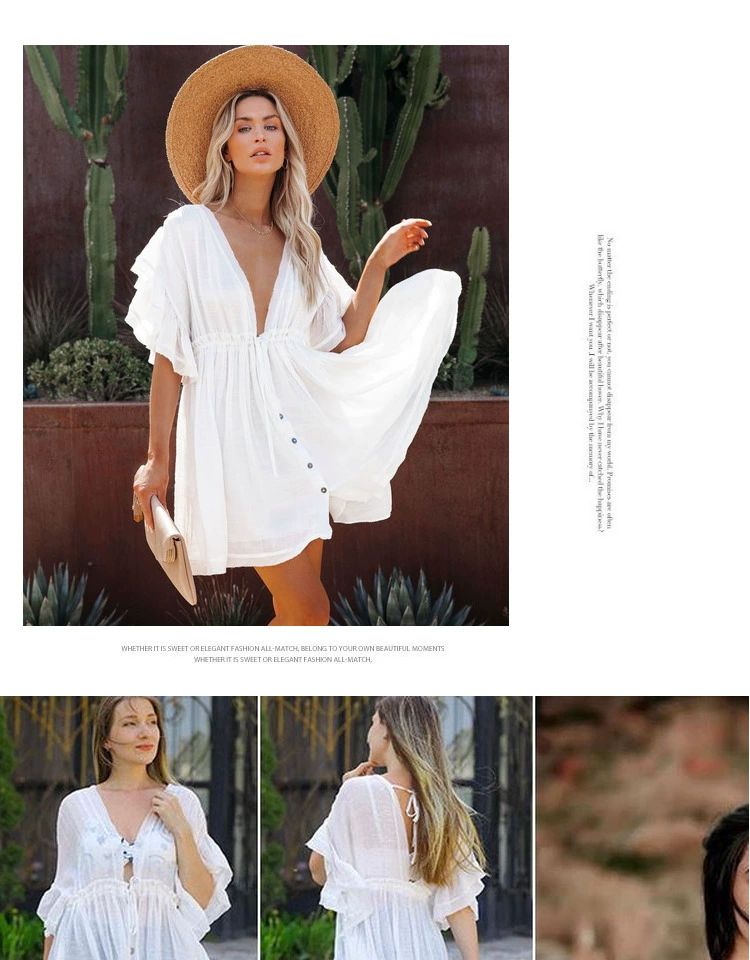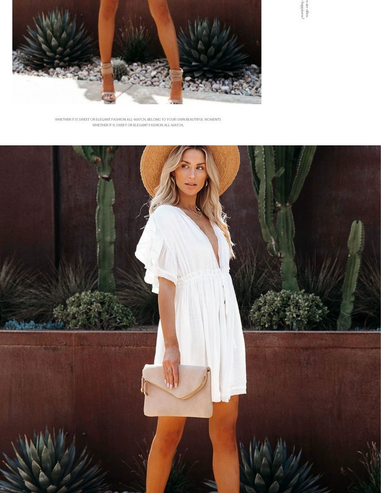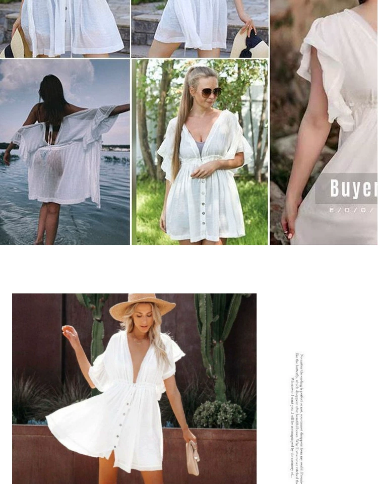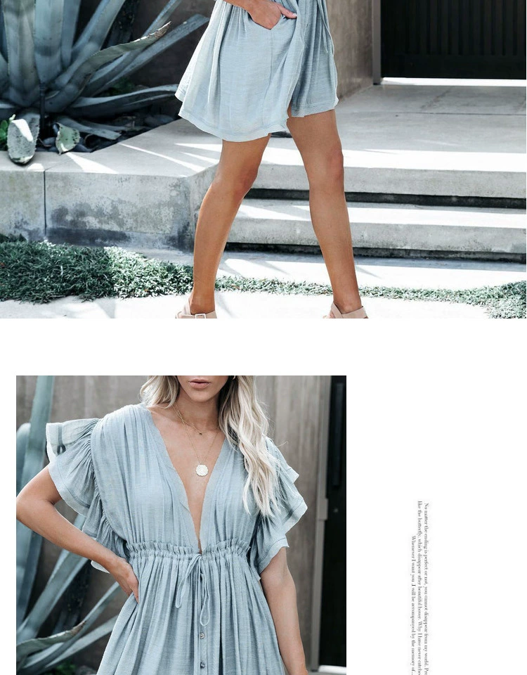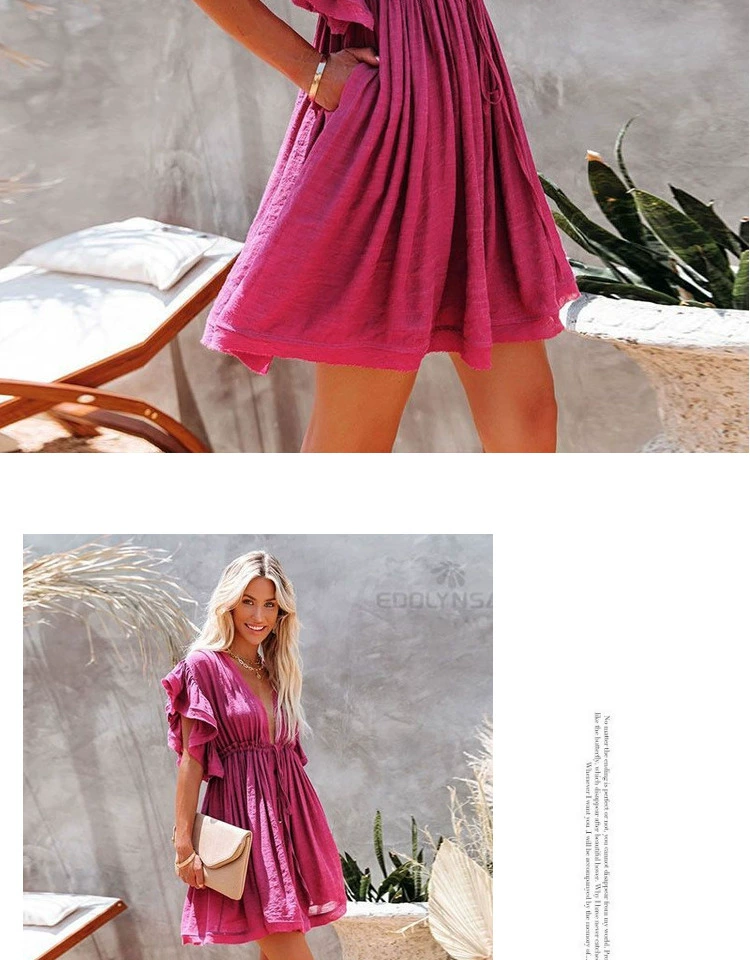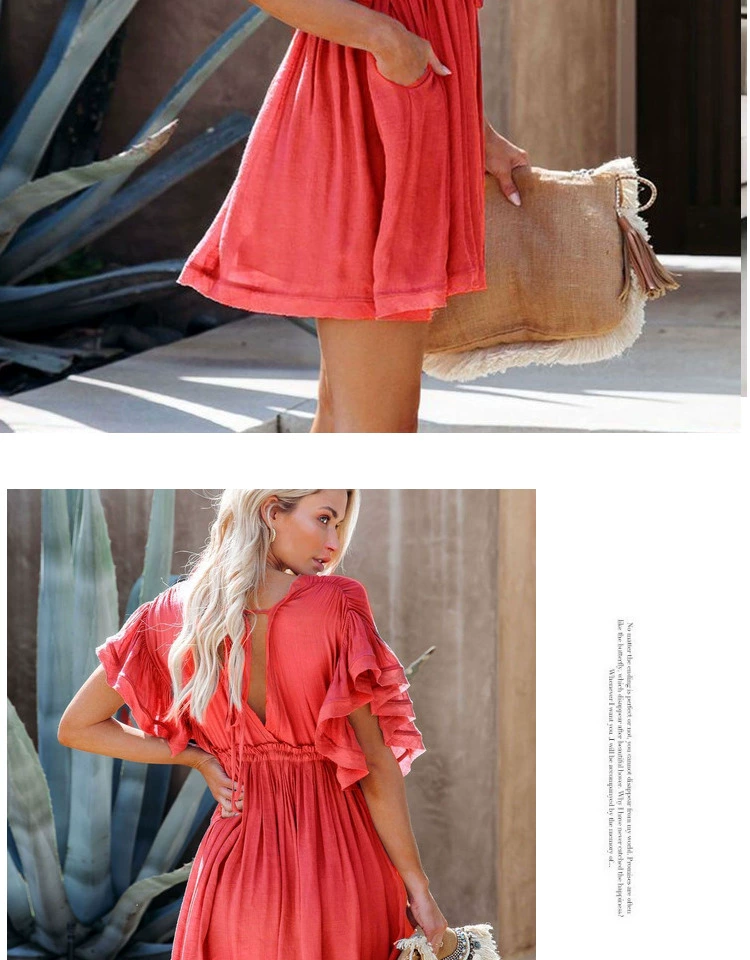 Be the first to review “Sexy deep V half-breasted slightly see-through beach dress with waist tie and backless short-sleeved beach dress”