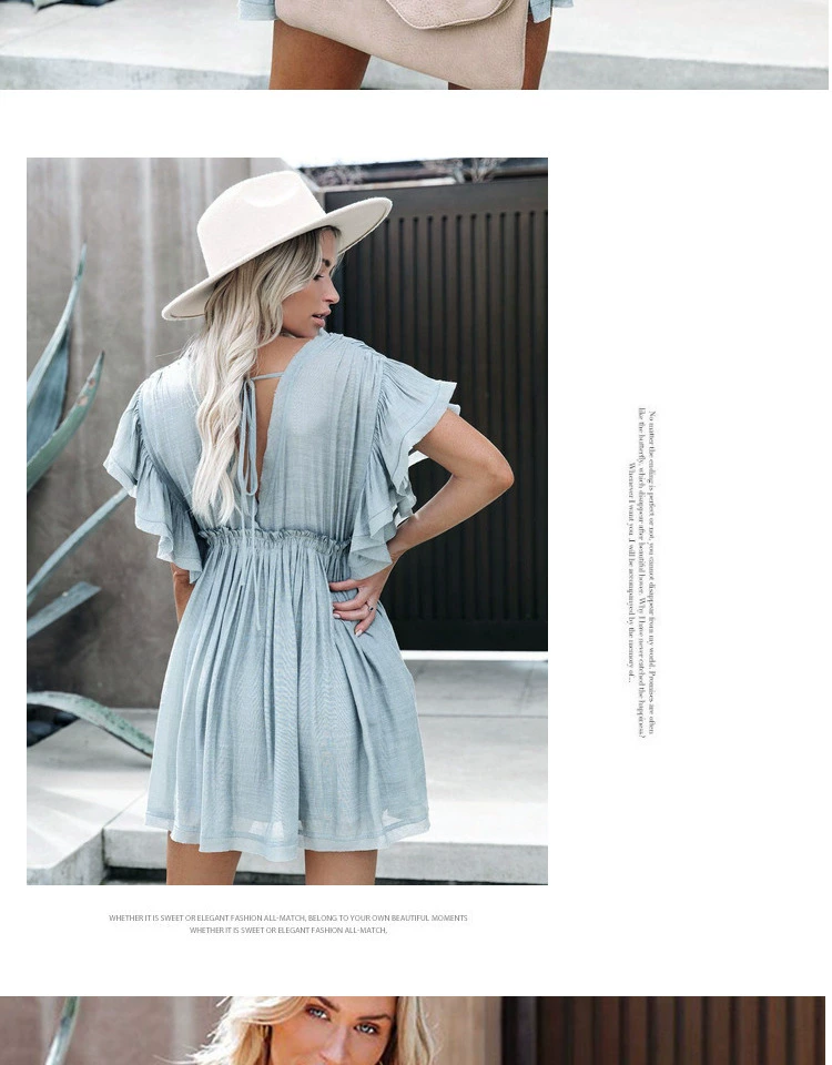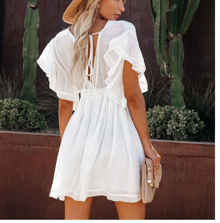 Sexy deep V half-breasted slightly see-through beach dress with waist tie and backless short-sleeved beach dress