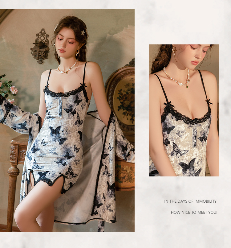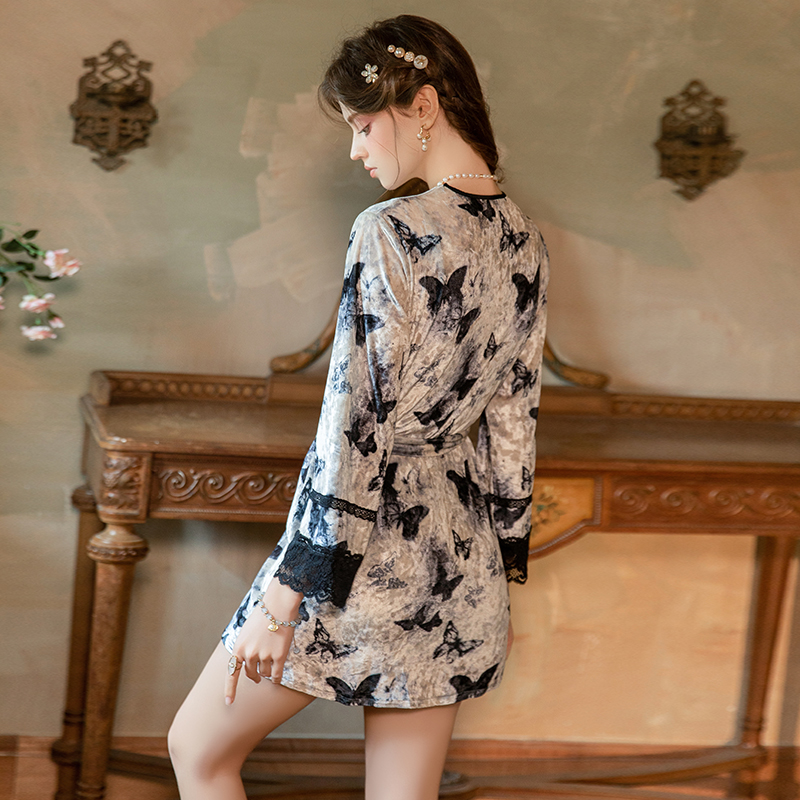 Sexy Low-Cut Button Decoration Lace Splicing Pure Desire Slit Velvet Printed Lingerie