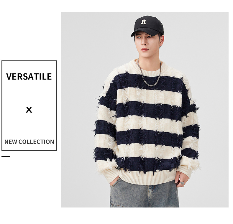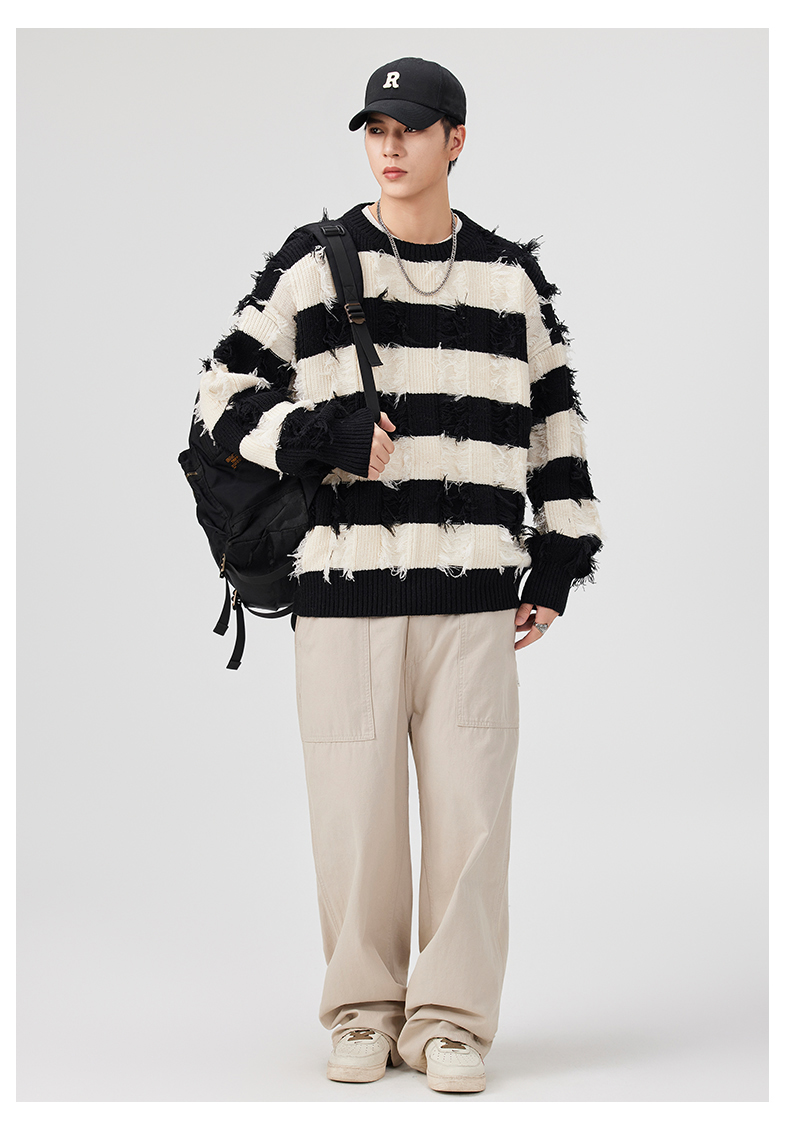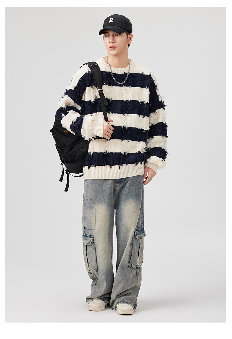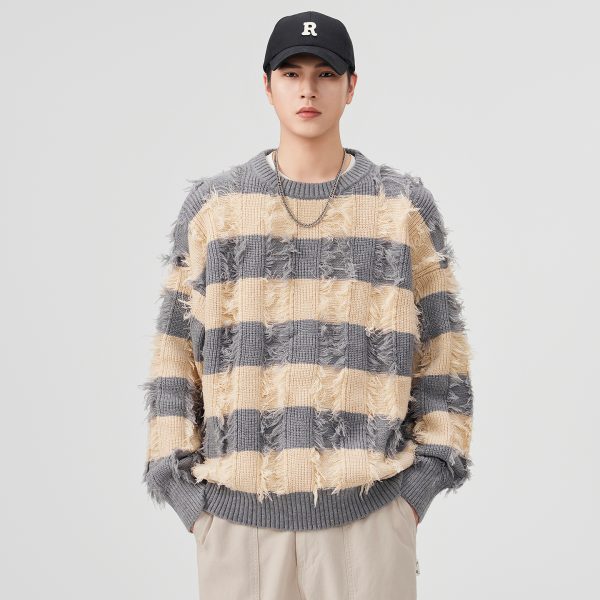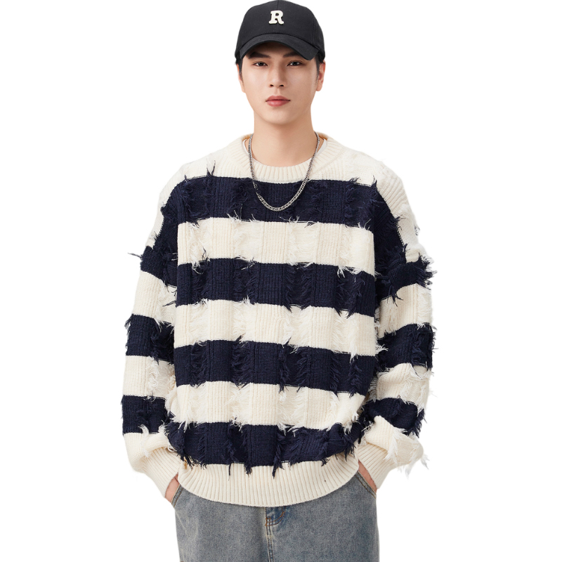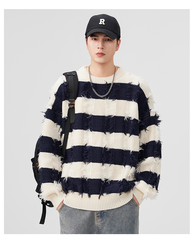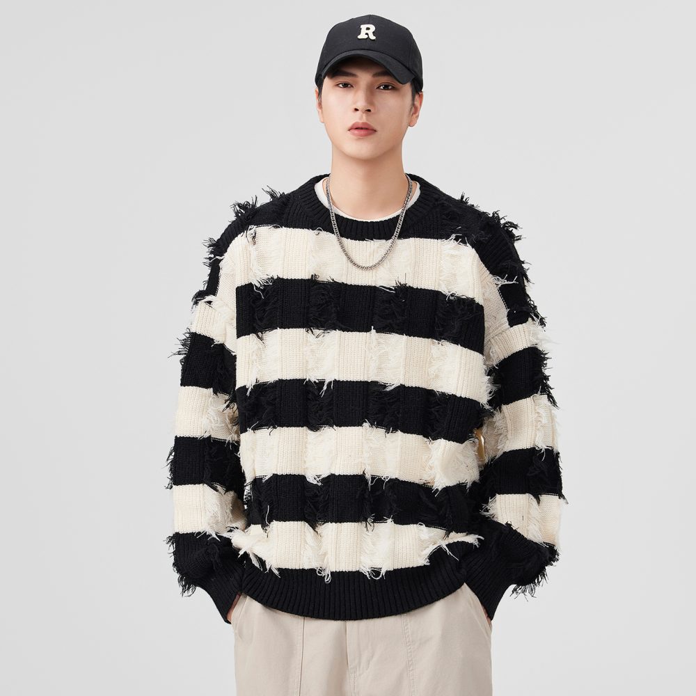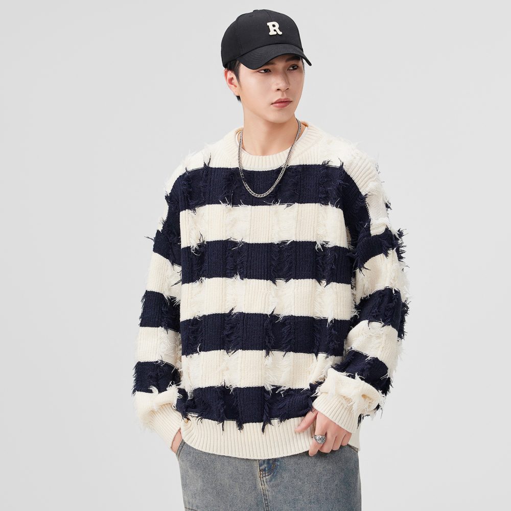 Torn Stripes Thickened Sweater Men’s Loose Fit Versatile Laziness Wind Knit Sweater