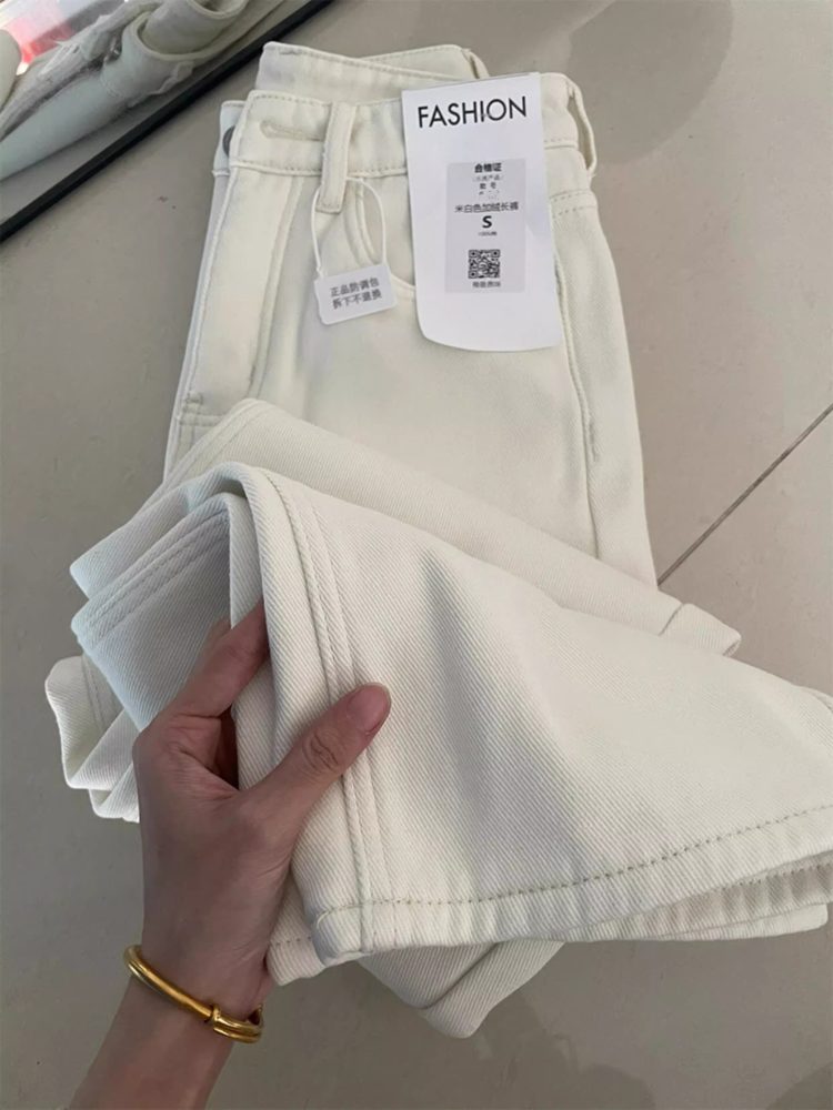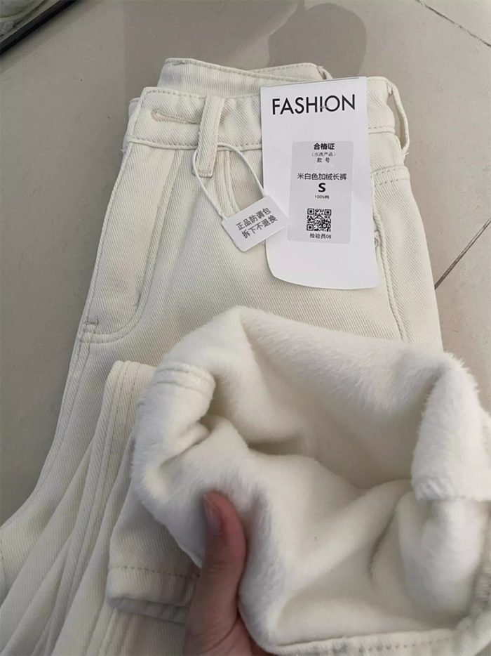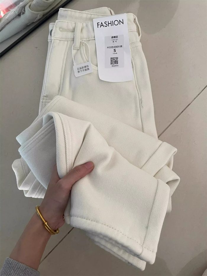 White Loose Fit Straight Leg Fleece-Lined Jeans Vintage High Waist Casual Narrow Edition