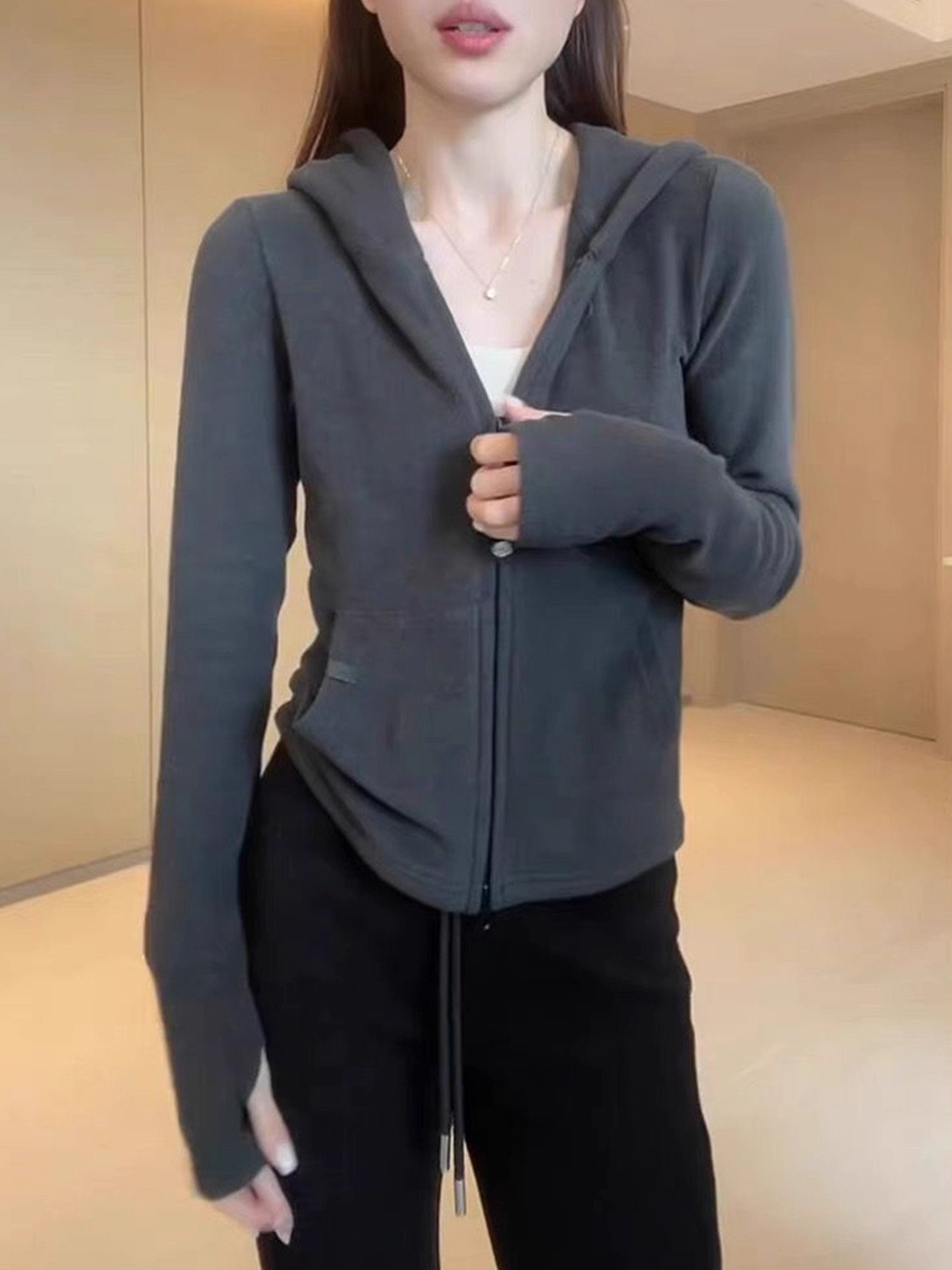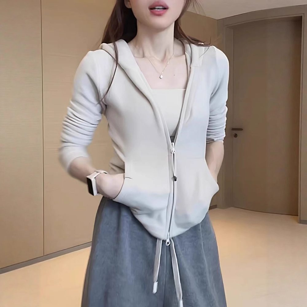 Zipper Hooded sweatshirt Slim fit Versatile Coat Double-sided De Velvet Top